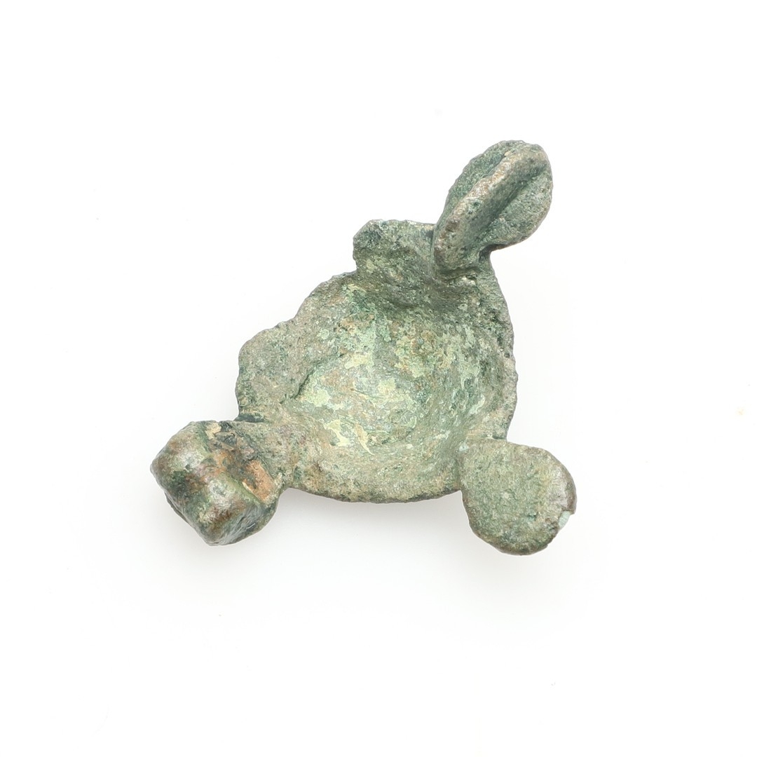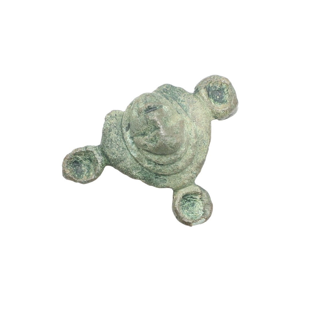 A ROMAN LOZENGE SHAPED BROOCH WITH CENTRAL FACE. A Roman lozenge-shaped plate brooch, c.2nd-3rd century AD, with a central Celticised human facing-mask. 32mm wide. For a similar example see Identifying Metal Artefacts by Brian Read, page 189-190, number 990.