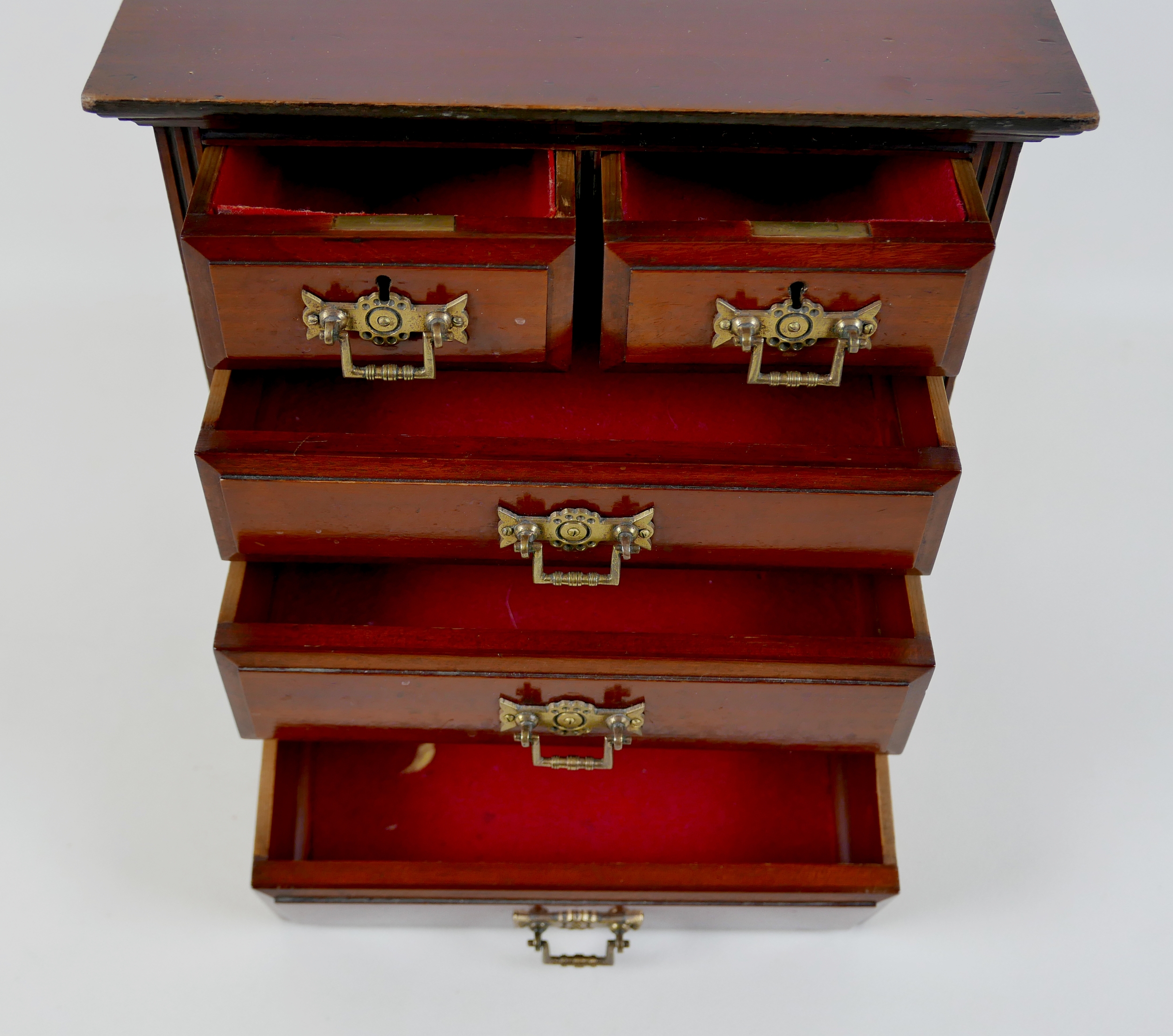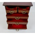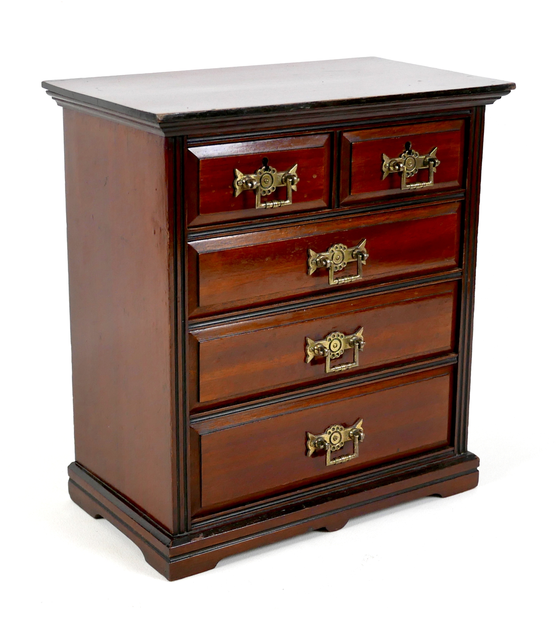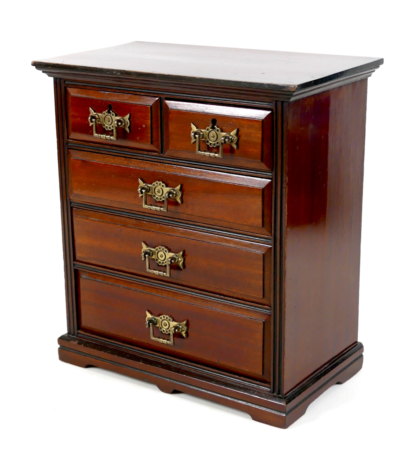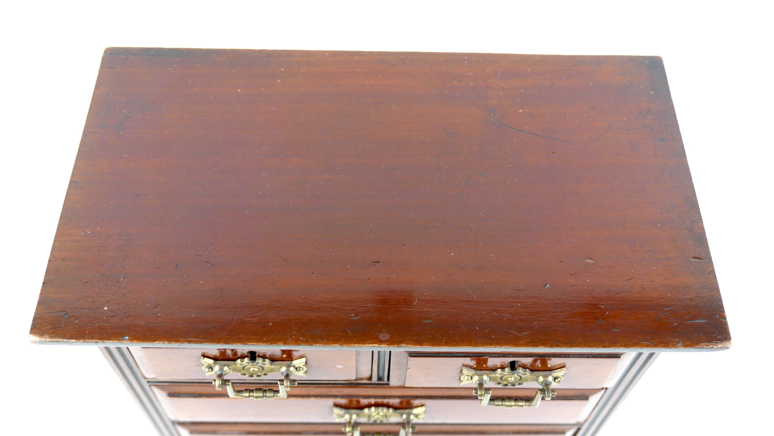 A miniature Edwardian chest of drawers, brass handles, 32 by 18 by 34.5cm high.