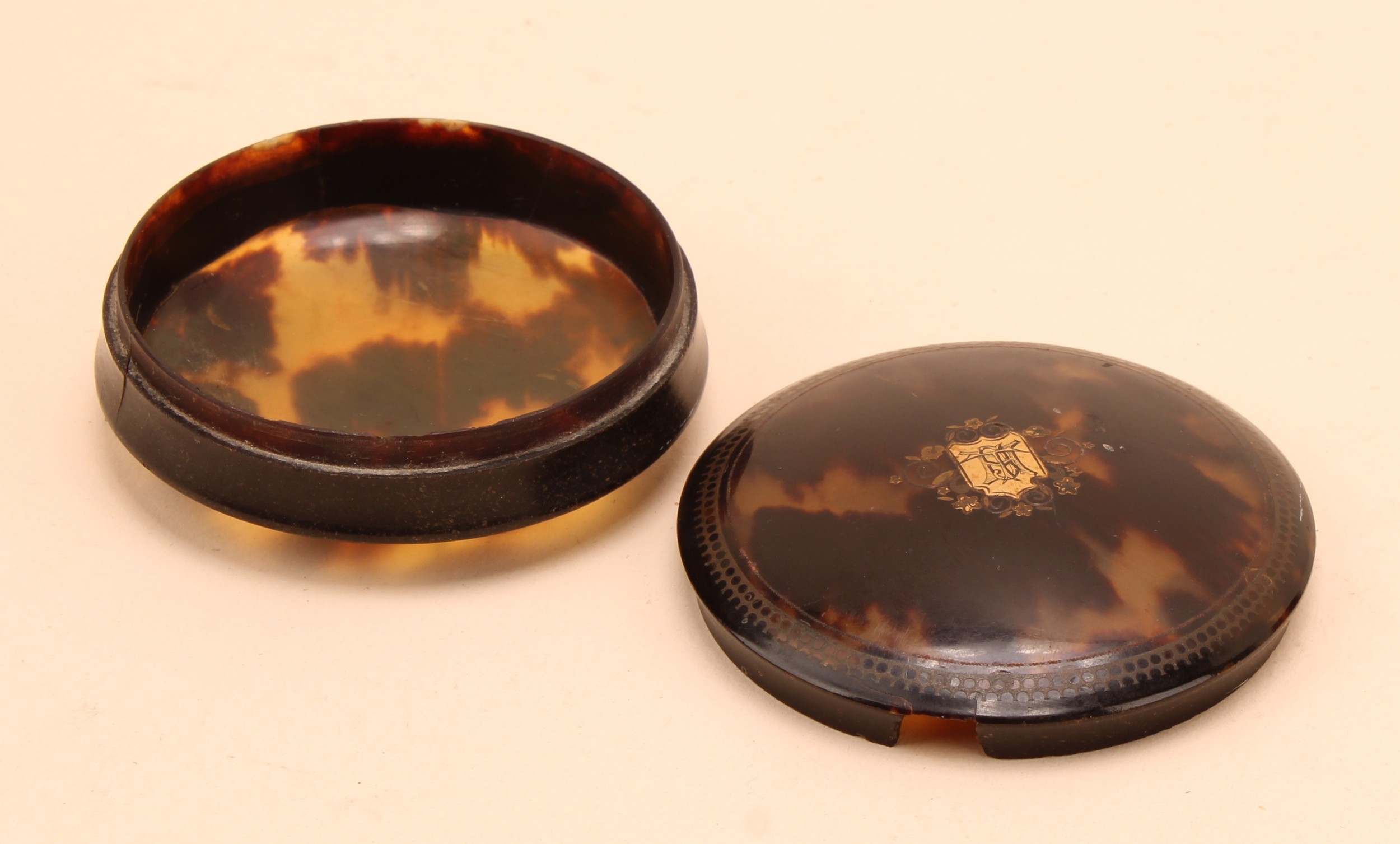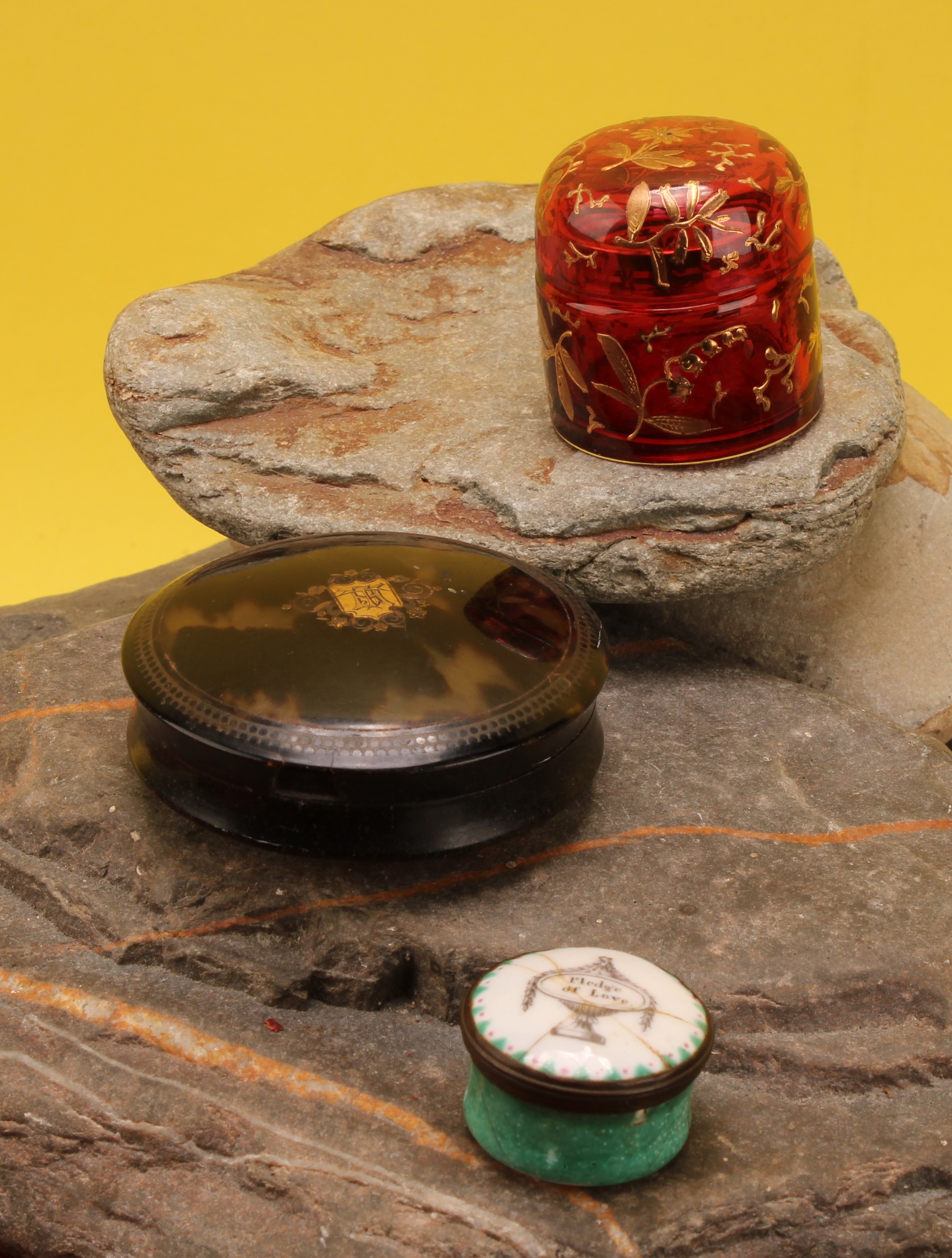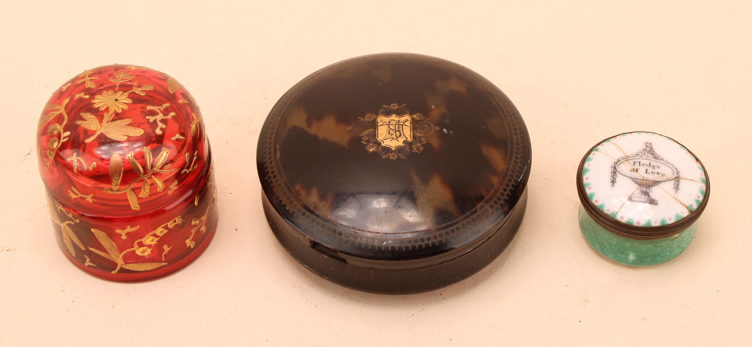 A George III tortoise shell circular box and cover, inlaid with a central gold shield shaped cartouche, monogrammed, 6.5cm diameter, c.1800; a Bilston type enamel patch pot, 'Pledge of Love', 3cm diameter; a Victorian cranberry glass patch pot and cover, applied in relief with gilt trailing flowers, 4cm high (3)