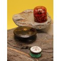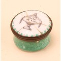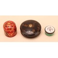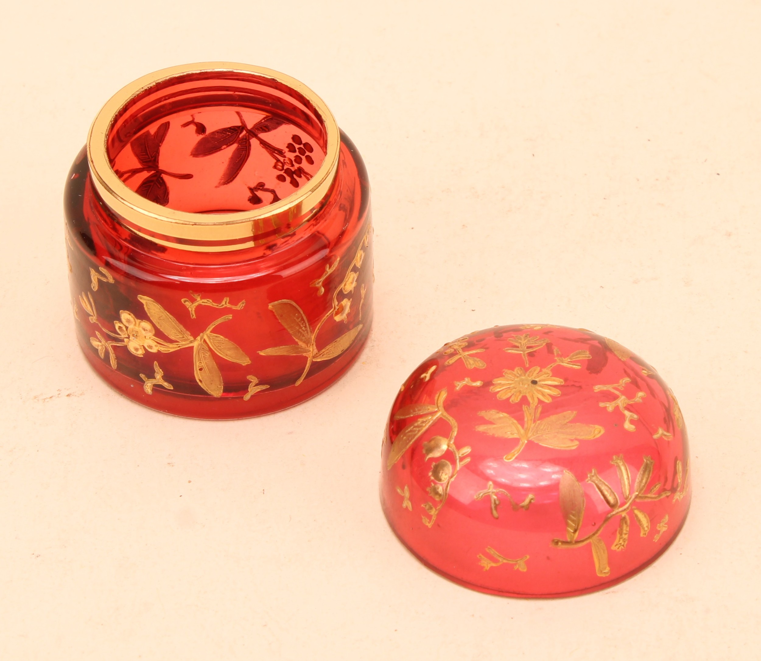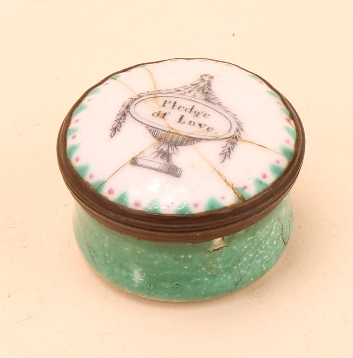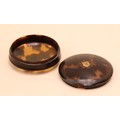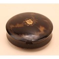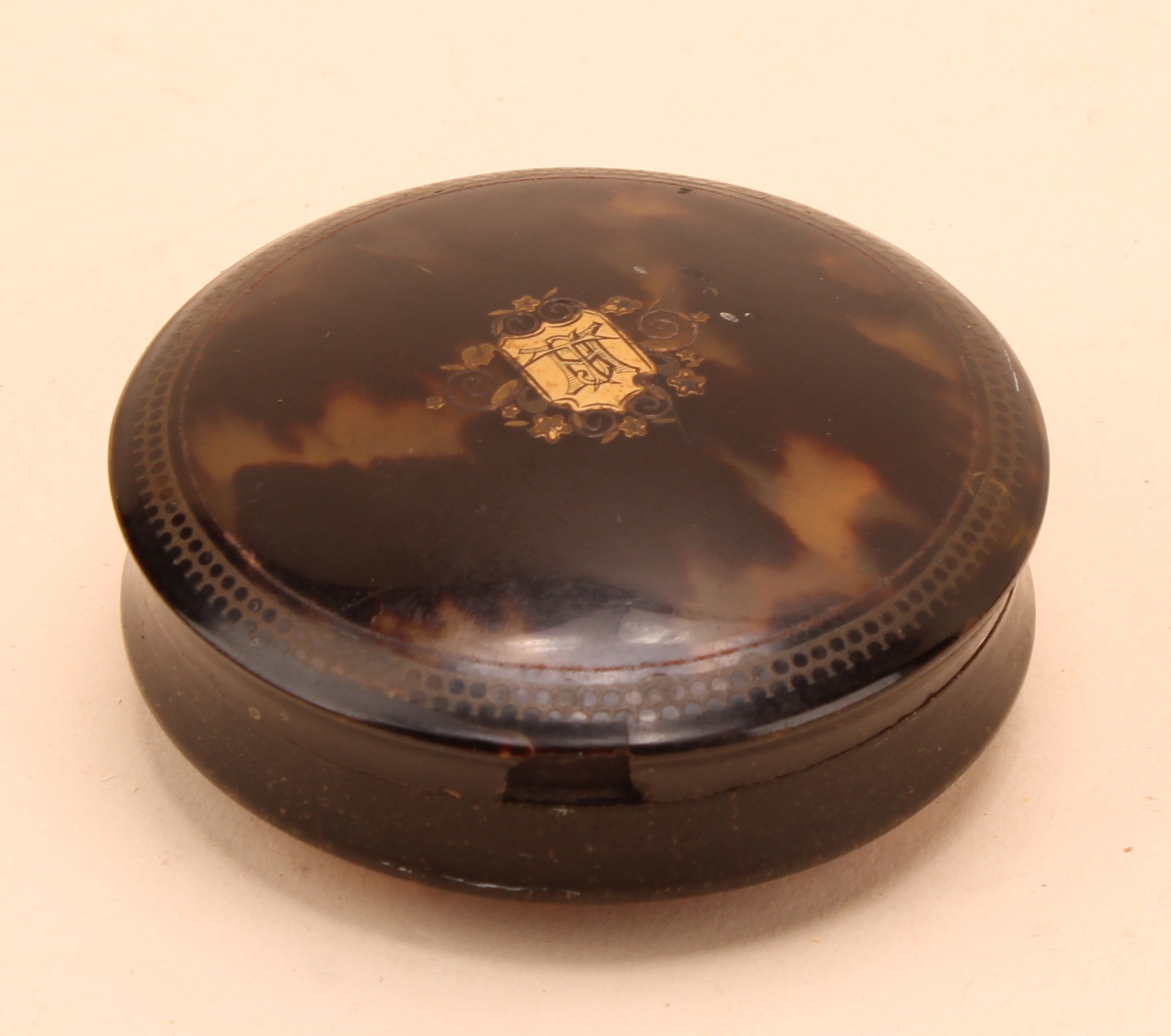 A George III tortoise shell circular box and cover, inlaid with a central gold shield shaped cartouche, monogrammed, 6.5cm diameter, c.1800; a Bilston type enamel patch pot, 'Pledge of Love', 3cm diameter; a Victorian cranberry glass patch pot and cover, applied in relief with gilt trailing flowers, 4cm high (3)
