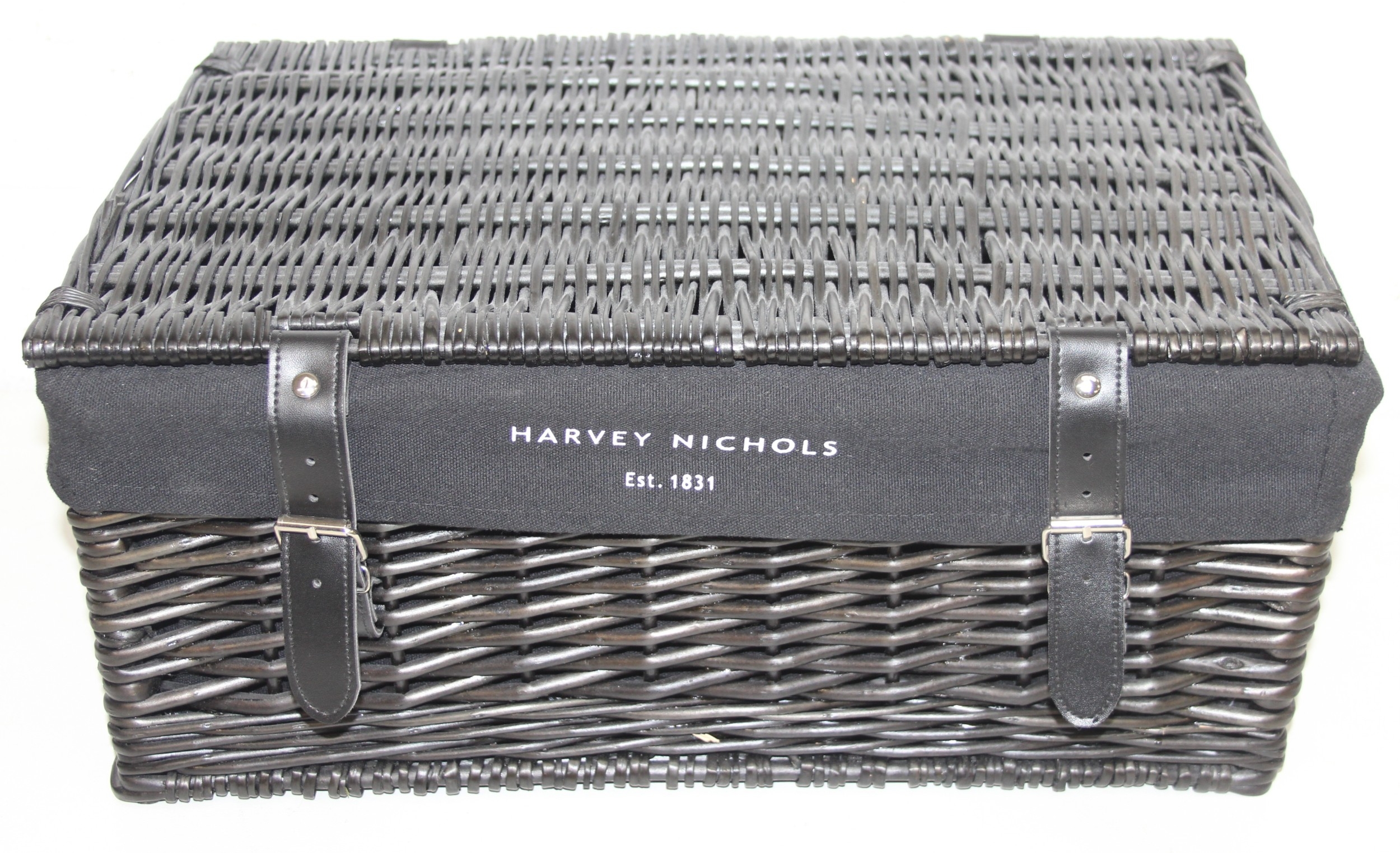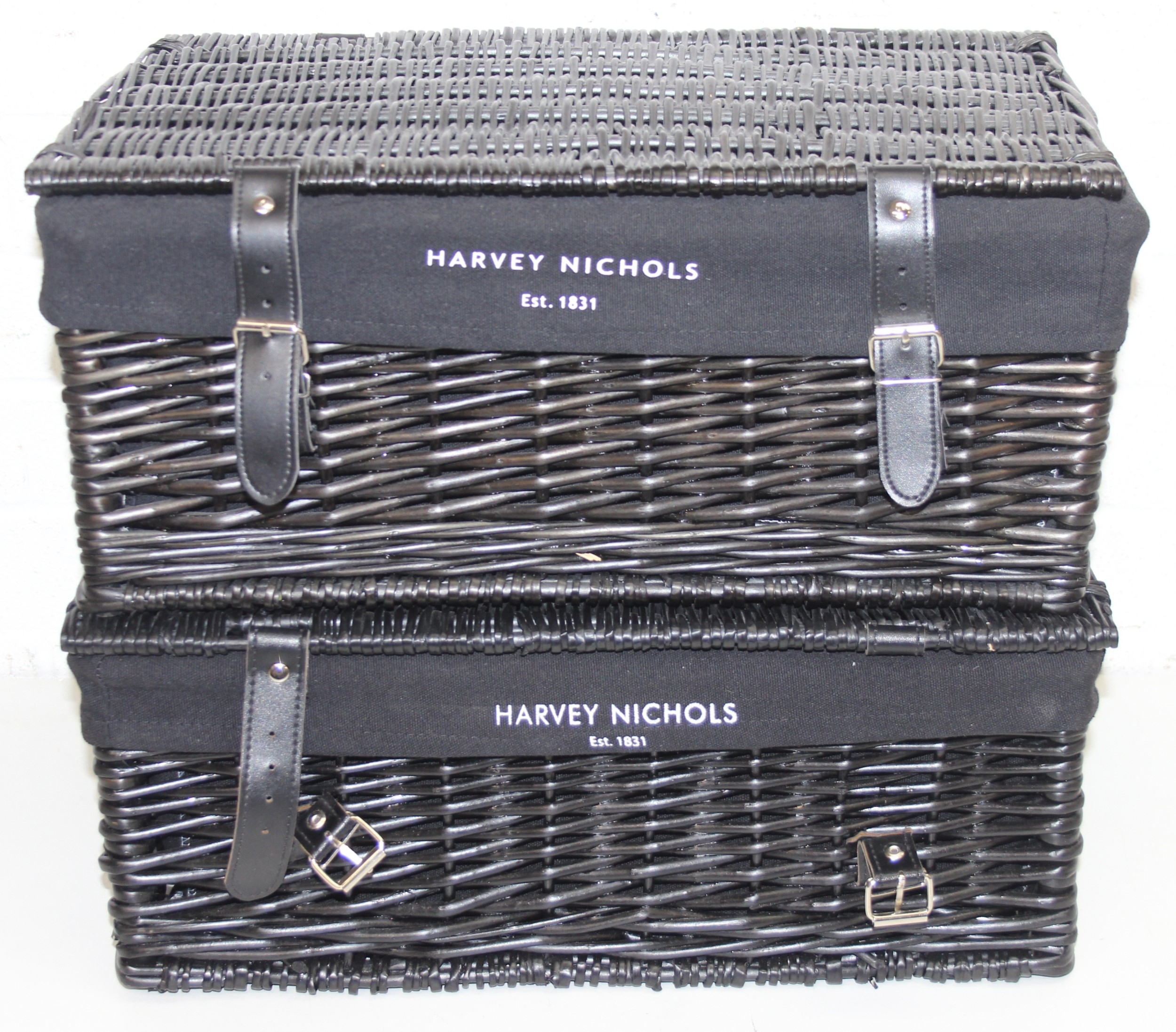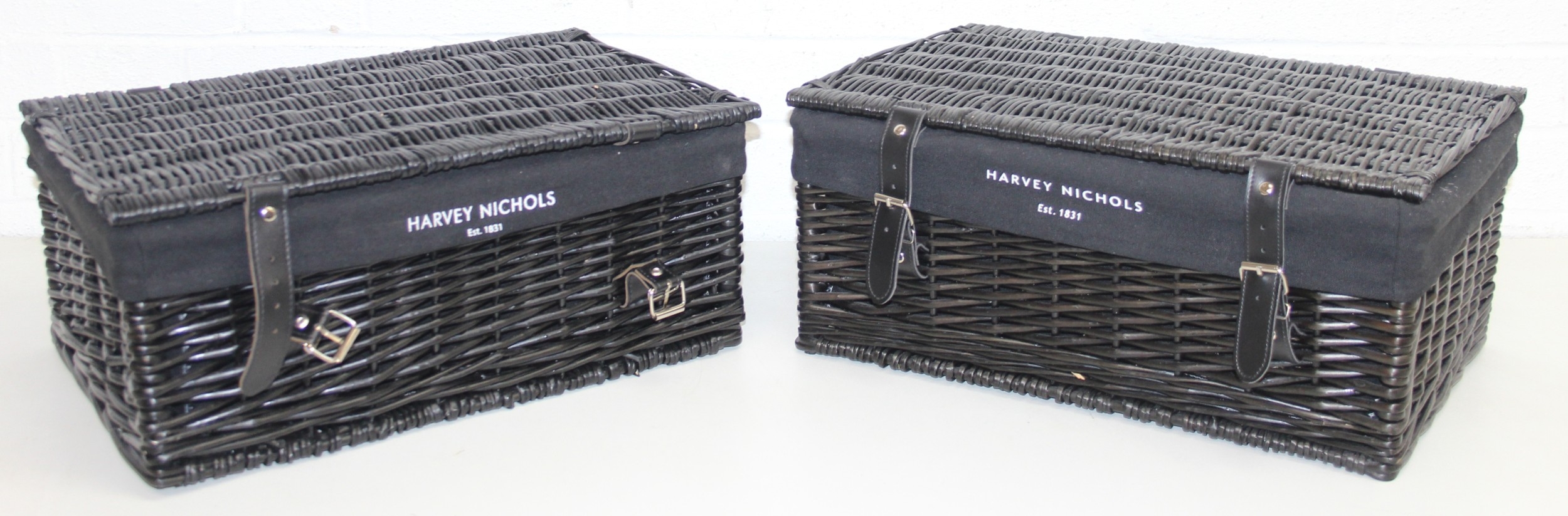 Two black Harvey Nichols hamper baskets with buckled straps and canvas lining, 44cm x 32cm x 20cm [2]