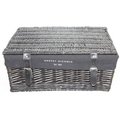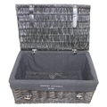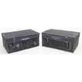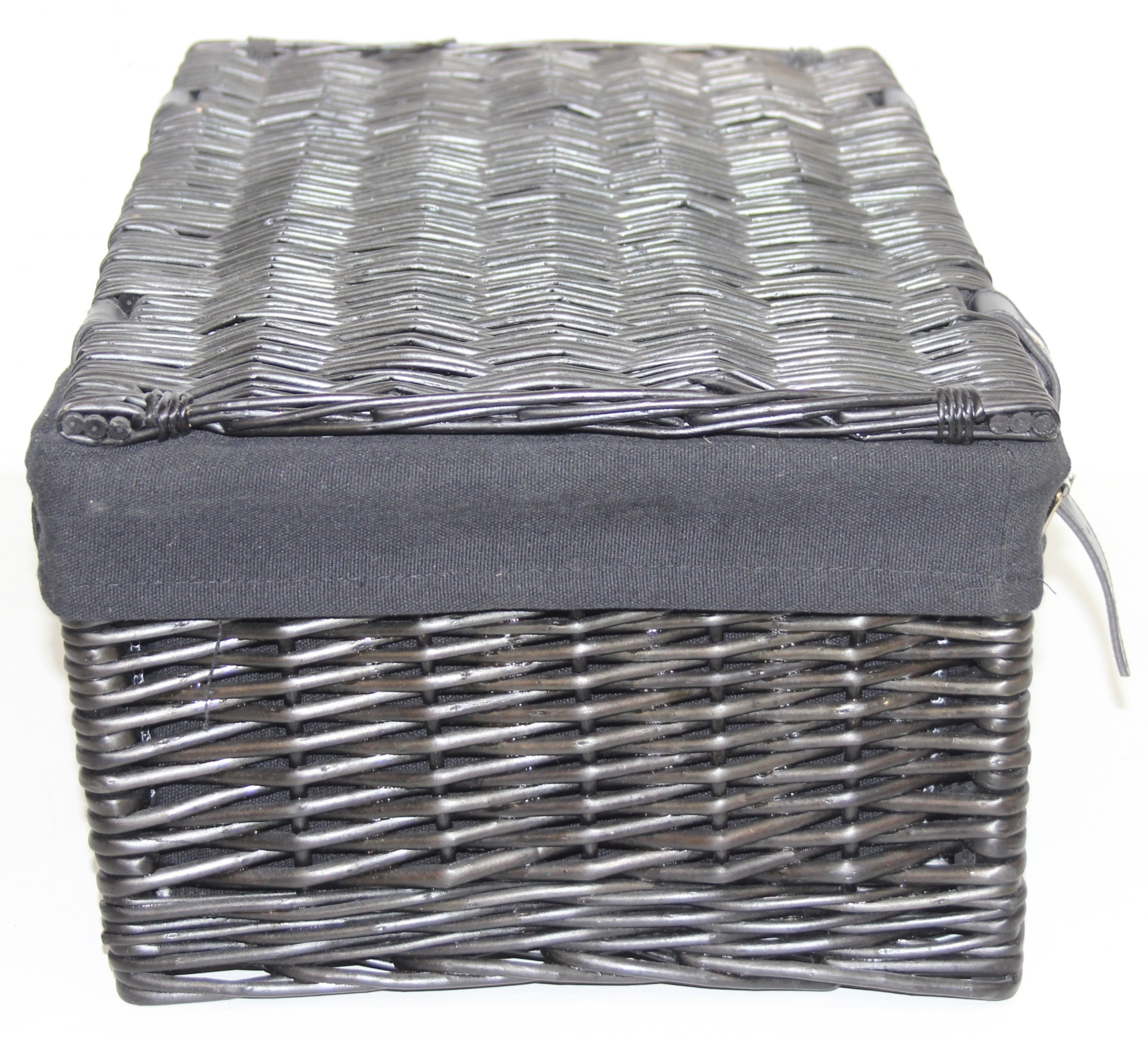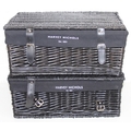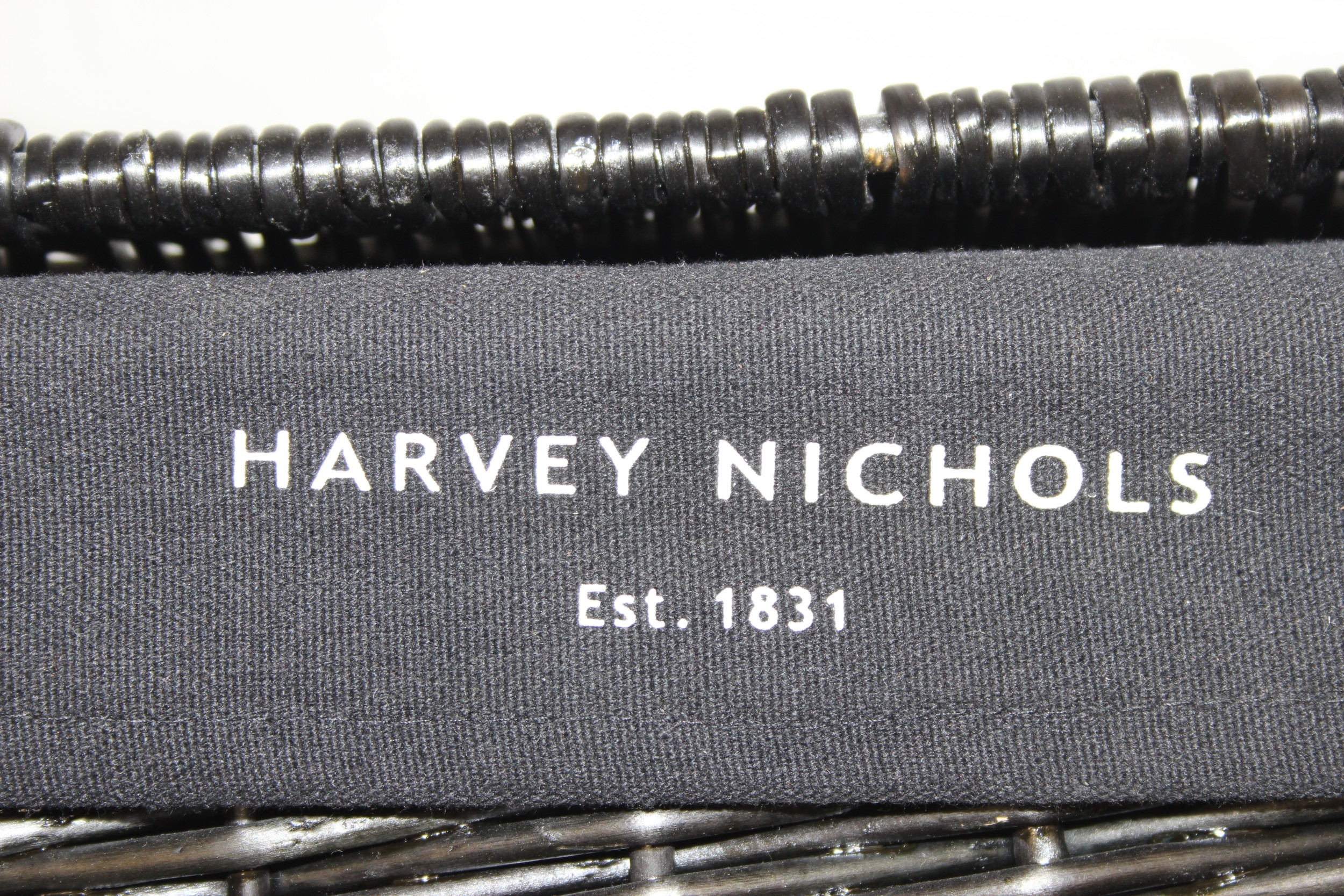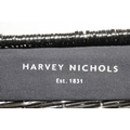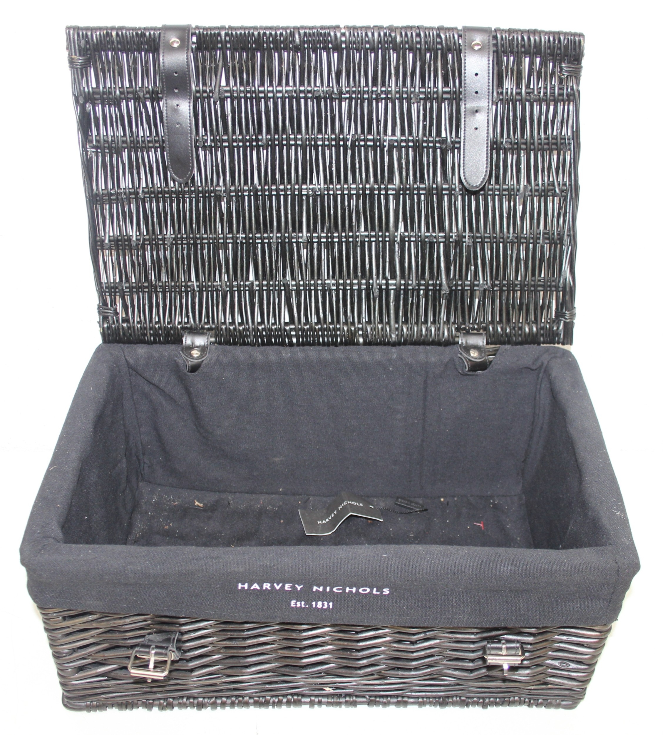 Two black Harvey Nichols hamper baskets with buckled straps and canvas lining, 44cm x 32cm x 20cm [2]