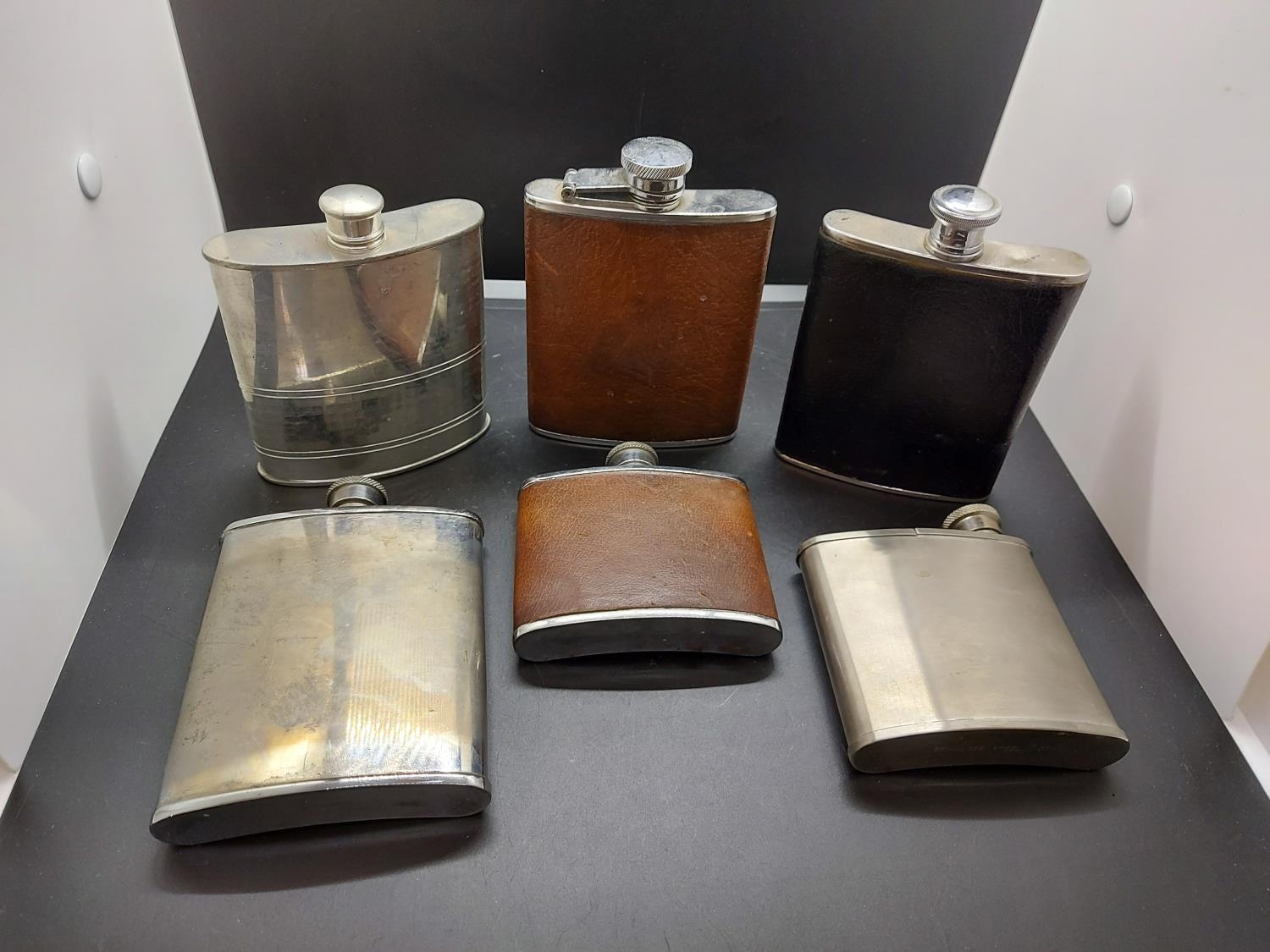 Six vintage hip flasks to include one Montana Calf, one Selwin pewter, one stainless steel 2oz, one stainless steel 6oz etc.