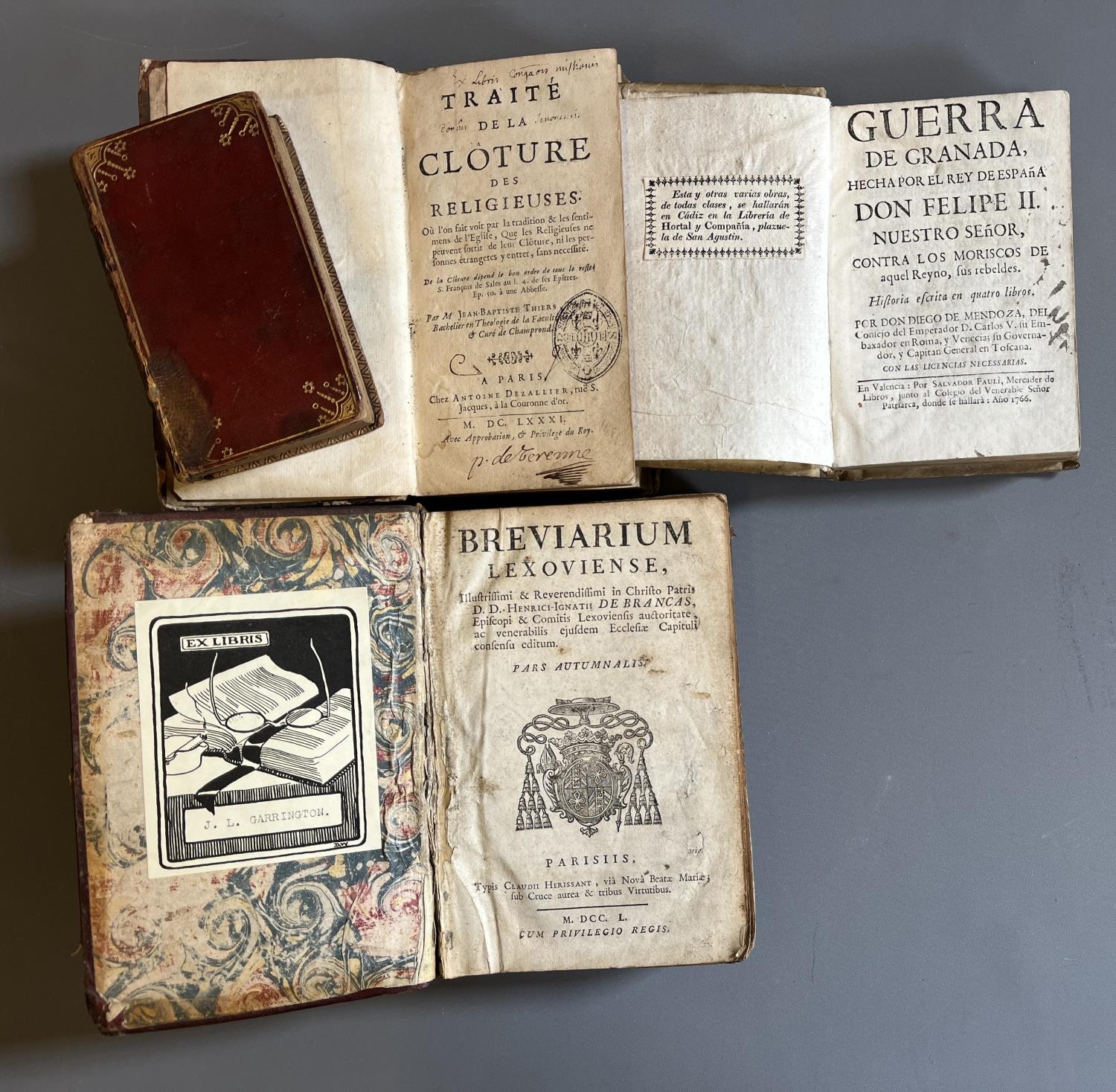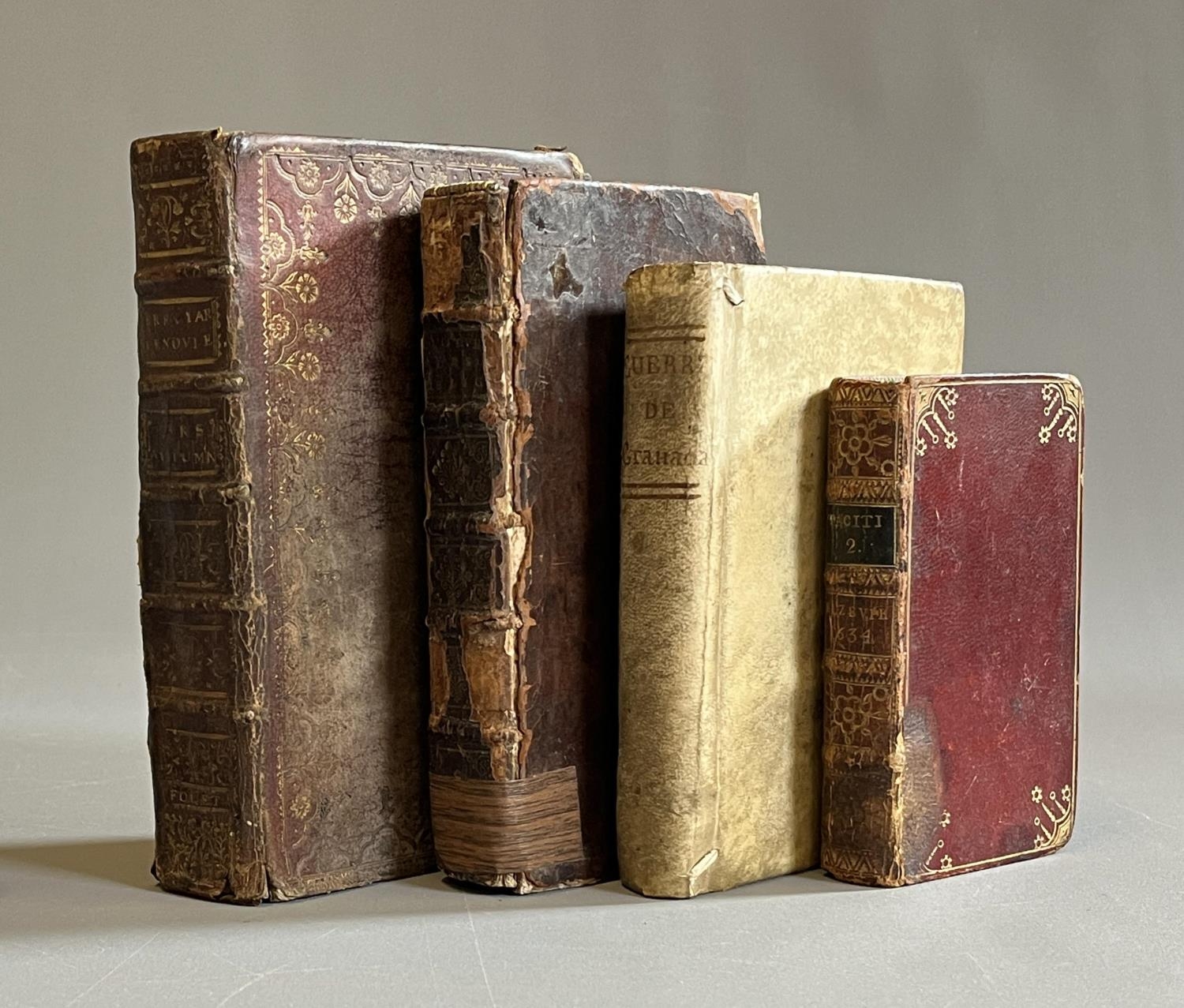 BREVIARUM LEXOVIENSE, Paris, 1750, Herissant, worn red morocco WITH Elzevir Tacitus; Traite de la Cloture Religieuses, 1681 & Guerra de Granada, 1766, parchment binding. All worn and sold WAF (4) (Est. plus 20% premium)