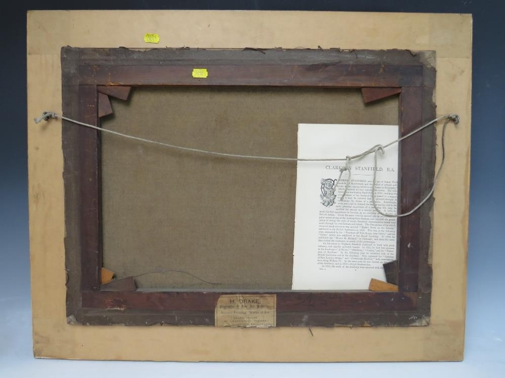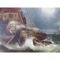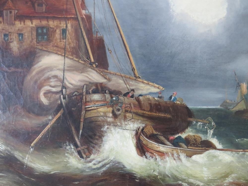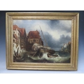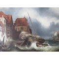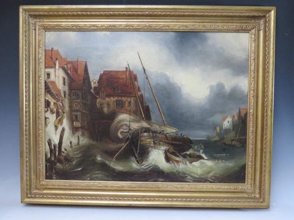 ATTRIBUTED TO CLARKSON FREDERICK STANFIELD (1793-1867). A stormy Continental coastal town scene with figures and fishing vessels in a heavy swell, unsigned, oil on canvas, framed, 43 x 59 cm