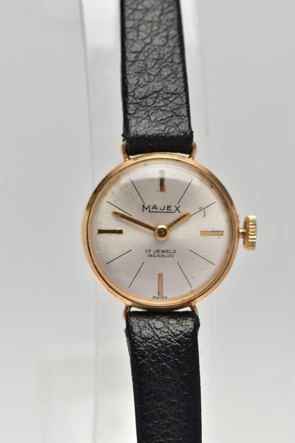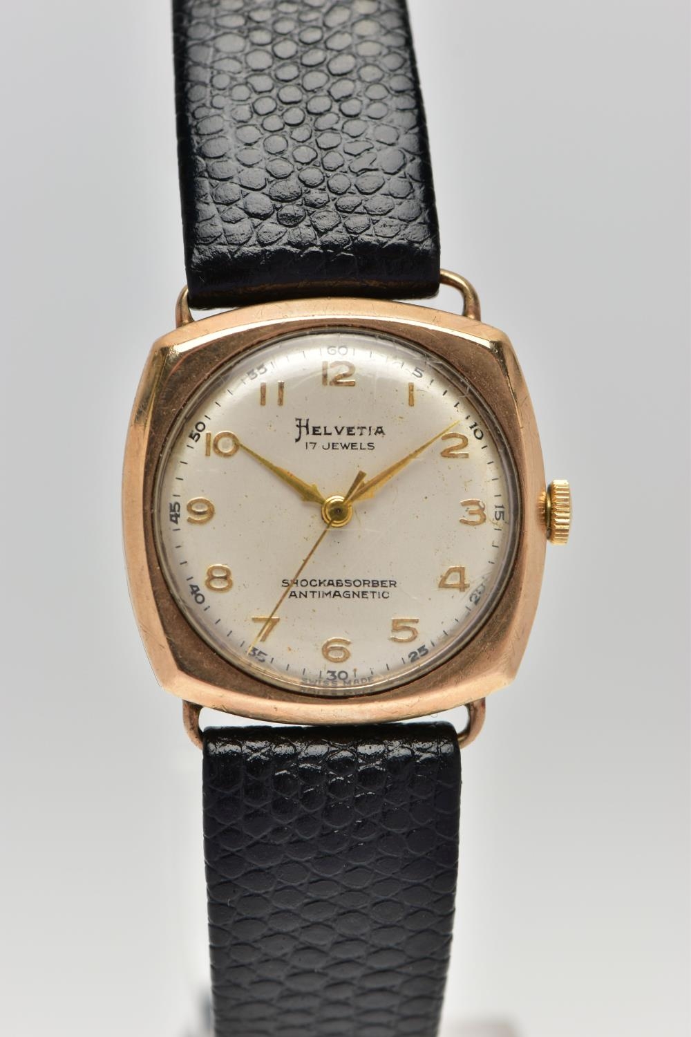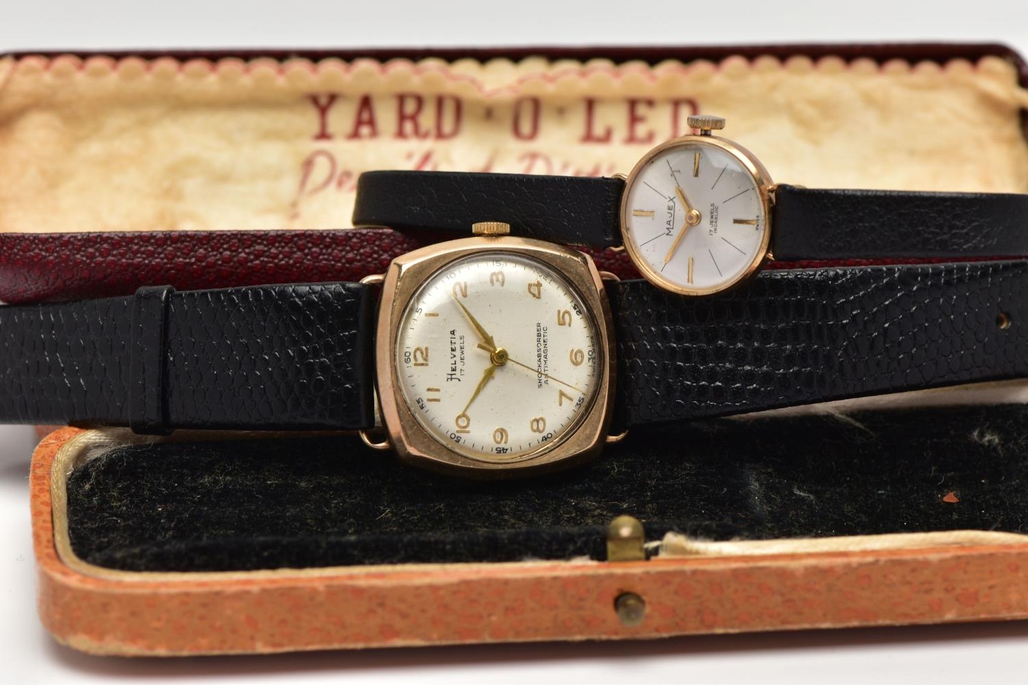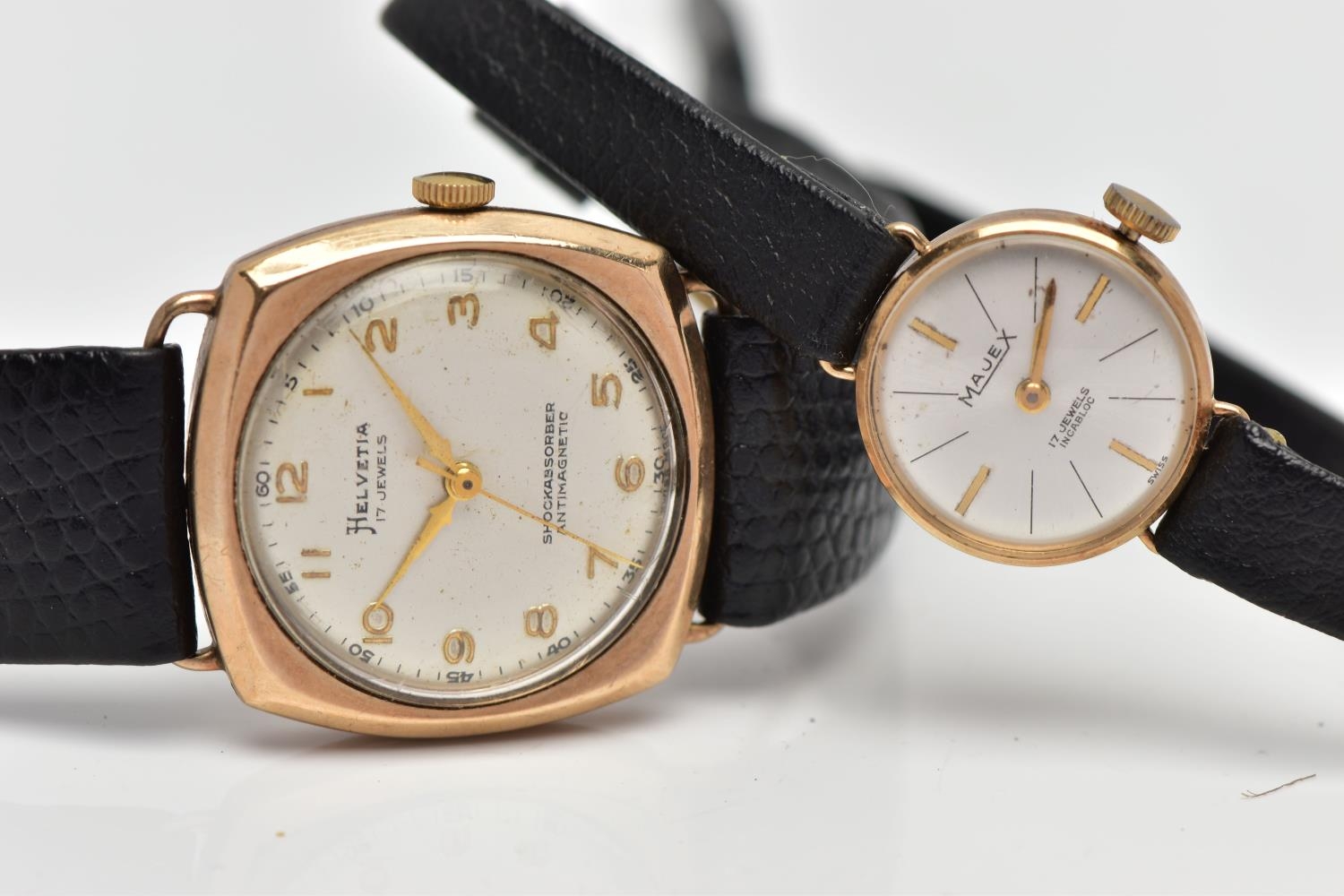 TWO GOLD CASED WRISTWATCHES, the first a gents 'Helvetia' hand wound movement, round silver dial signed 'Helvetia, shock absorber antimagnetic', Arabic numerals, gold hands, within a polished case, inside case back hallmarked 9ct London 1952, 97810', movement signed 'Helvetia Watch Co, seventeen jewels, Swiss 830', approximate case width 28.9mm, fitted with a black snake skin effect strap and a yellow metal ardillon buckle, together with a ladies 'Majex' hand wound wristwatch, round silver dial signed 'Majex', baton markers, gold tone hands, polished case, inside case back hallmarked 9ct Edinburgh 1968, B.W.C London made, 82162', movement stamped '17 jewels Swiss', approximate case width 19.0mm, fitted with a black strap and yellow metal ardillon buckle (condition report: both watches working at time of cataloguing, although time keeping is untested, the gents Helvetia has some small dinks to the side of the case, some light scratches to the glass, general light wear to the straps)