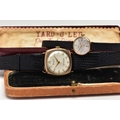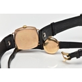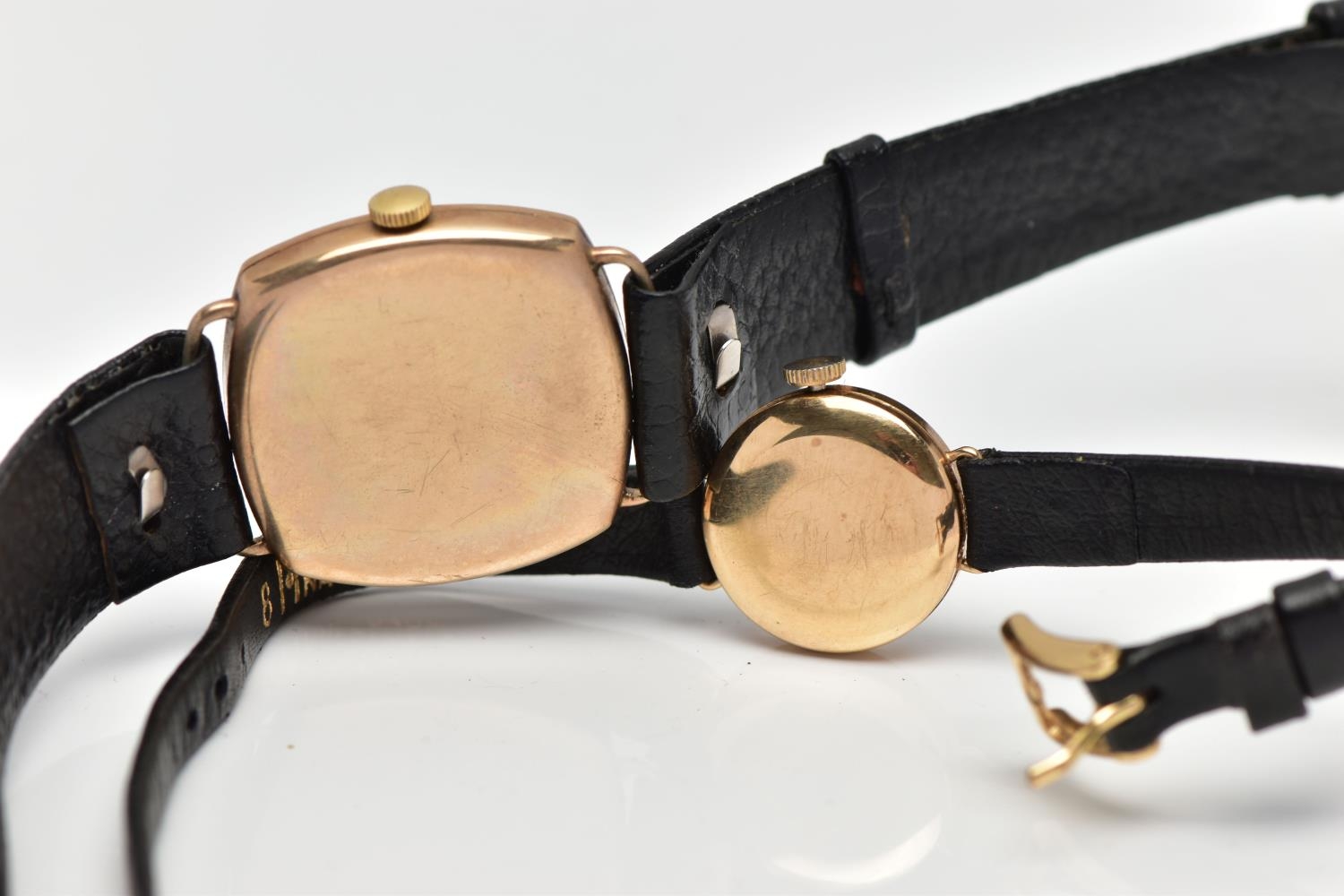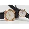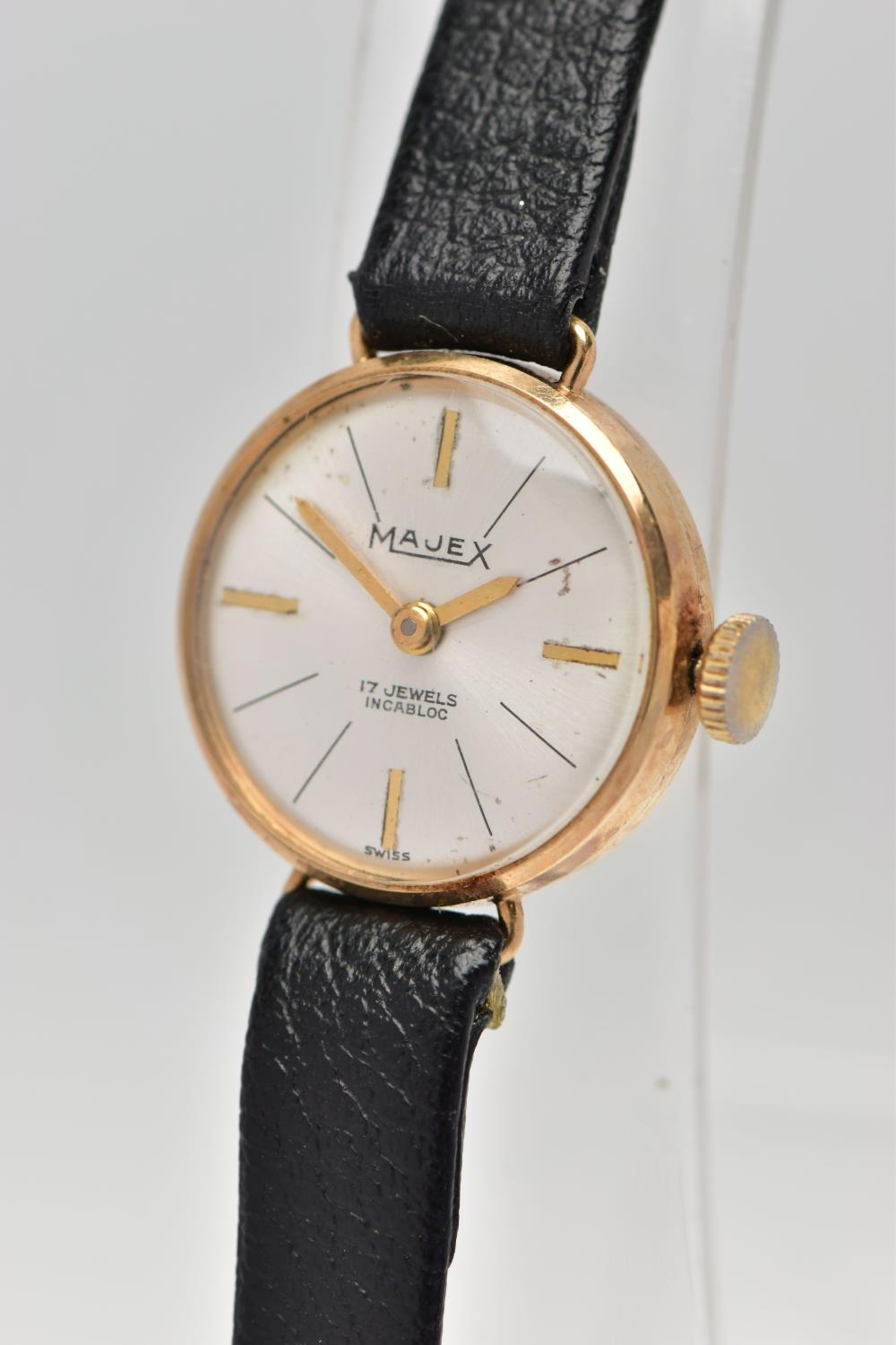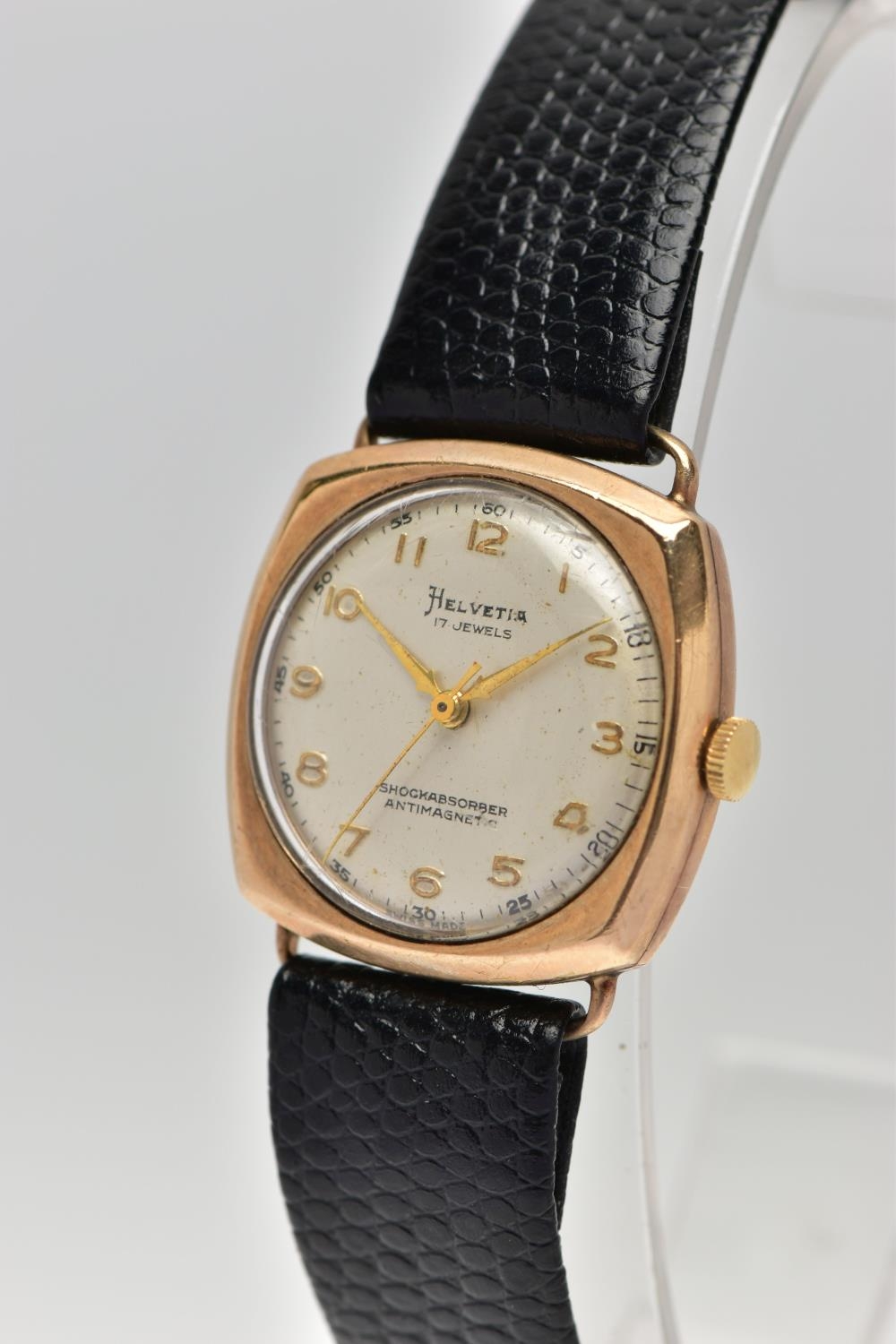 TWO GOLD CASED WRISTWATCHES, the first a gents 'Helvetia' hand wound movement, round silver dial signed 'Helvetia, shock absorber antimagnetic', Arabic numerals, gold hands, within a polished case, inside case back hallmarked 9ct London 1952, 97810', movement signed 'Helvetia Watch Co, seventeen jewels, Swiss 830', approximate case width 28.9mm, fitted with a black snake skin effect strap and a yellow metal ardillon buckle, together with a ladies 'Majex' hand wound wristwatch, round silver dial signed 'Majex', baton markers, gold tone hands, polished case, inside case back hallmarked 9ct Edinburgh 1968, B.W.C London made, 82162', movement stamped '17 jewels Swiss', approximate case width 19.0mm, fitted with a black strap and yellow metal ardillon buckle (condition report: both watches working at time of cataloguing, although time keeping is untested, the gents Helvetia has some small dinks to the side of the case, some light scratches to the glass, general light wear to the straps)