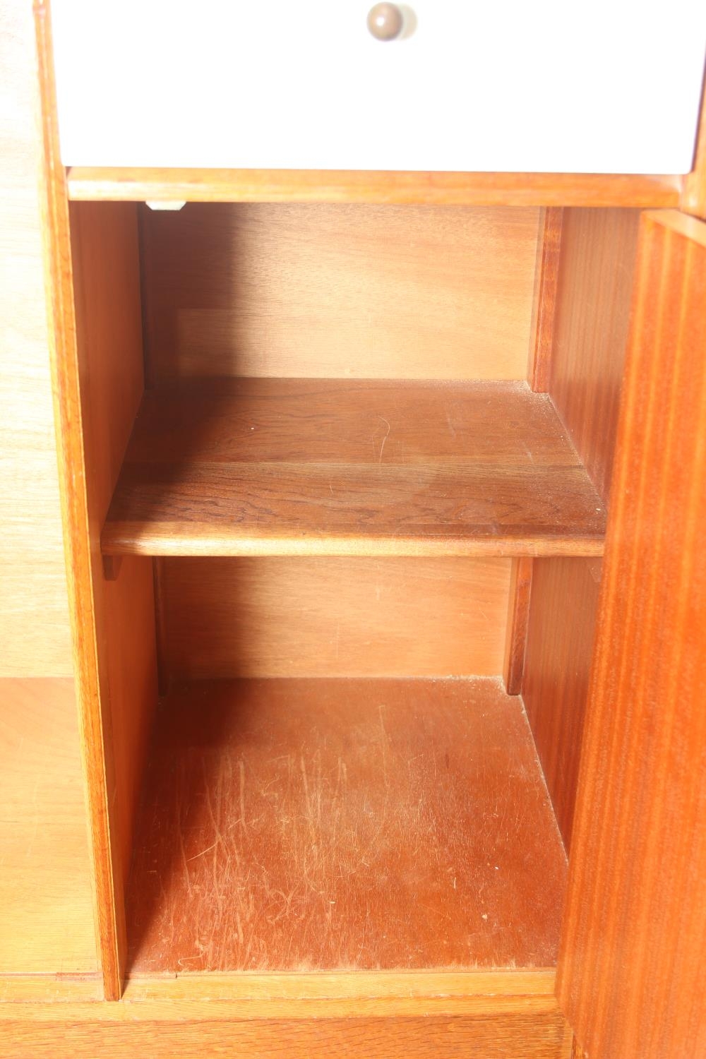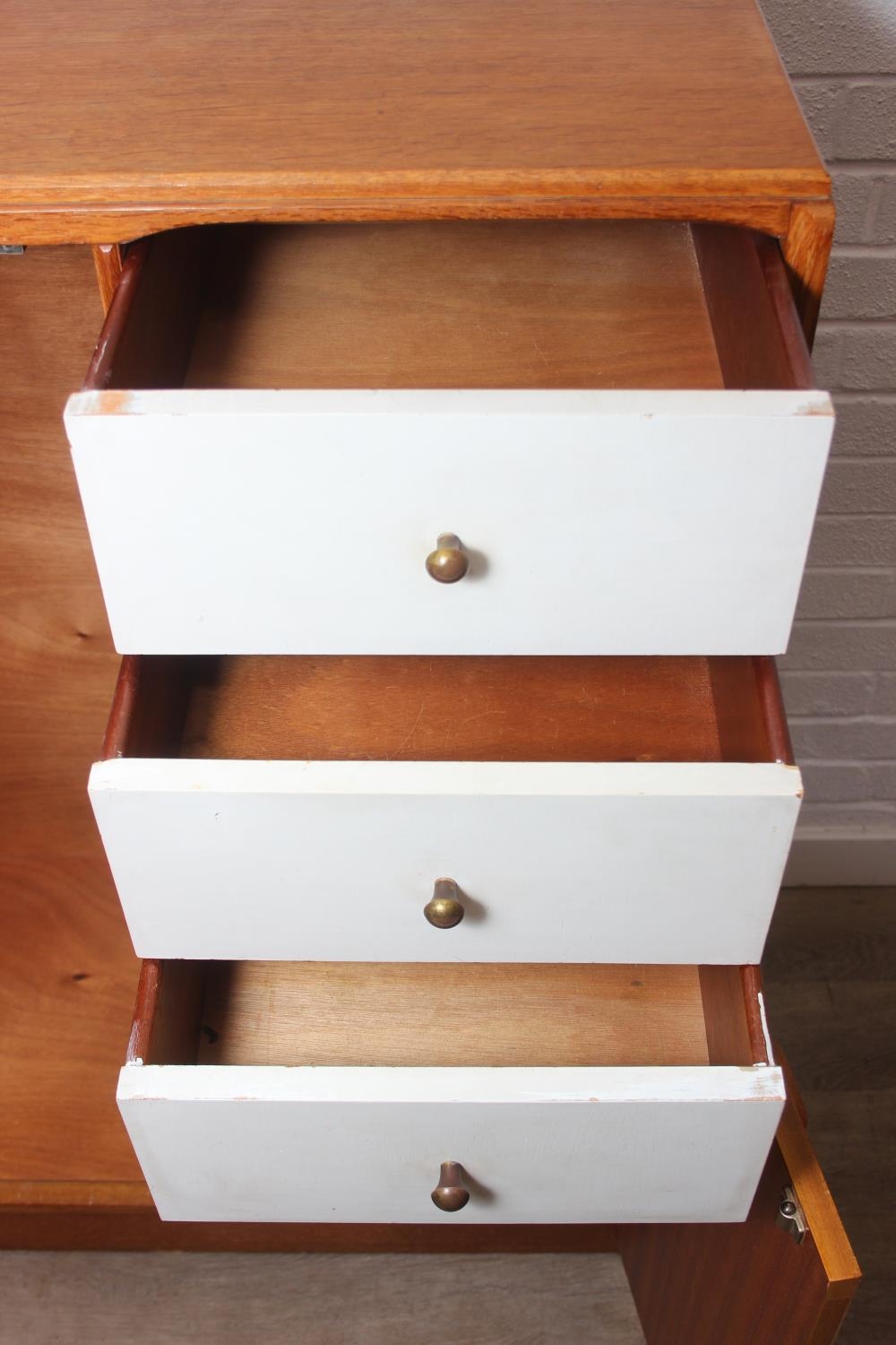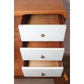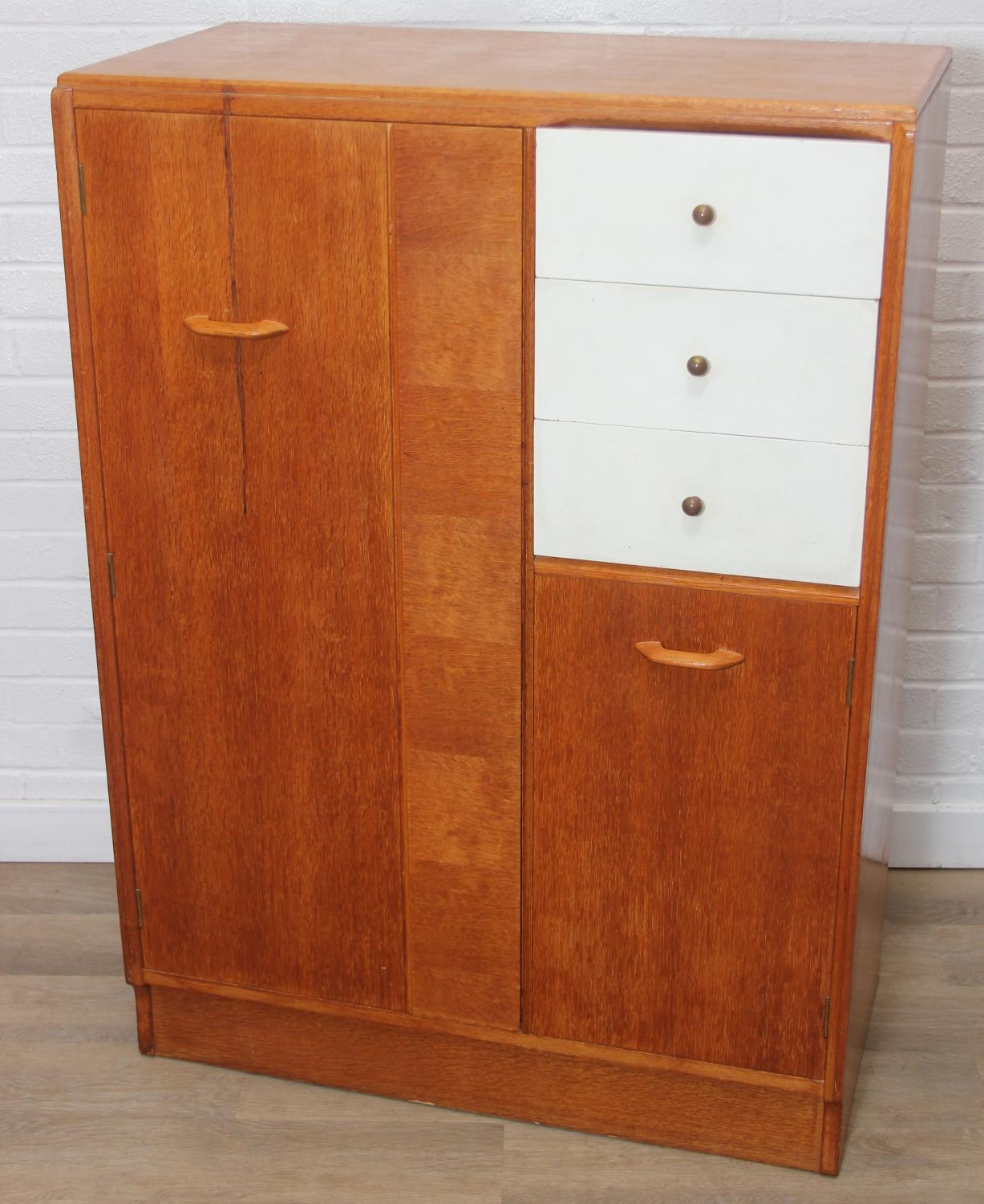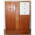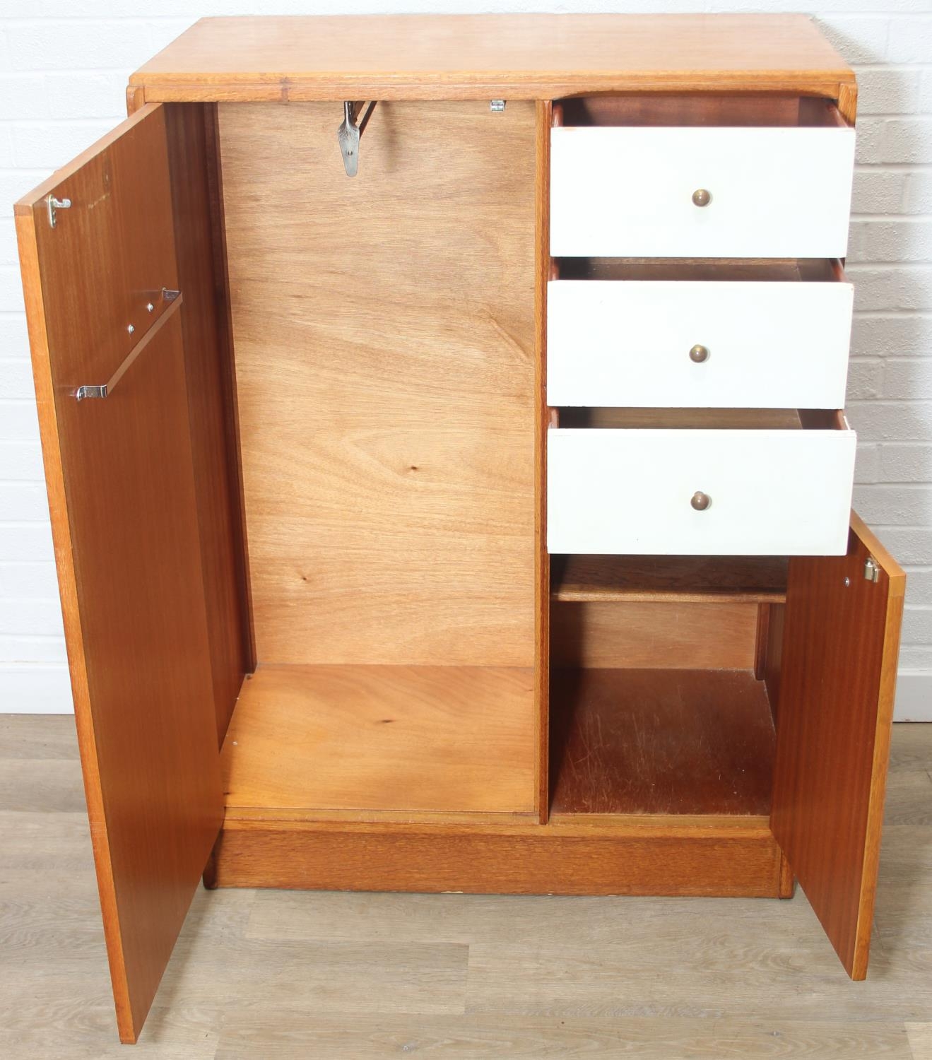 G Plan [E Gomme] China White range bachelor’s tallboy or wardrobe, with cupboard door to the left opening to reveal pull-out hanging rail, with three drawers to the right above cupboard door opening to reveal singular shelf, 88cm x 45cm x 122cm