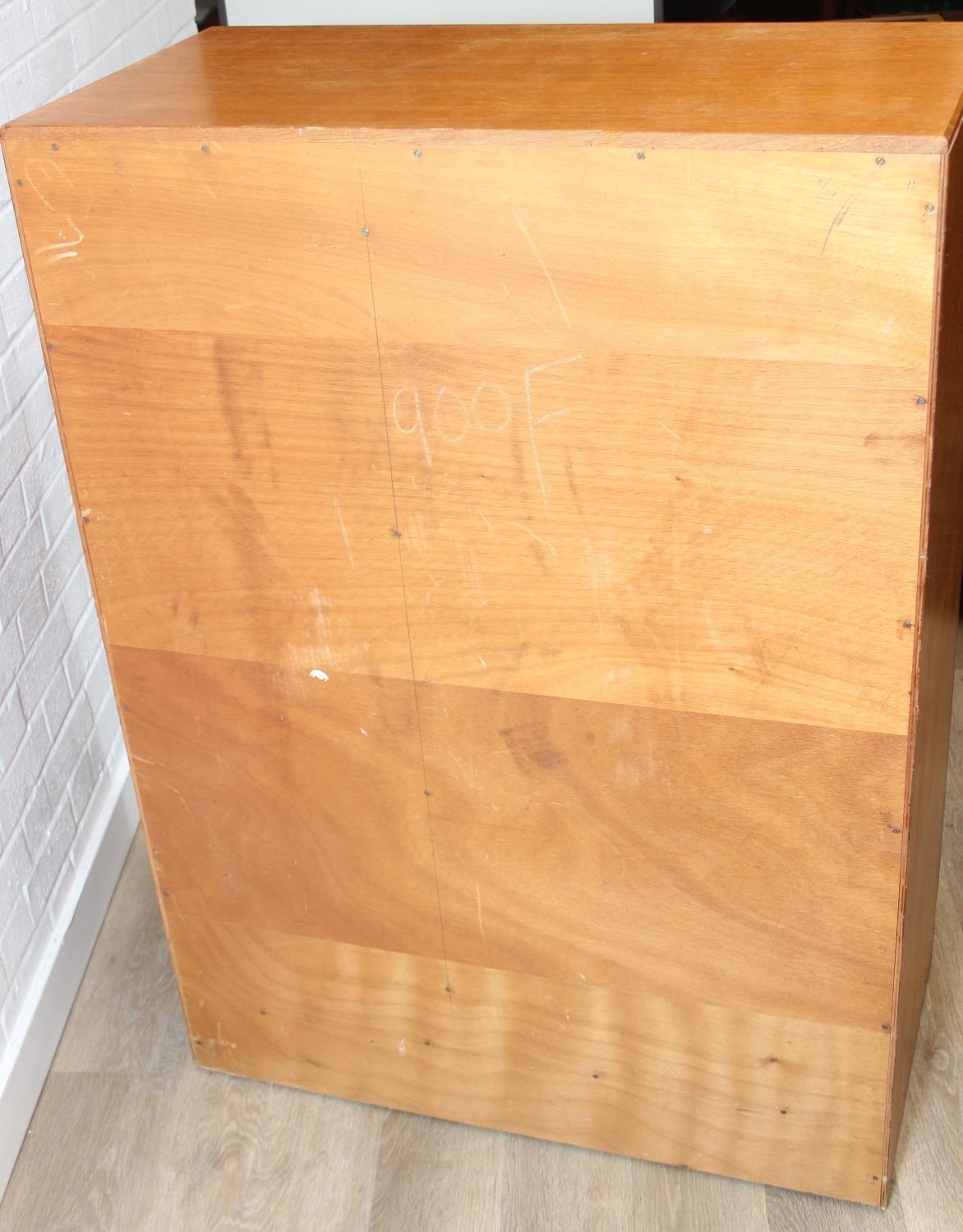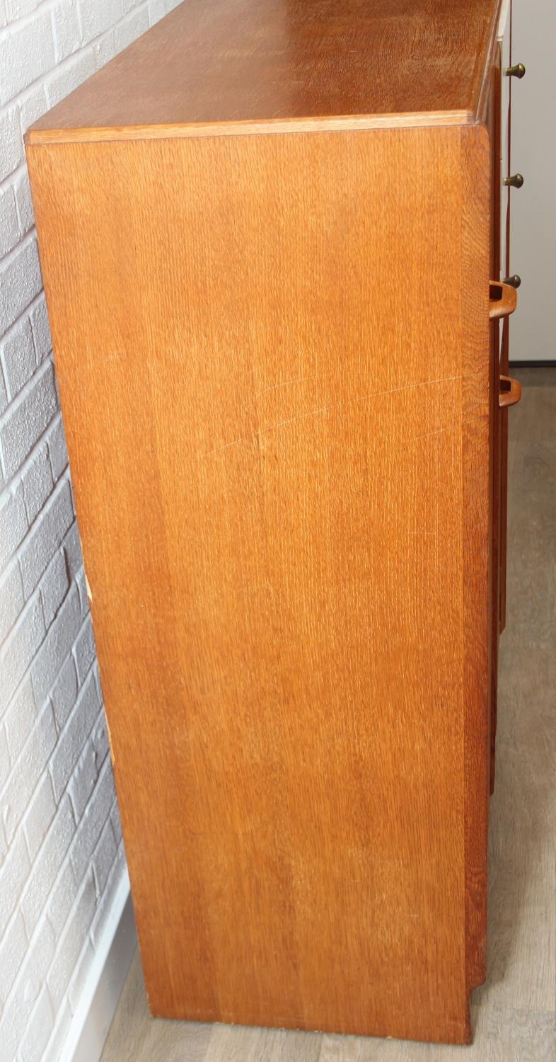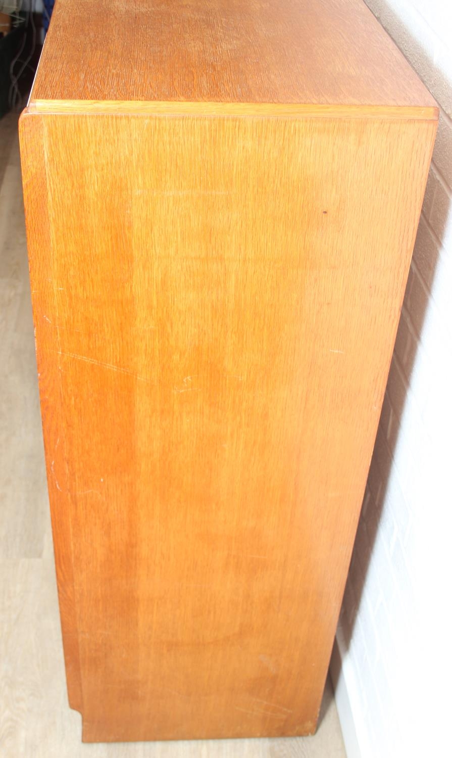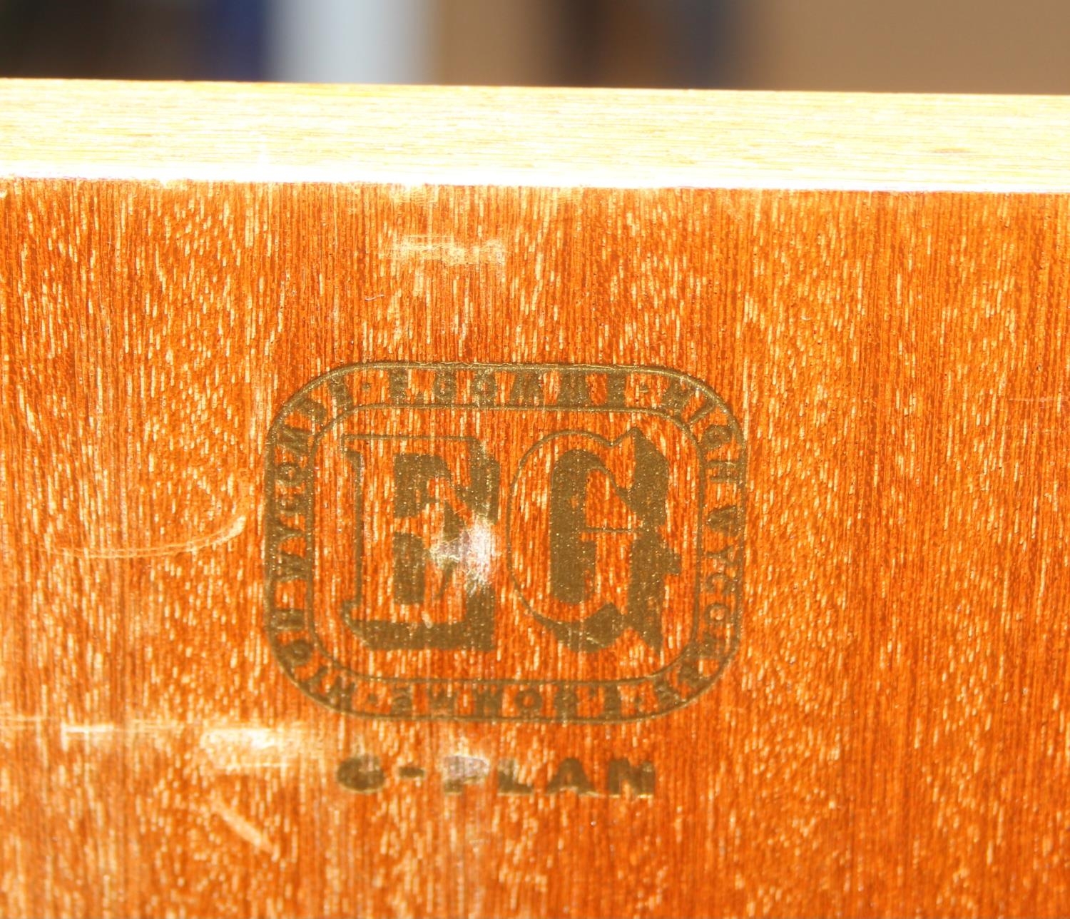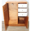 G Plan [E Gomme] China White range bachelor’s tallboy or wardrobe, with cupboard door to the left opening to reveal pull-out hanging rail, with three drawers to the right above cupboard door opening to reveal singular shelf, 88cm x 45cm x 122cm