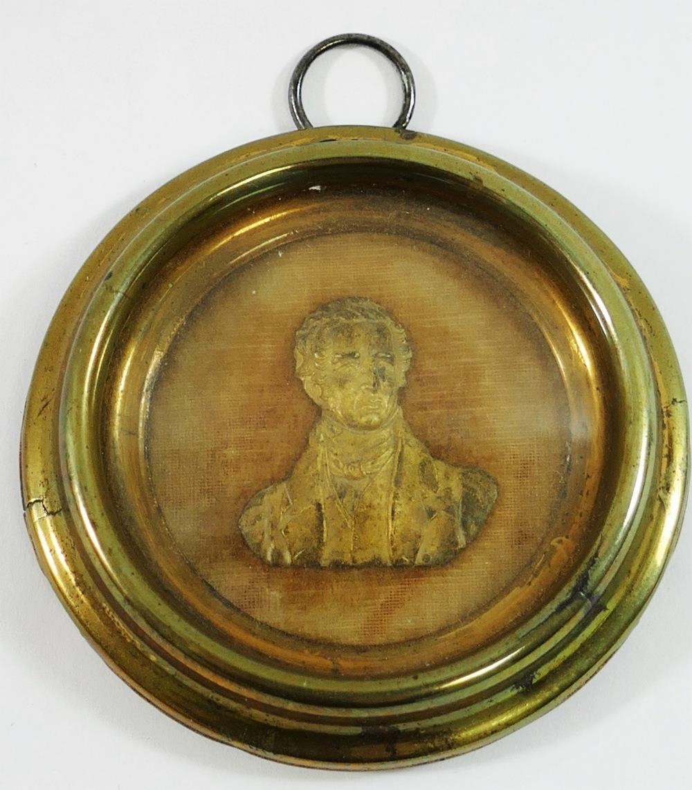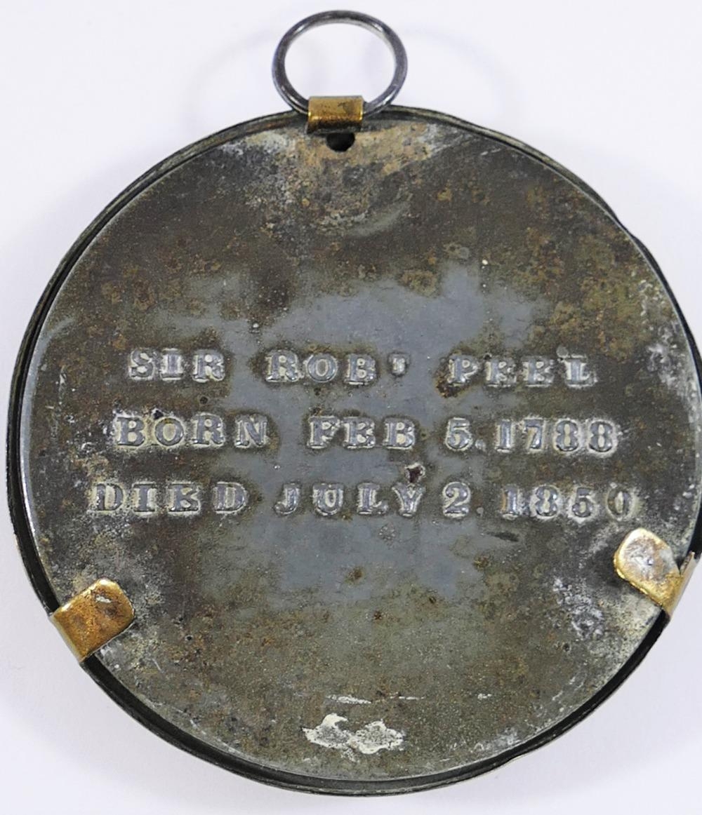 A 19th century miniature gilt metal relief bust of Sir Robert Peel, mounted on beige velvet, within glazed gilt metal circular mount, the back stamped ''Sir Robt Peel, born Feb 5 1788, died July 2 1850, 6.5cm diameter