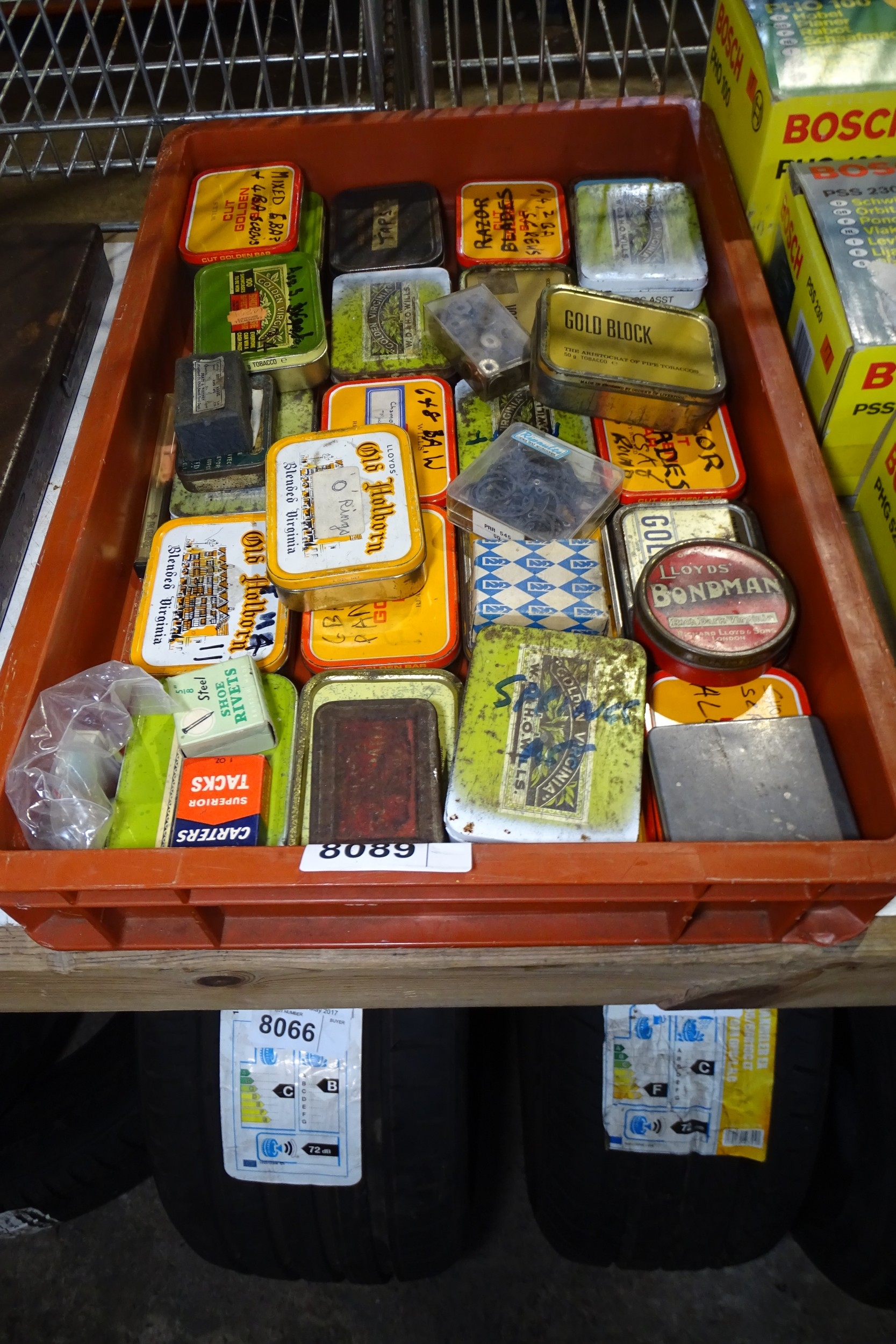 1 Box containing a quantity of various small tins that include springs, screws and washers etc