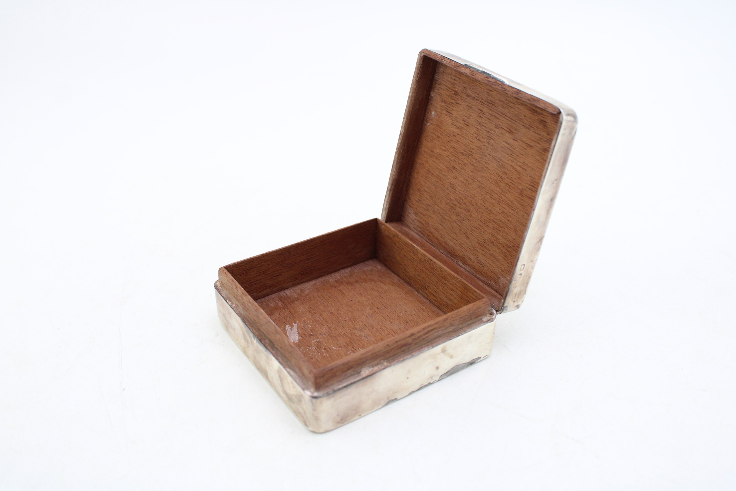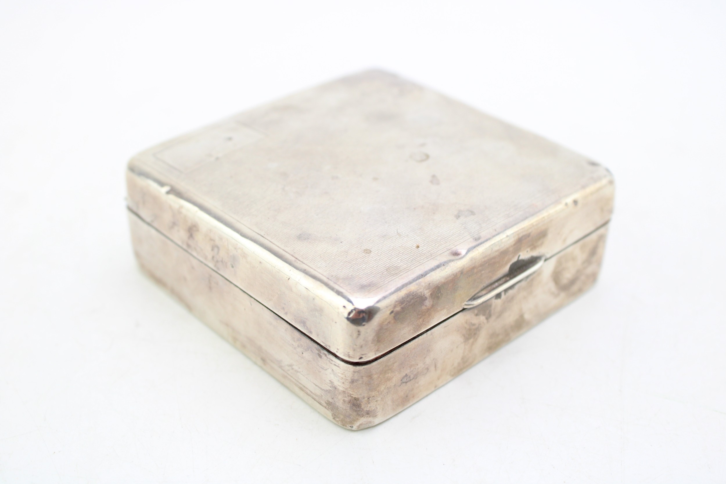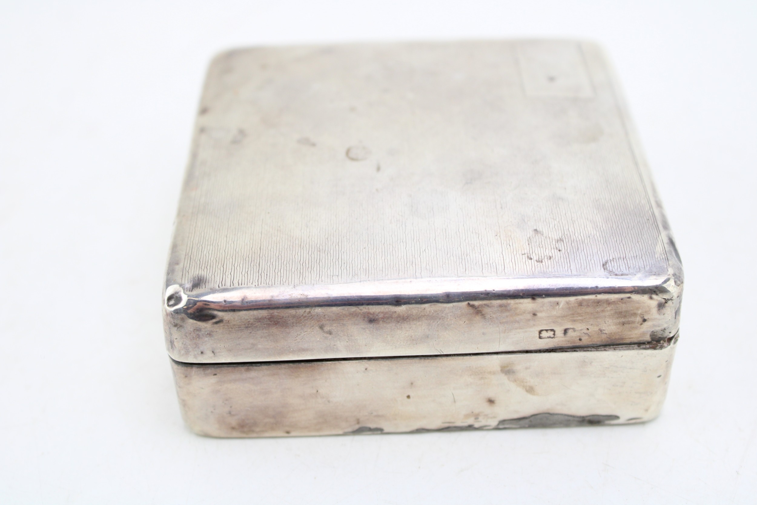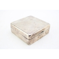 Silver cigarette box, 219.2g gross weight, circa 9cm x 9cm, hallmarks rubbed.