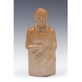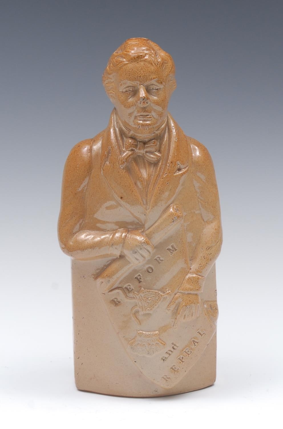 A 19th century brown salt glazed stoneware figural flask, of Robert Peel, holding a scroll, Reform and Repeal, 25cm high, c.1832