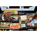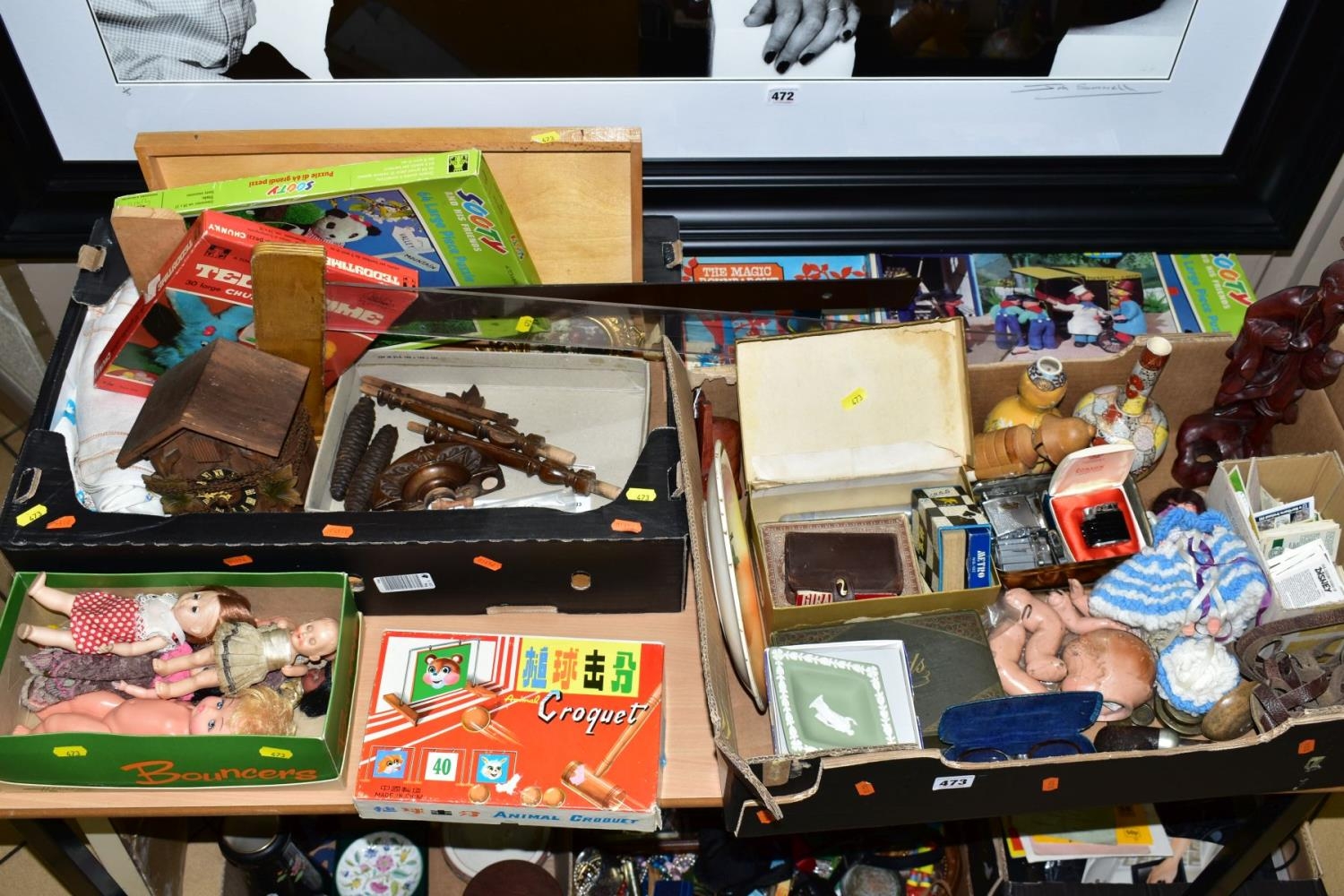 THREE BOXES AND LOOSE TOYS, SUNDRIES, etc, to include lighters, oriental vases, playing cards, jig-saws puzzles, cuckcoo clock, dolls, etc