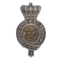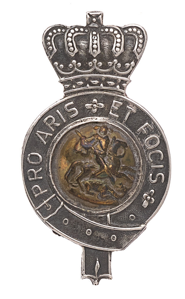 Shanghai Volunteer Corps Light Horse, Chinese cap badge c. 1882-1941. Fine very scarce locally made crowned silver strap inscribed PRO ARIS ET FOCIS; brass domed centre bearing St. George and the Dragon. Loops. Minor service wear. VGC