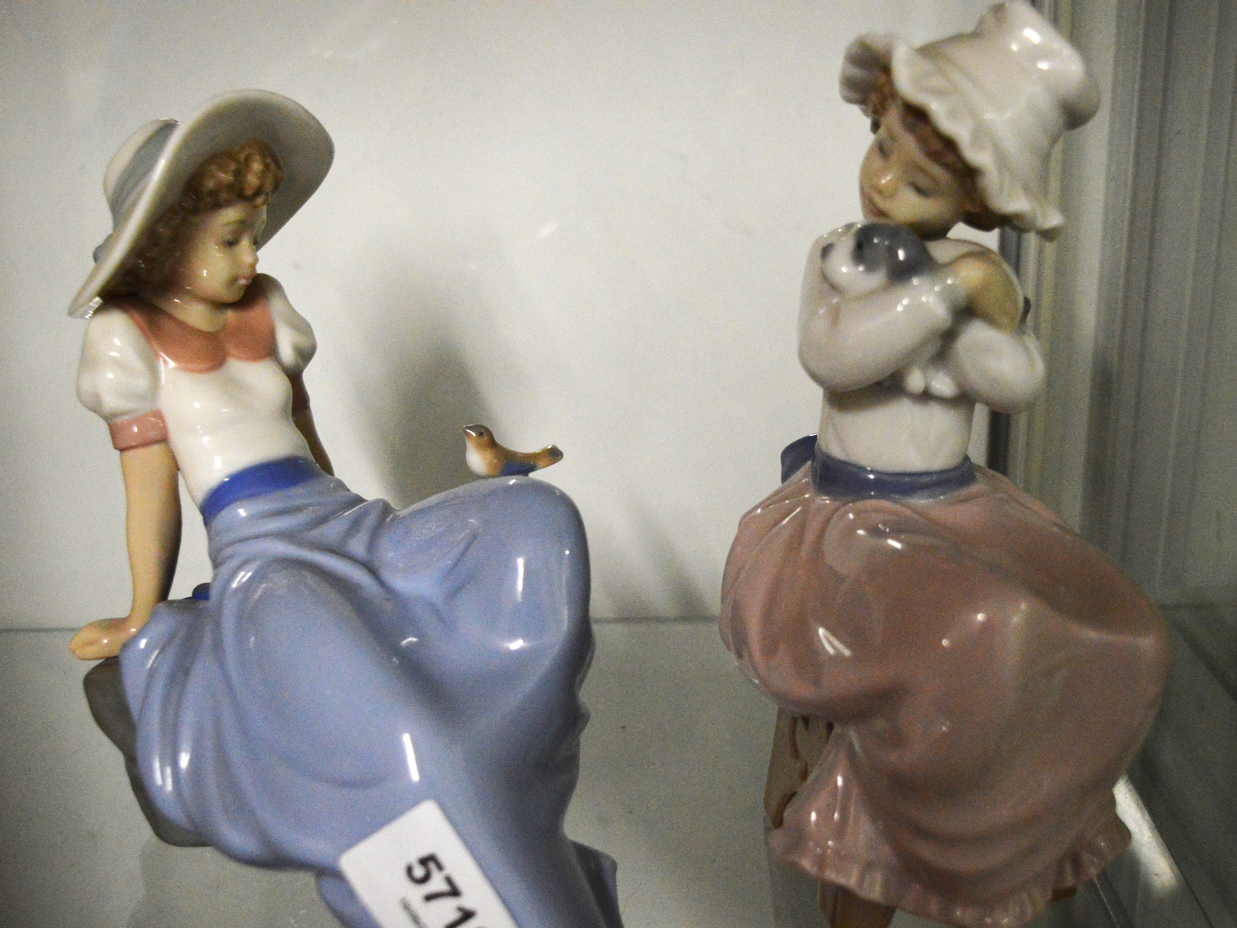 Two Seated Nao Girls: One with Hat looking at Bird Ref 1042, and One with Hat Holding a Puppy Ref A27MY - 7" High