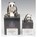 A Royal Crown Derby paperweight, Harrords Giant Panda, designed by Jane James, exclusive to Harrods, limited edition 238/250, gold stopper, 12cm, printed mark in red, signed by Jane James in gold, certificate, boxed; another, Baby Panda, pre-release limited edition, number 54, gold stopper, 6.5cm, printed mark in gold, signed by Tien Manh Dinh in gold, certificate, boxed (2)