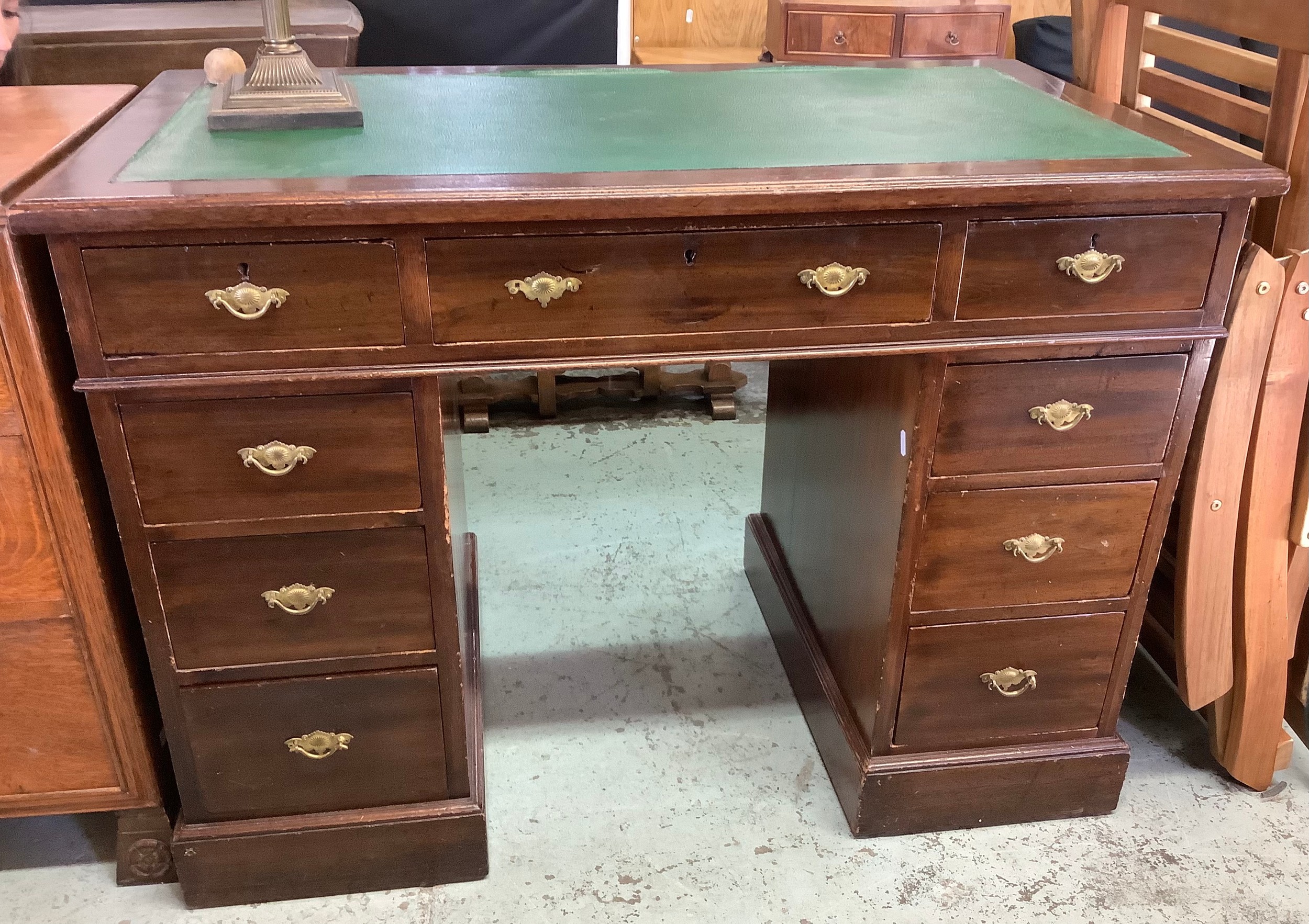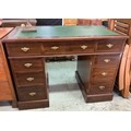 Mahogany twin pedestal desk with ivorine makers plaque for Holliday, Son & Co Ltd with eight short and one long drawers and inlaid green leather top W107cm H76cm D61cm