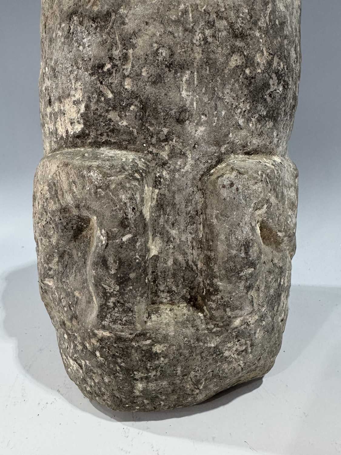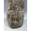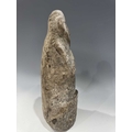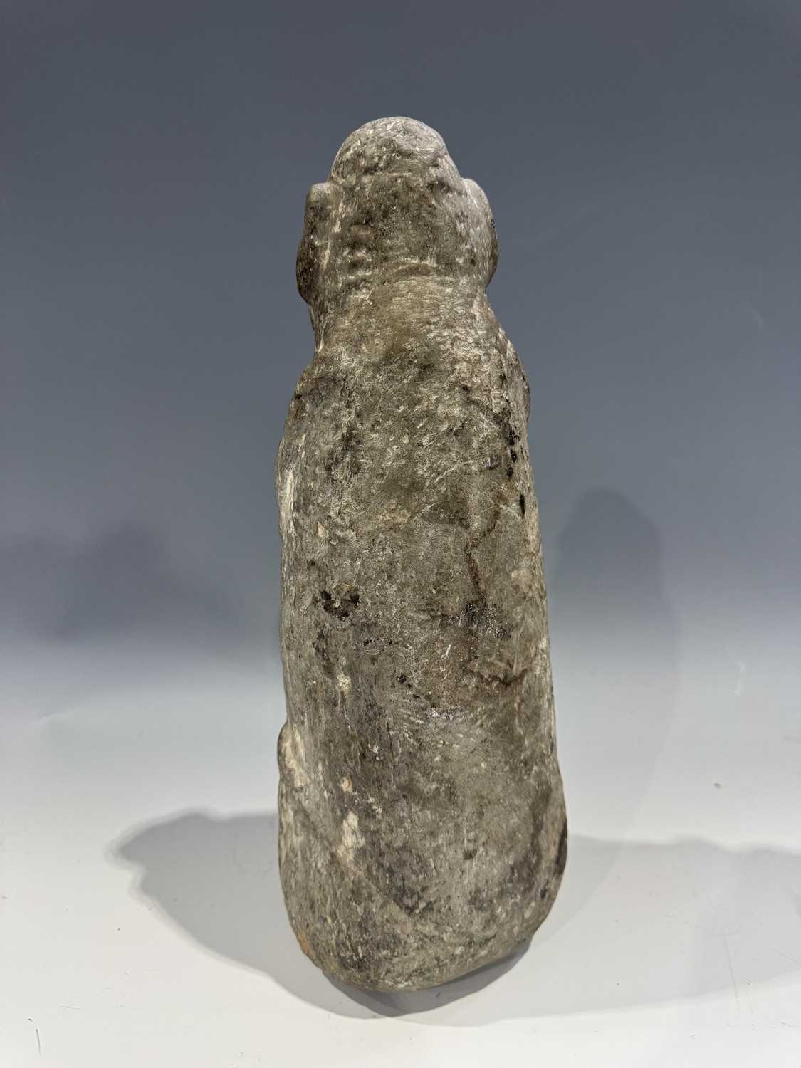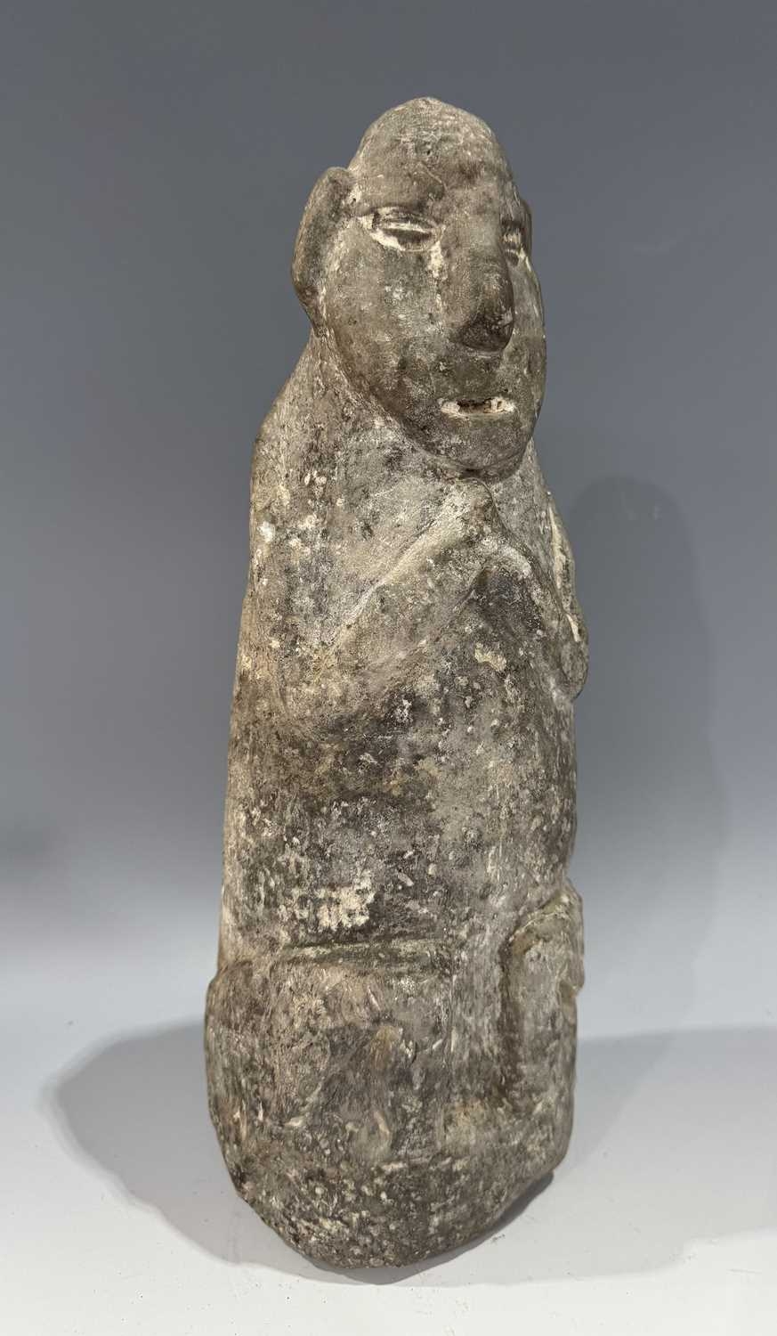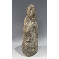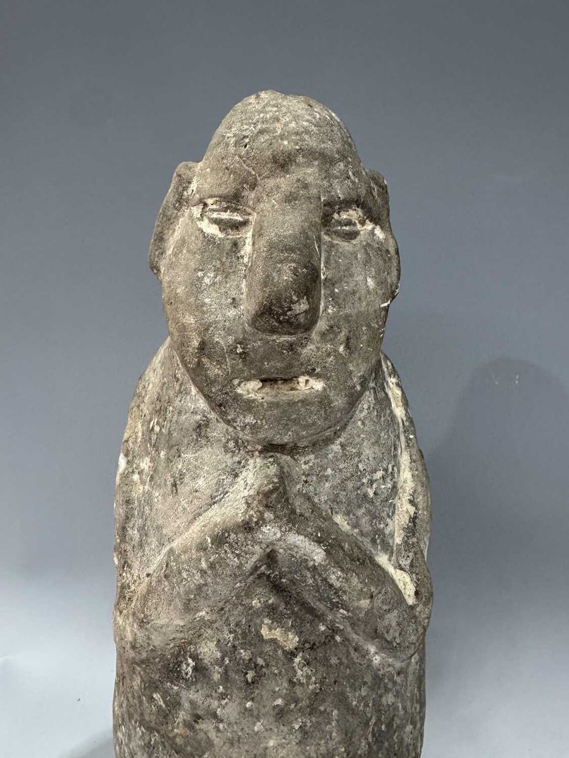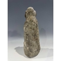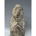 A protective Nepalese ancestor free-standing guardian figure, carved in grey schist-type stone, Humla region, North West Nepal, 19th century or earlier, economically modelled as a seated figure with hands together in the Namaste pose, vernacular style, 35cm high Provenance: The Alain Rouveure Collection