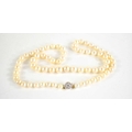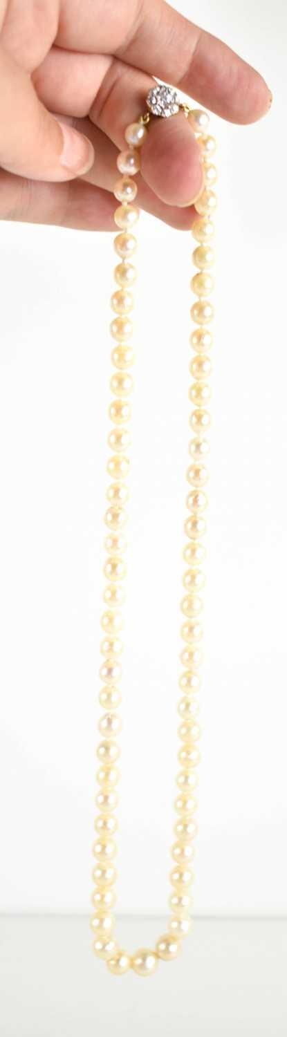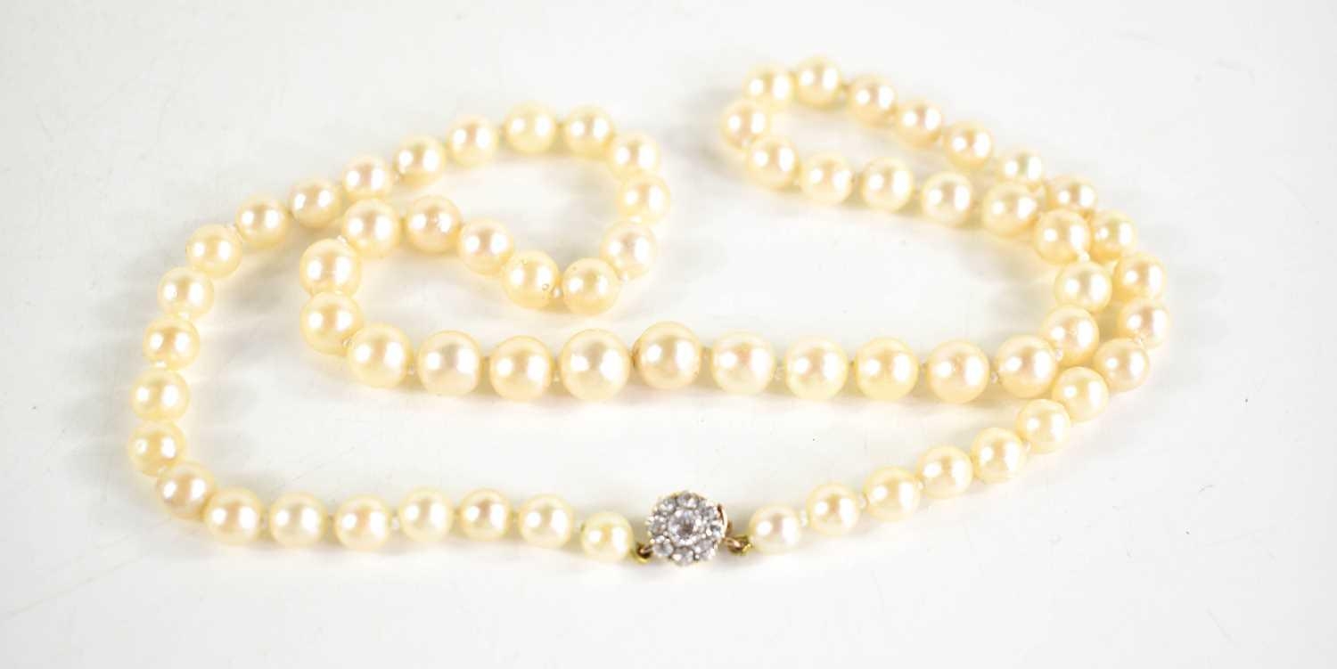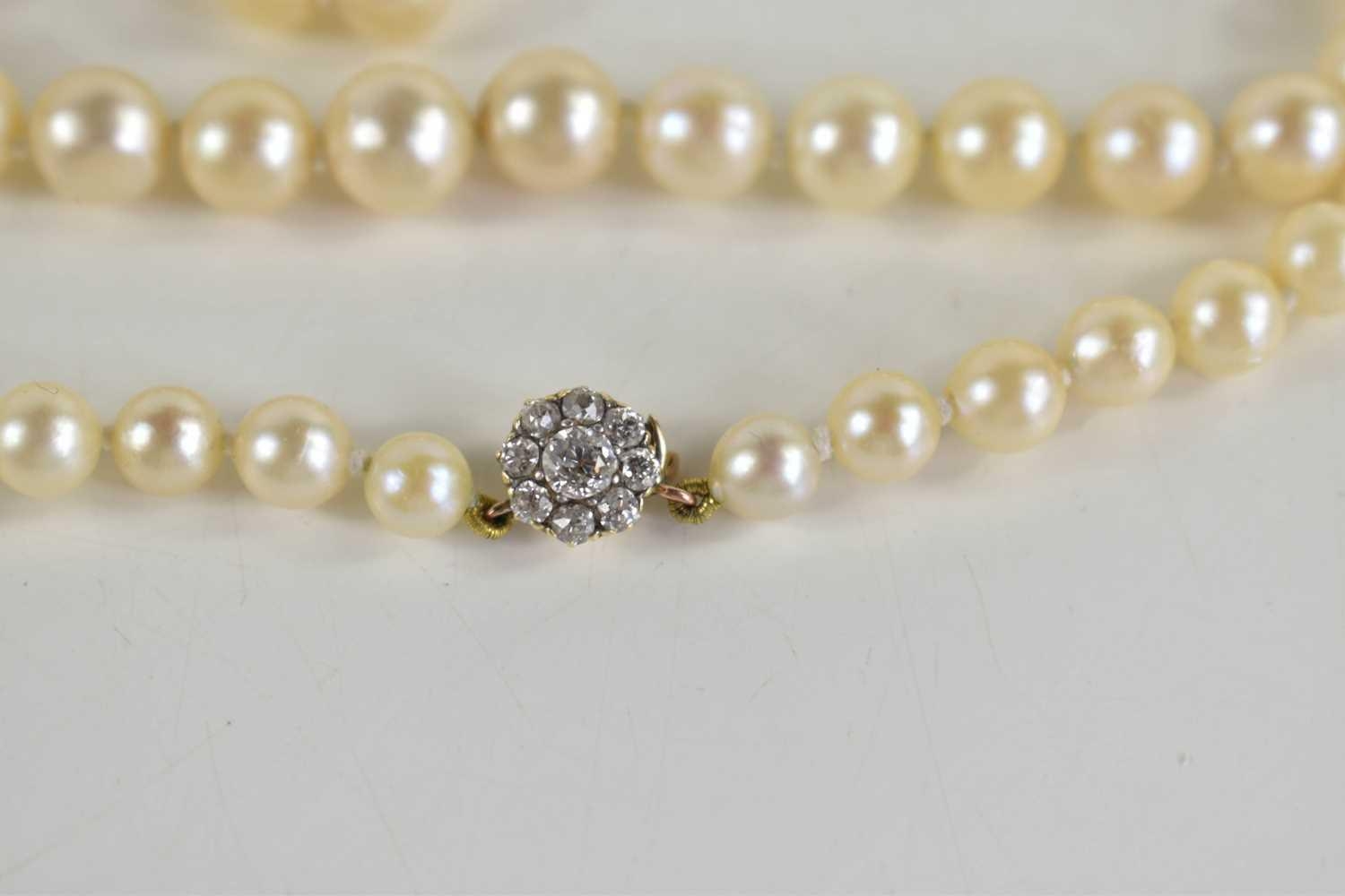 An antique cultured pearl necklace with 9ct gold clasp set with paste stones in flowerhead form, graduated pearls 53cm long.