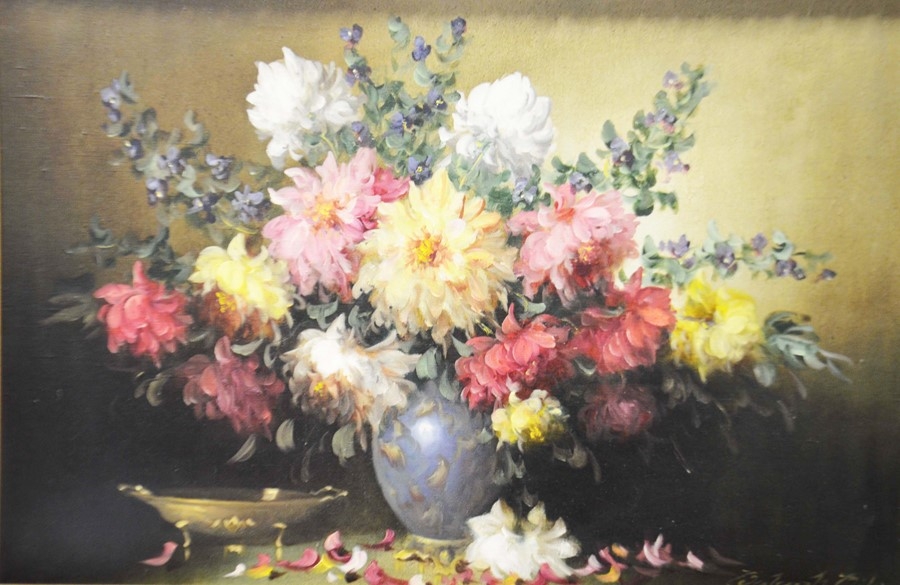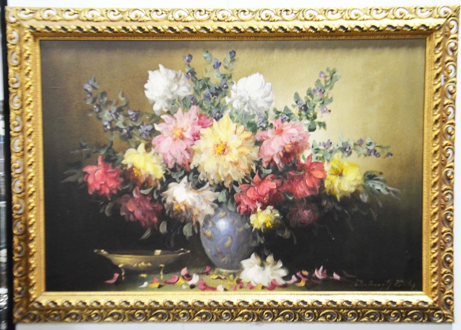 Bela Balogh (1909-1980), Still life of a bowl of flowers, oil on canvas, signed, 60cm x 90cm, framed