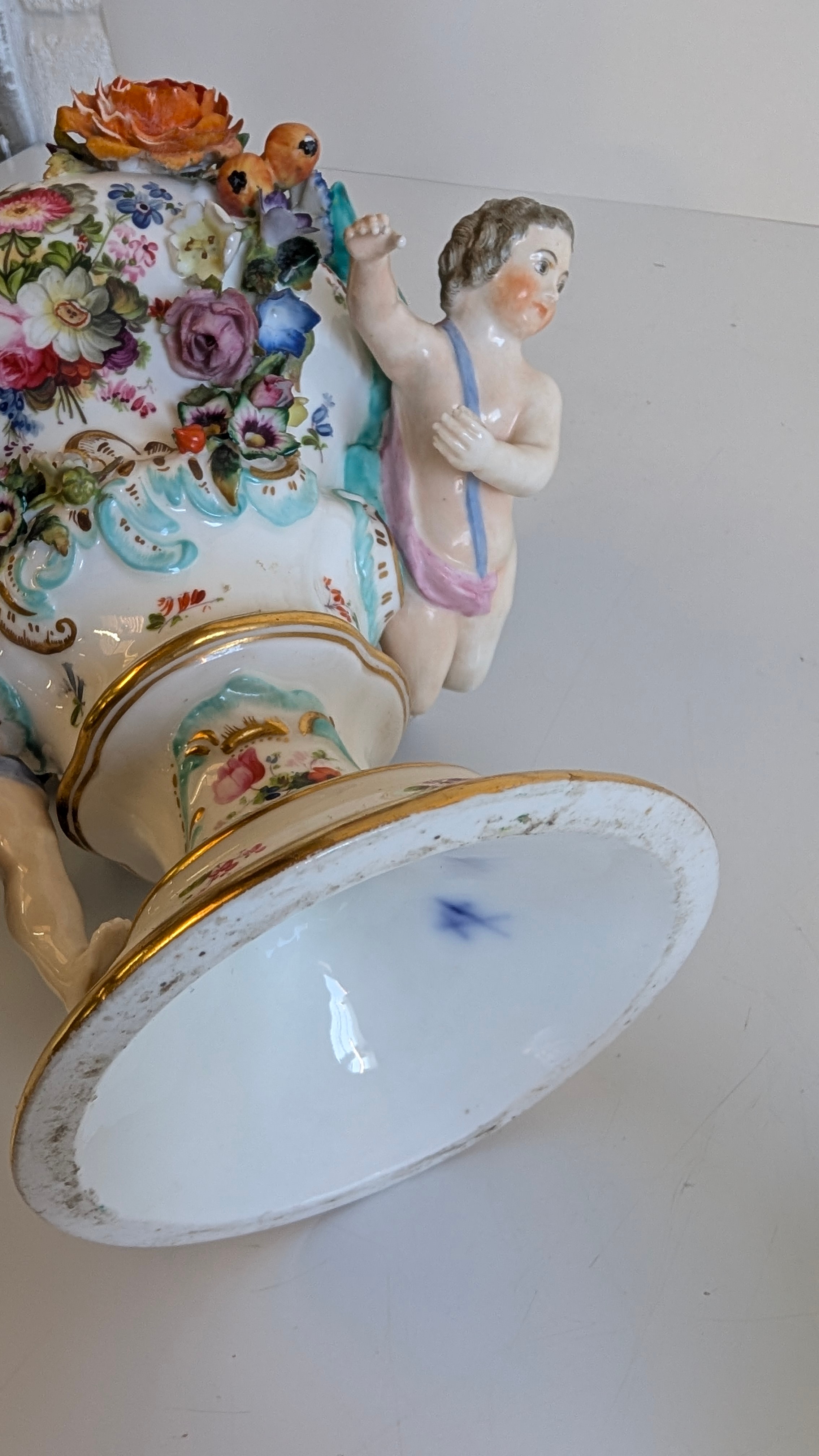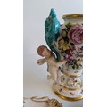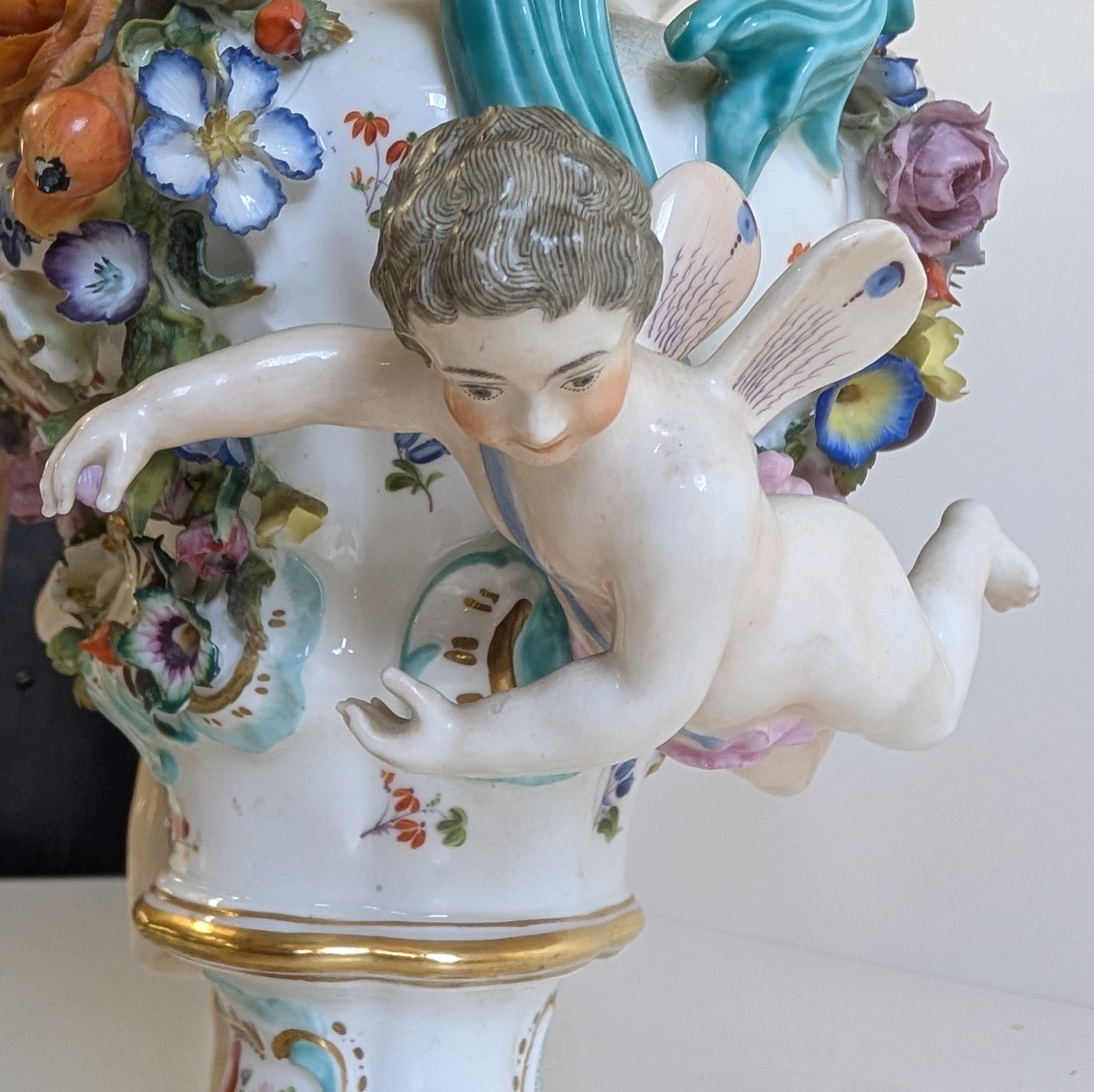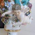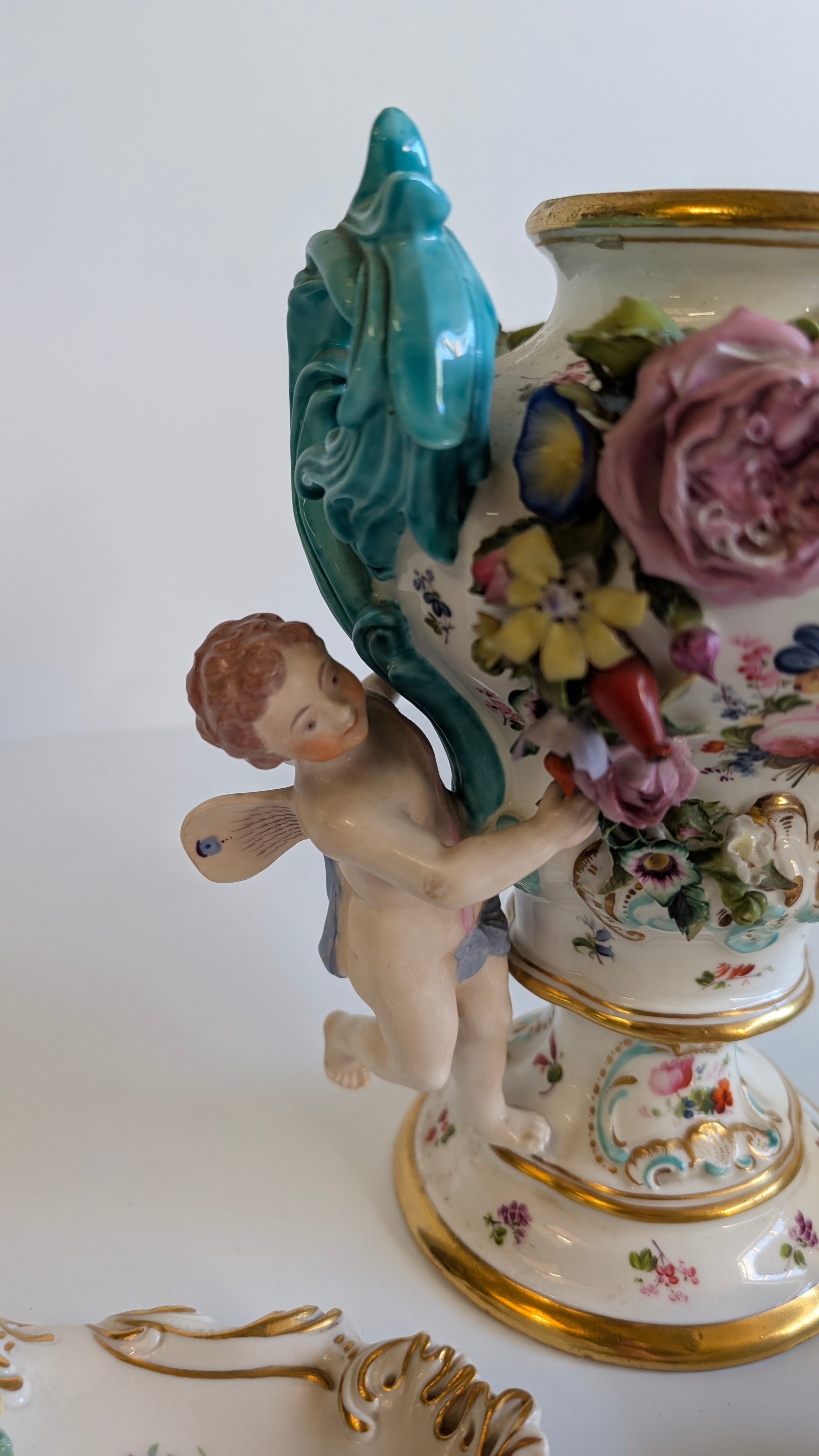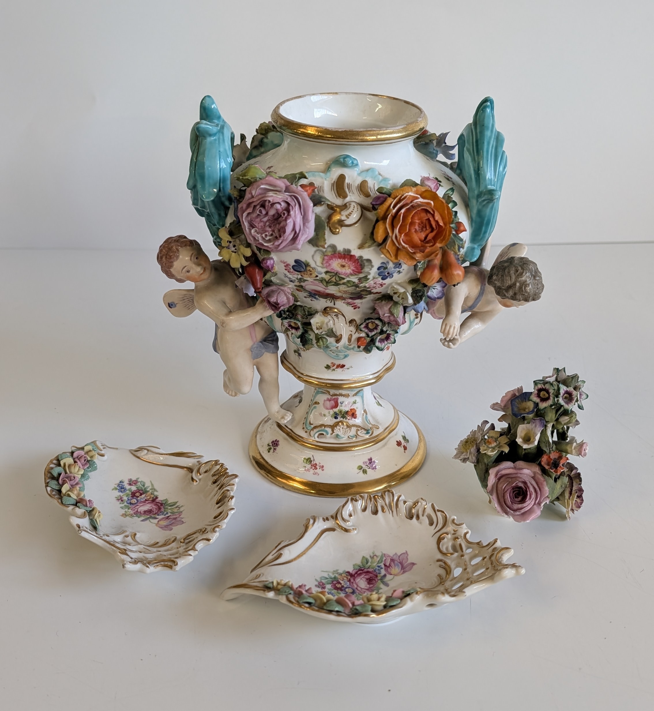 Comprising a Dresden-style porcelain pedestal vase decorated with hand-painted floral sprays and applied flower garlands, flanked by turquoise scroll handles and two putti figures, together with a pair of reticulated floral dishes and a small floral posy group. Each piece delicately hand-painted with enamelled blooms and gilt highlights, several bearing blue underglaze marks (crossed swords and crowned N), typical of Dresden or Capodimonte manufacture.