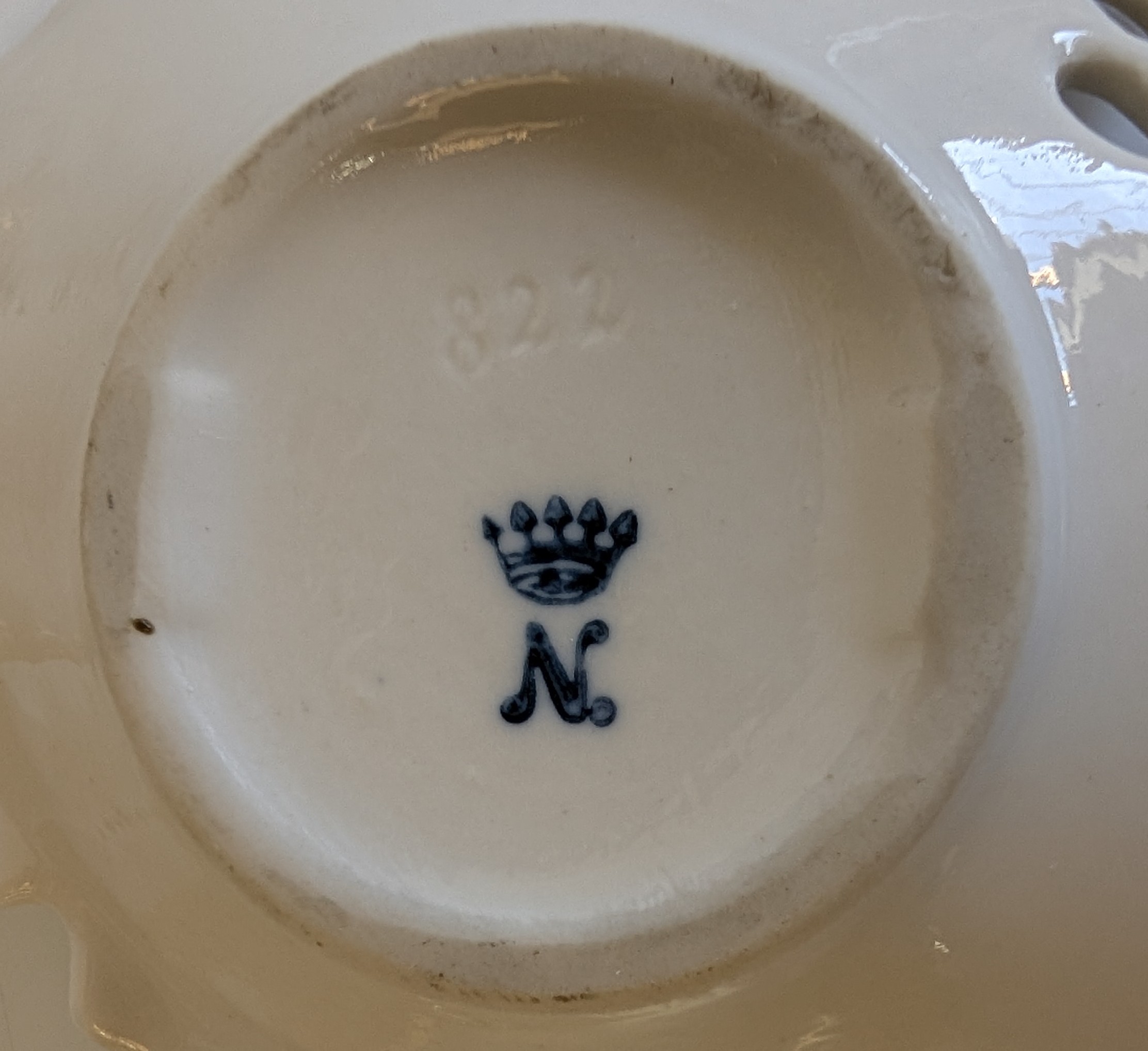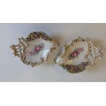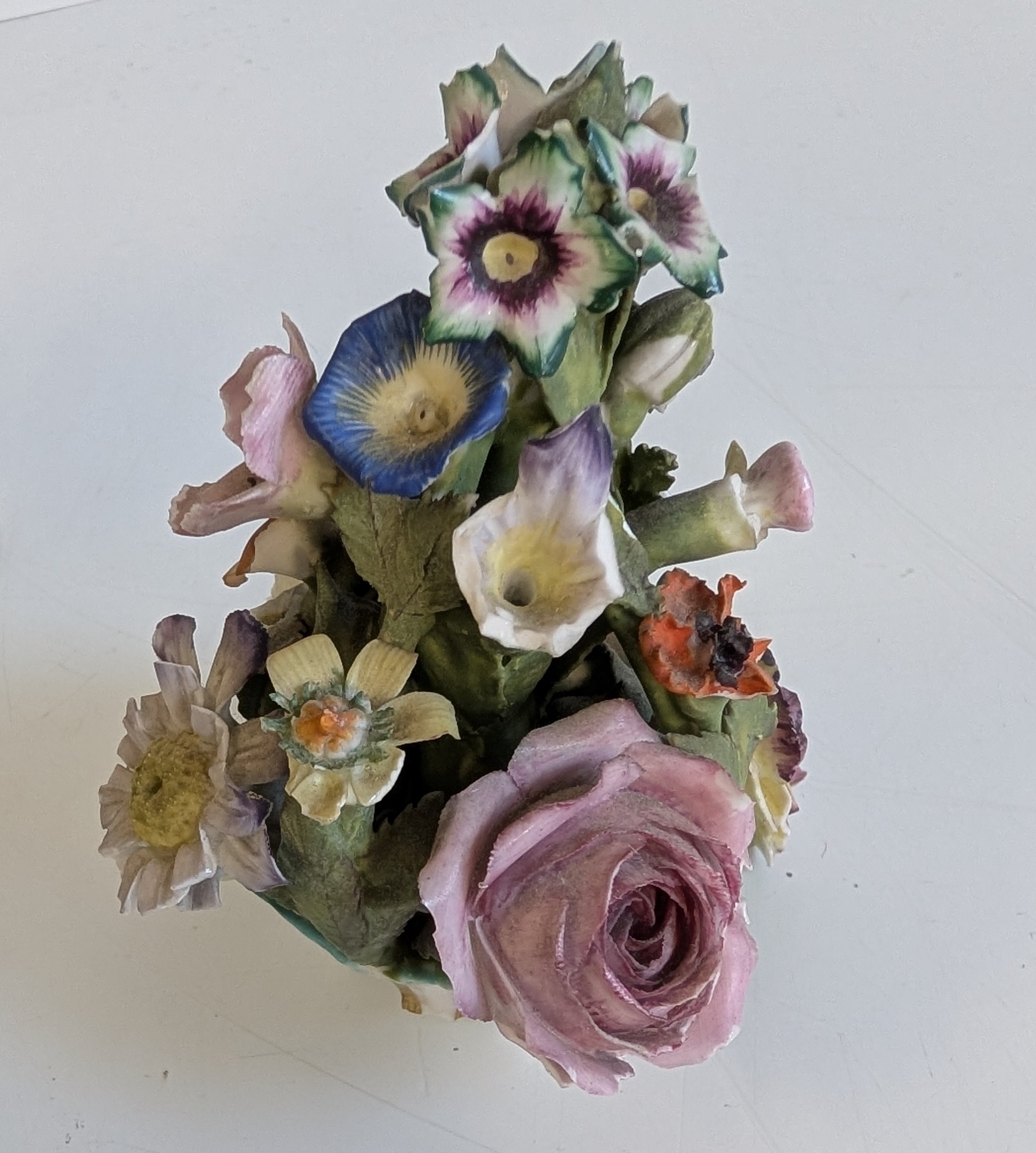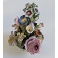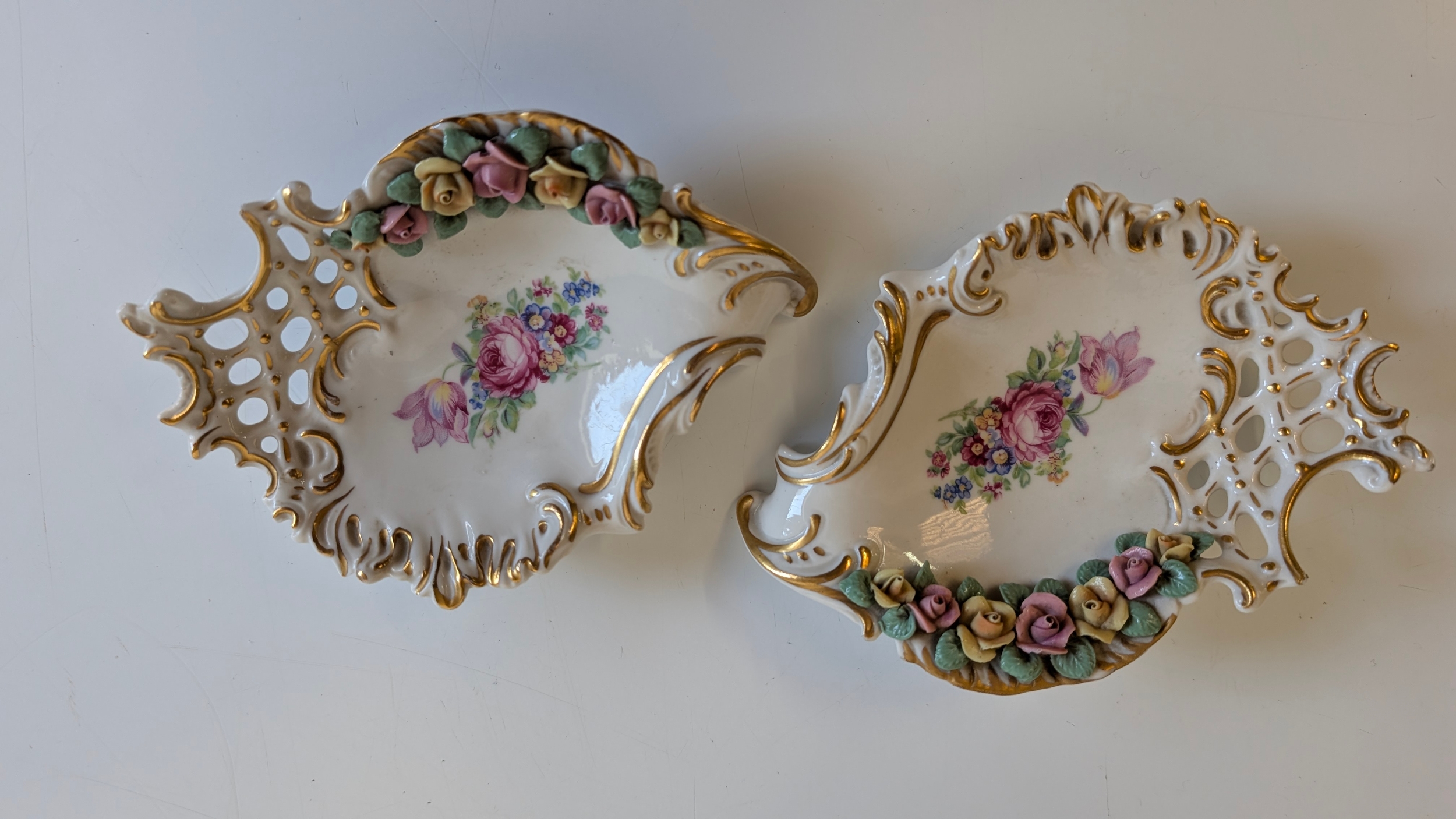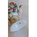 Comprising a Dresden-style porcelain pedestal vase decorated with hand-painted floral sprays and applied flower garlands, flanked by turquoise scroll handles and two putti figures, together with a pair of reticulated floral dishes and a small floral posy group. Each piece delicately hand-painted with enamelled blooms and gilt highlights, several bearing blue underglaze marks (crossed swords and crowned N), typical of Dresden or Capodimonte manufacture.