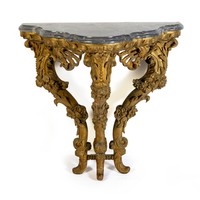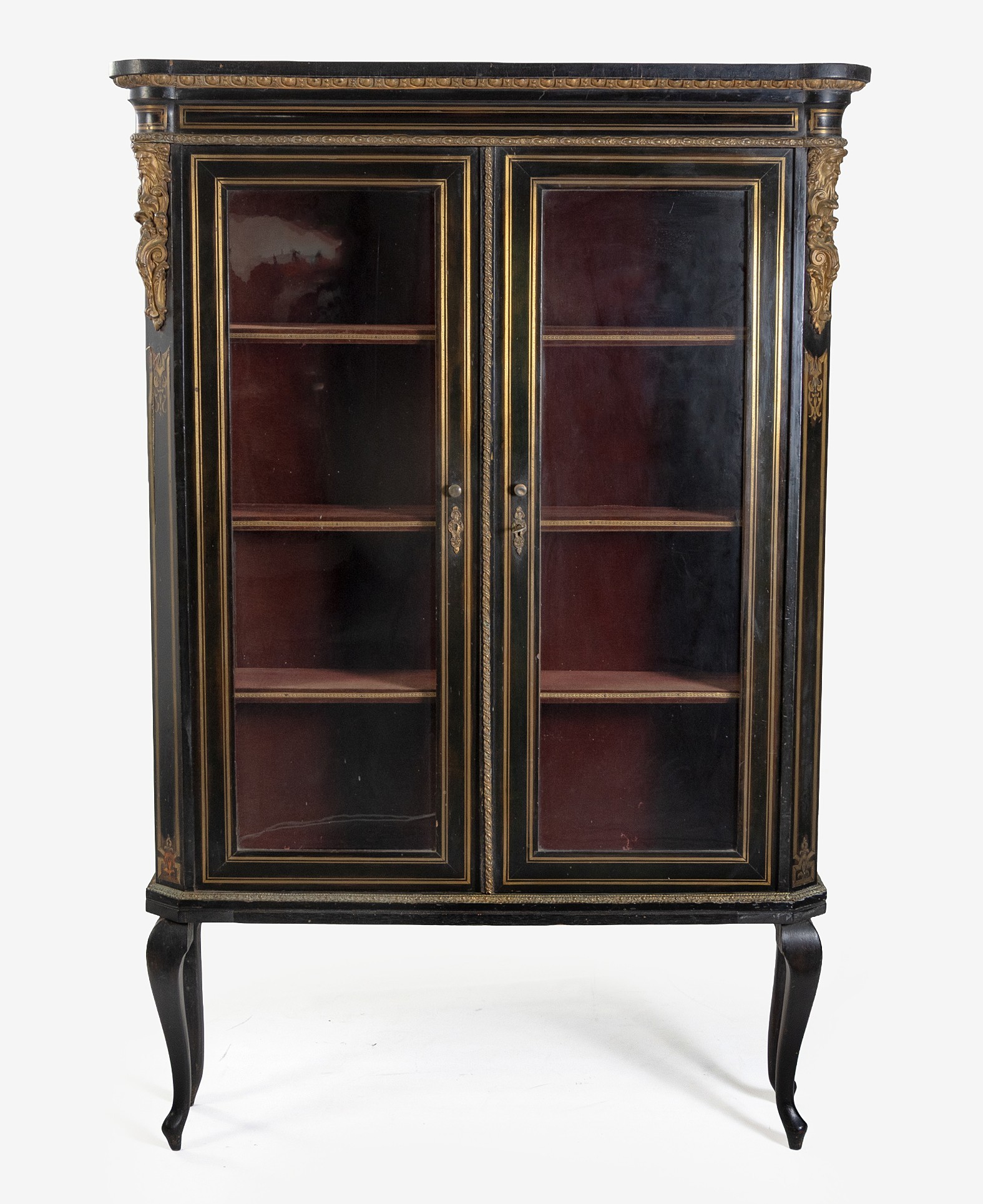 The outswept cornice above an egg-and-dart frieze, a pair of glazed doors below enclosing three shelves, canted corners surmounted by male masks, on cabriole legs, distress