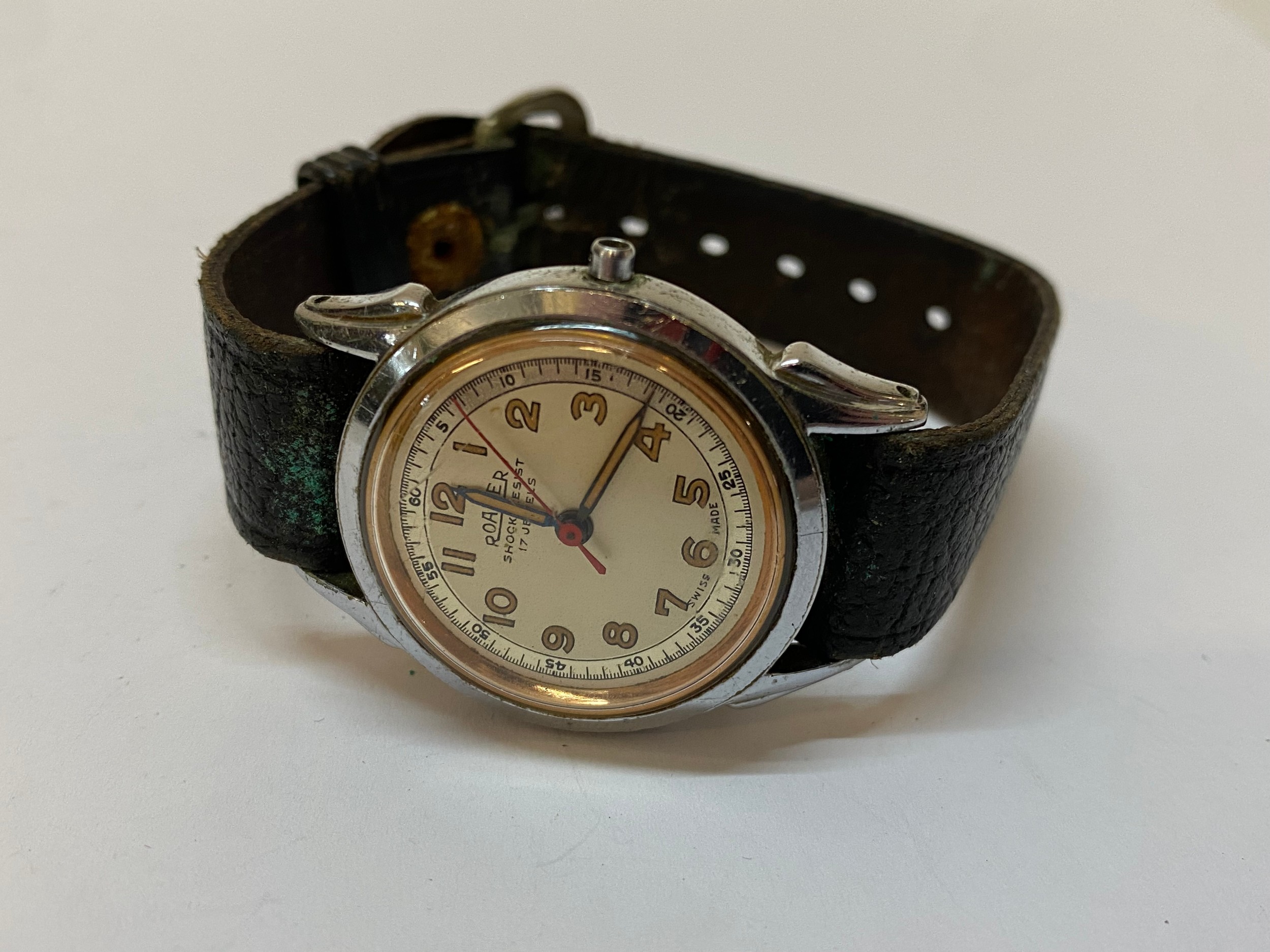 A Roamer wristwatch in a stainless steel case, on a black leather strap