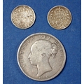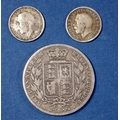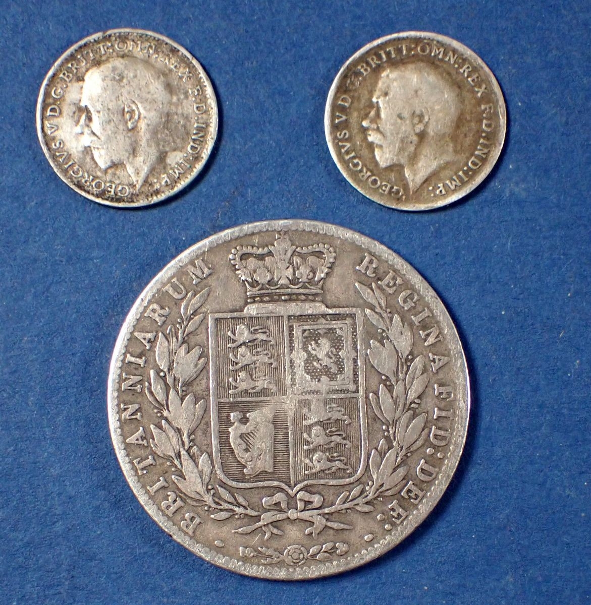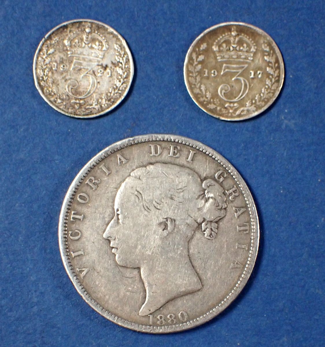 A Victoria silver half crown 1880 young head plus two George V threepences 1917 and 1921, total weight 16.5g Cond: Fine