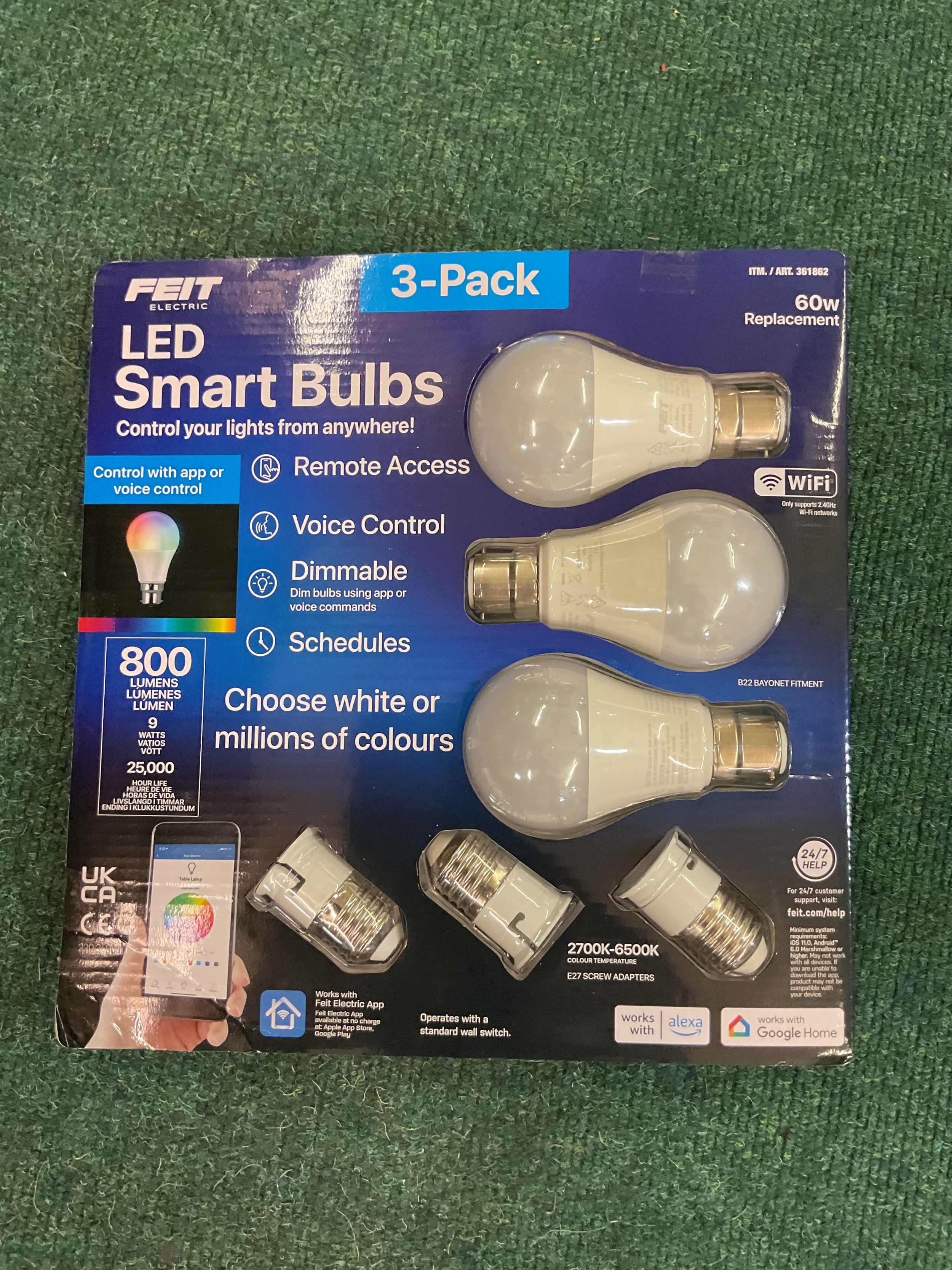 SET OF THREE PACKAGED FEIT ELECTRIC SMART LED BULBS - WORKS WITH GOOGLE, ALEXA AND FEIT APP
