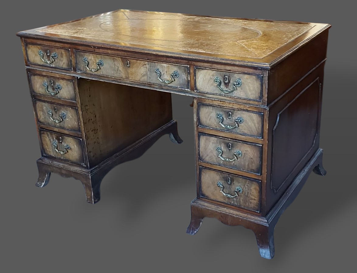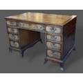 A mahogany twin pedestal desk, the tooled leather inset top above nine drawers with brass handles raised upon bracket feet, 119cms wide, 70cms deep and 76cms tall