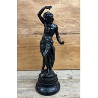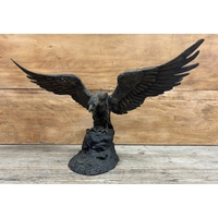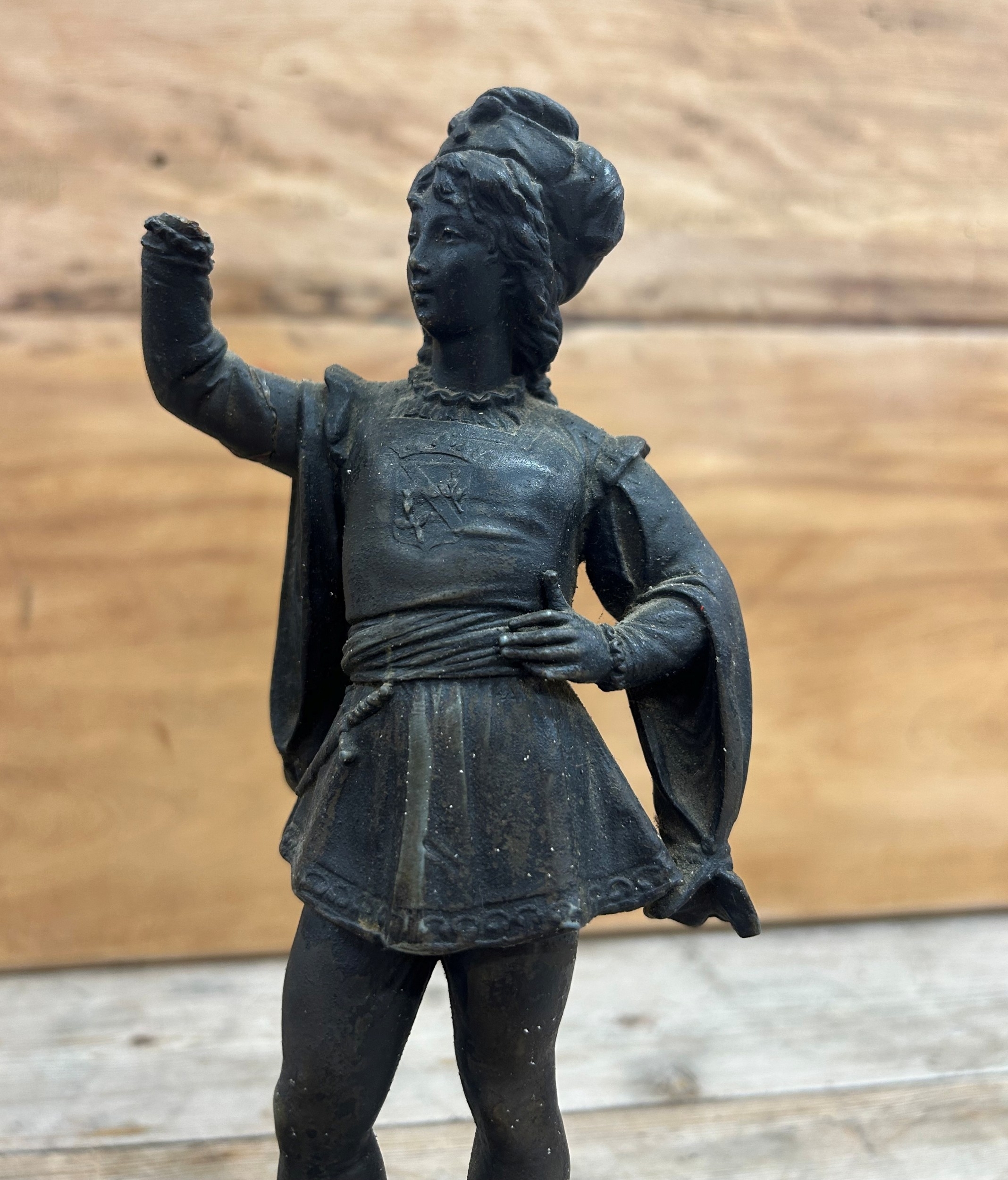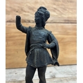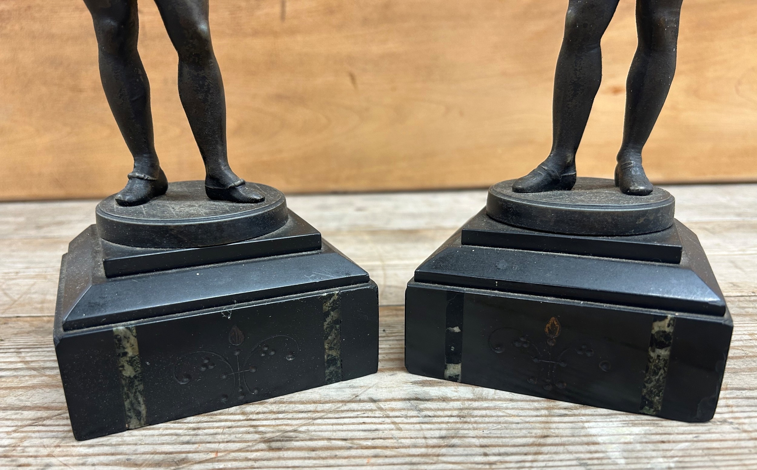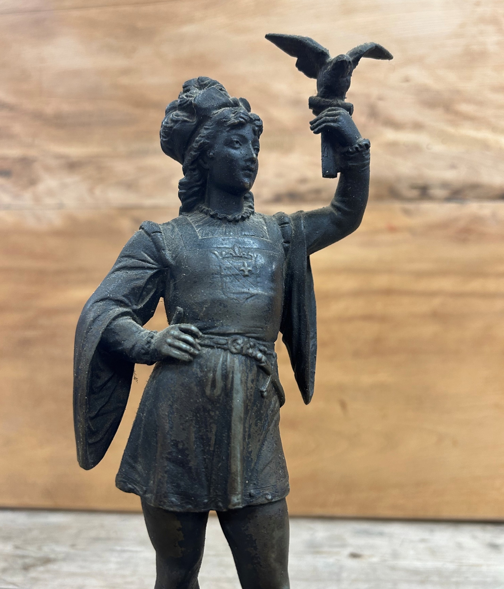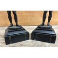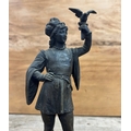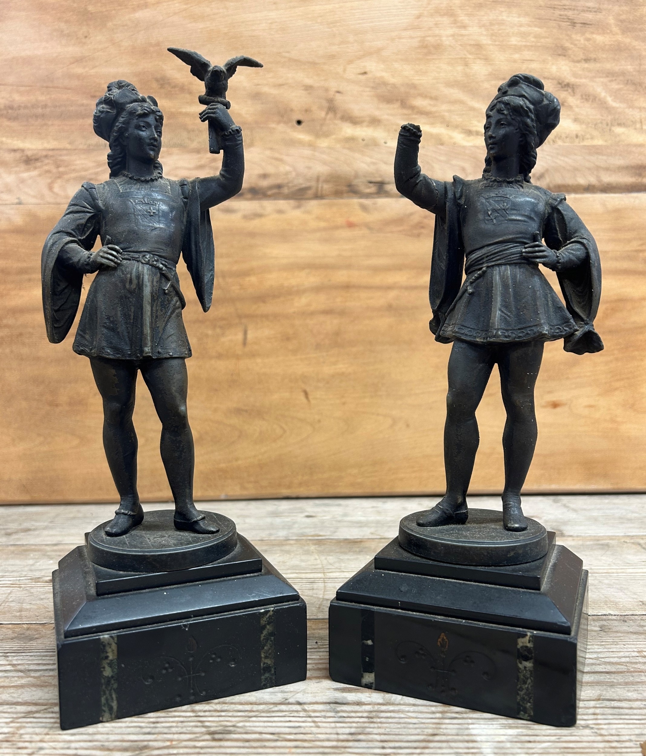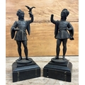 Pair of cast metal sculptures depicting figures holding a falcon bird, held atop polished slate plinth bases, H 29cm (A/F)