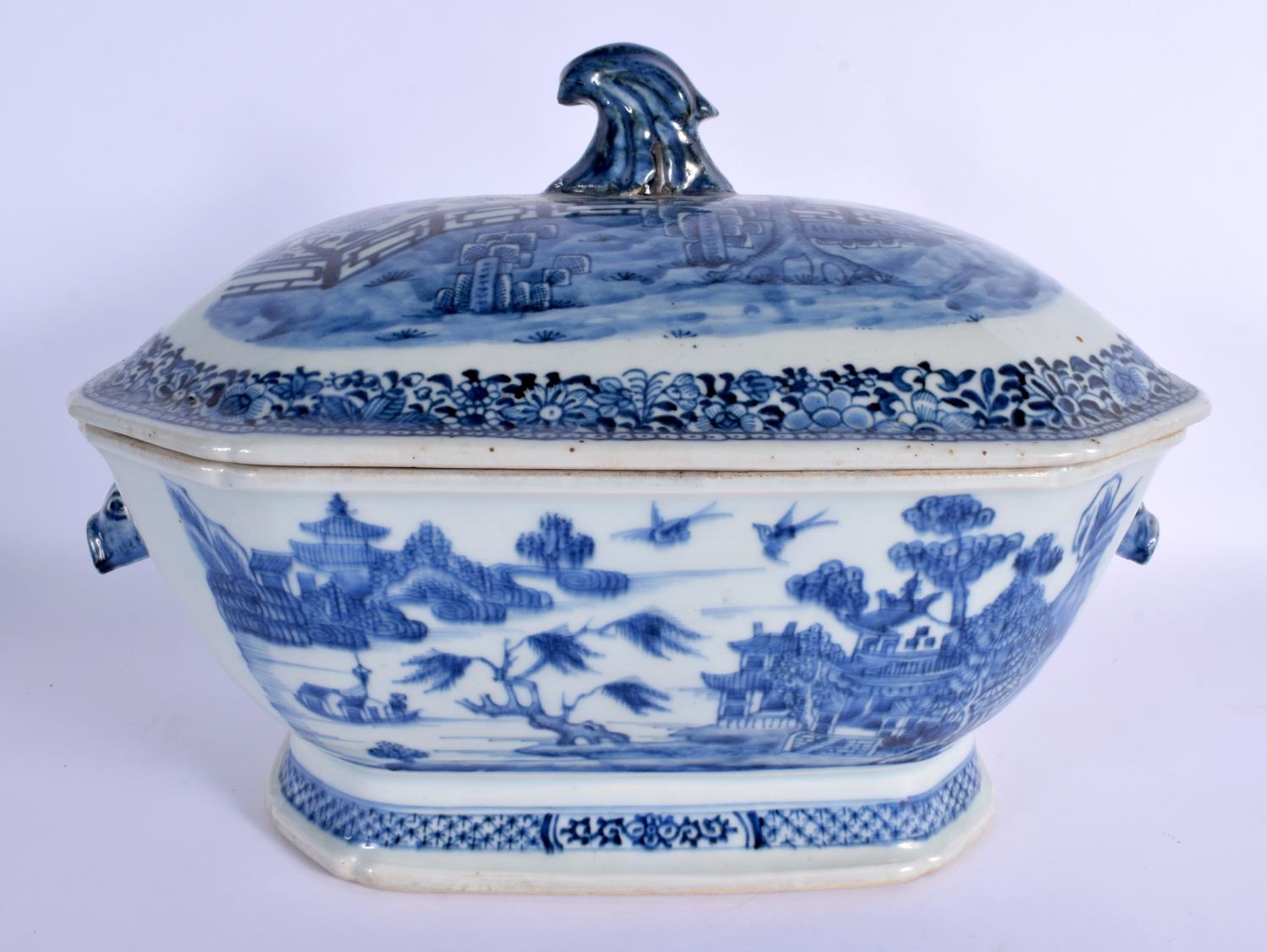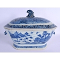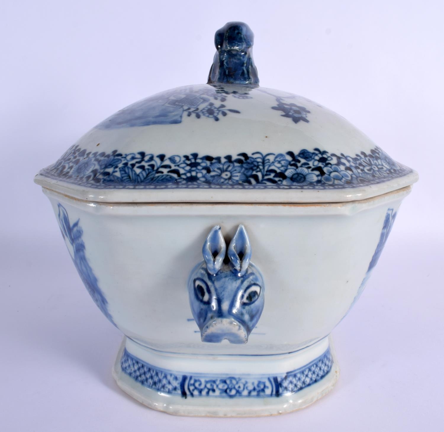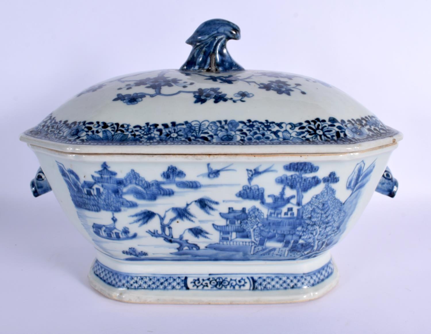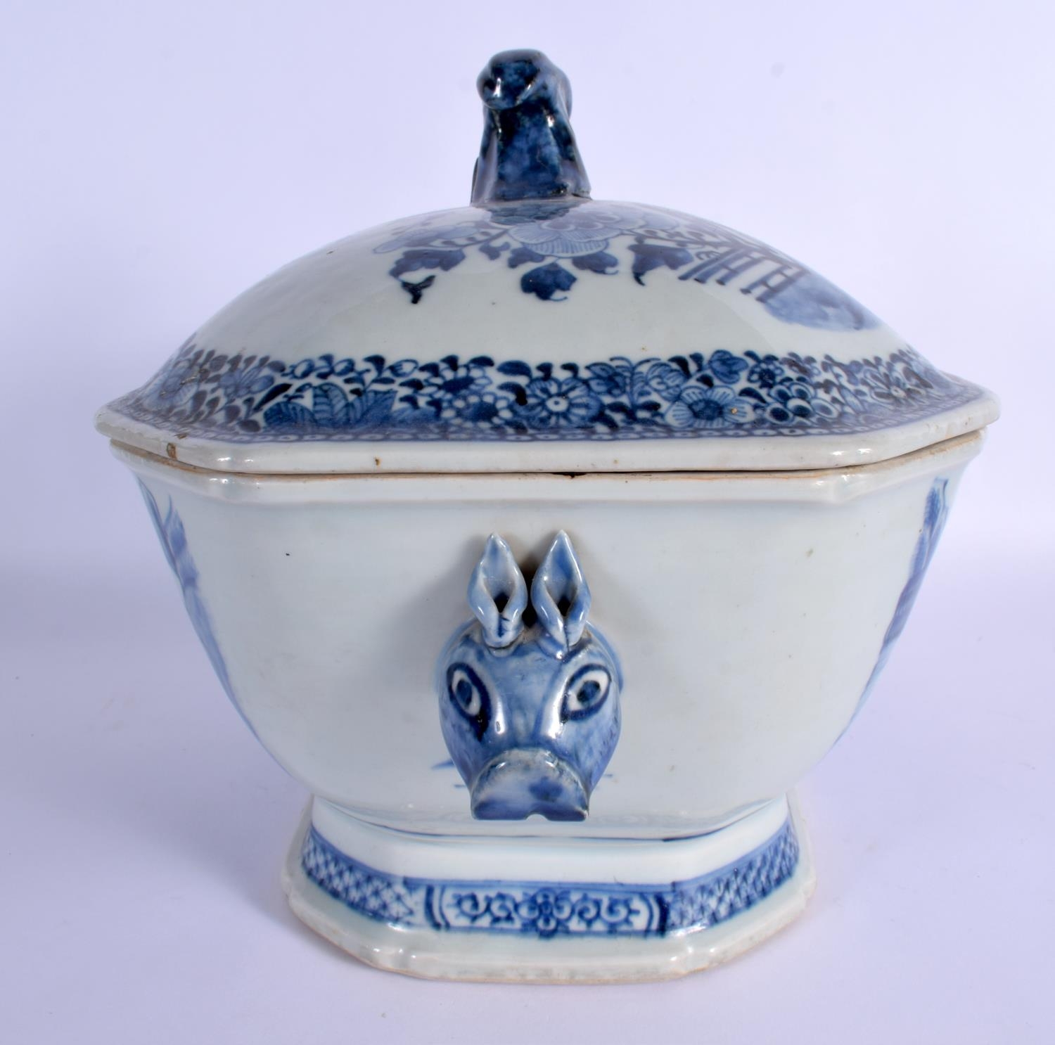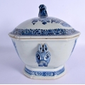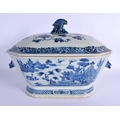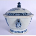 A GOOD LARGE 18TH CENTURY CHINESE BLUE AND WHITE EXPORT TUREEN AND COVER with matching stand. 38 cm x 26 cm overall. (2)