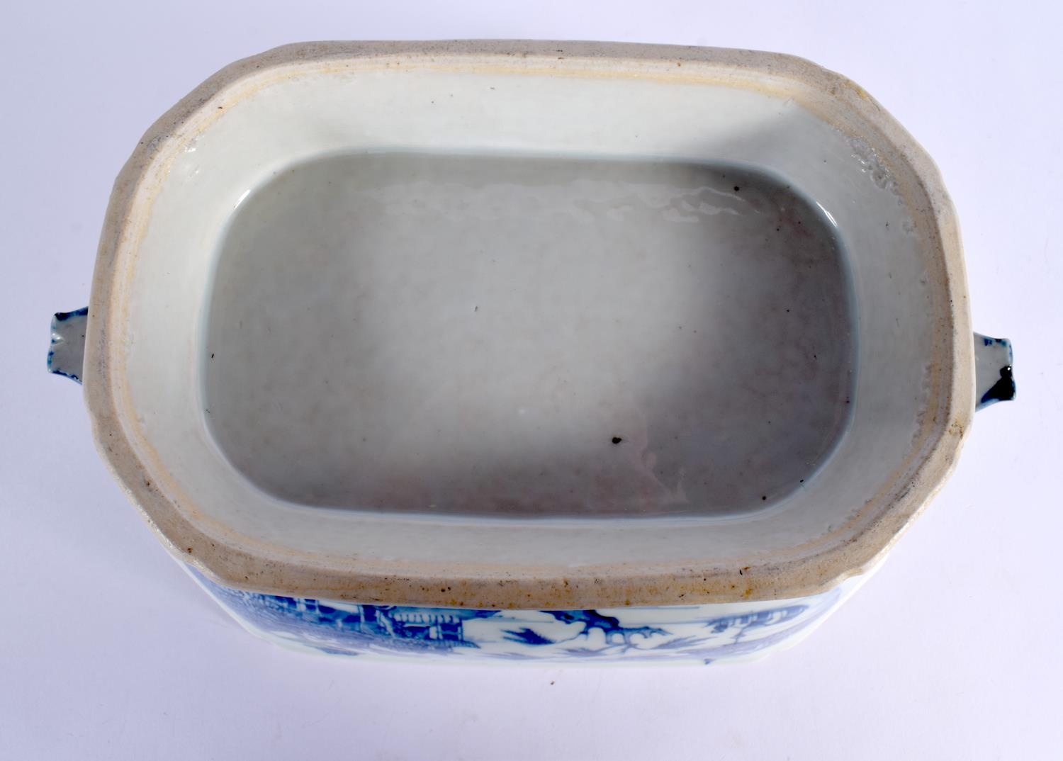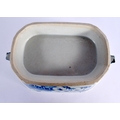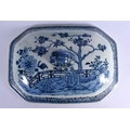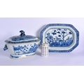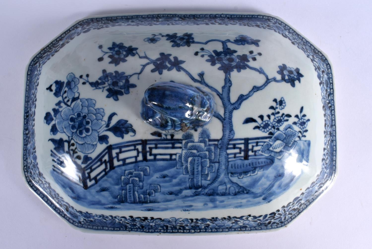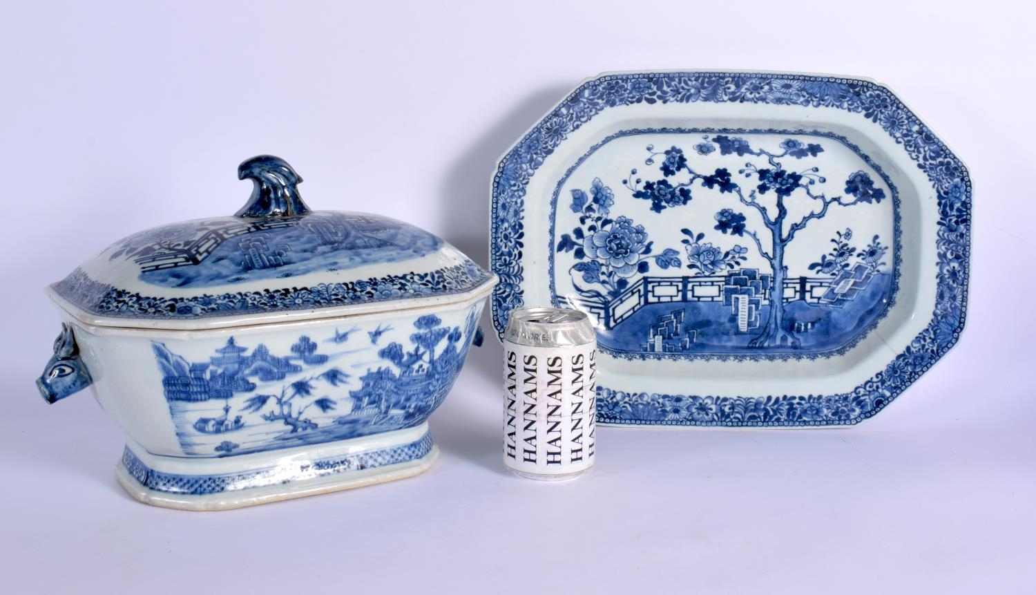 A GOOD LARGE 18TH CENTURY CHINESE BLUE AND WHITE EXPORT TUREEN AND COVER with matching stand. 38 cm x 26 cm overall. (2)