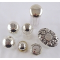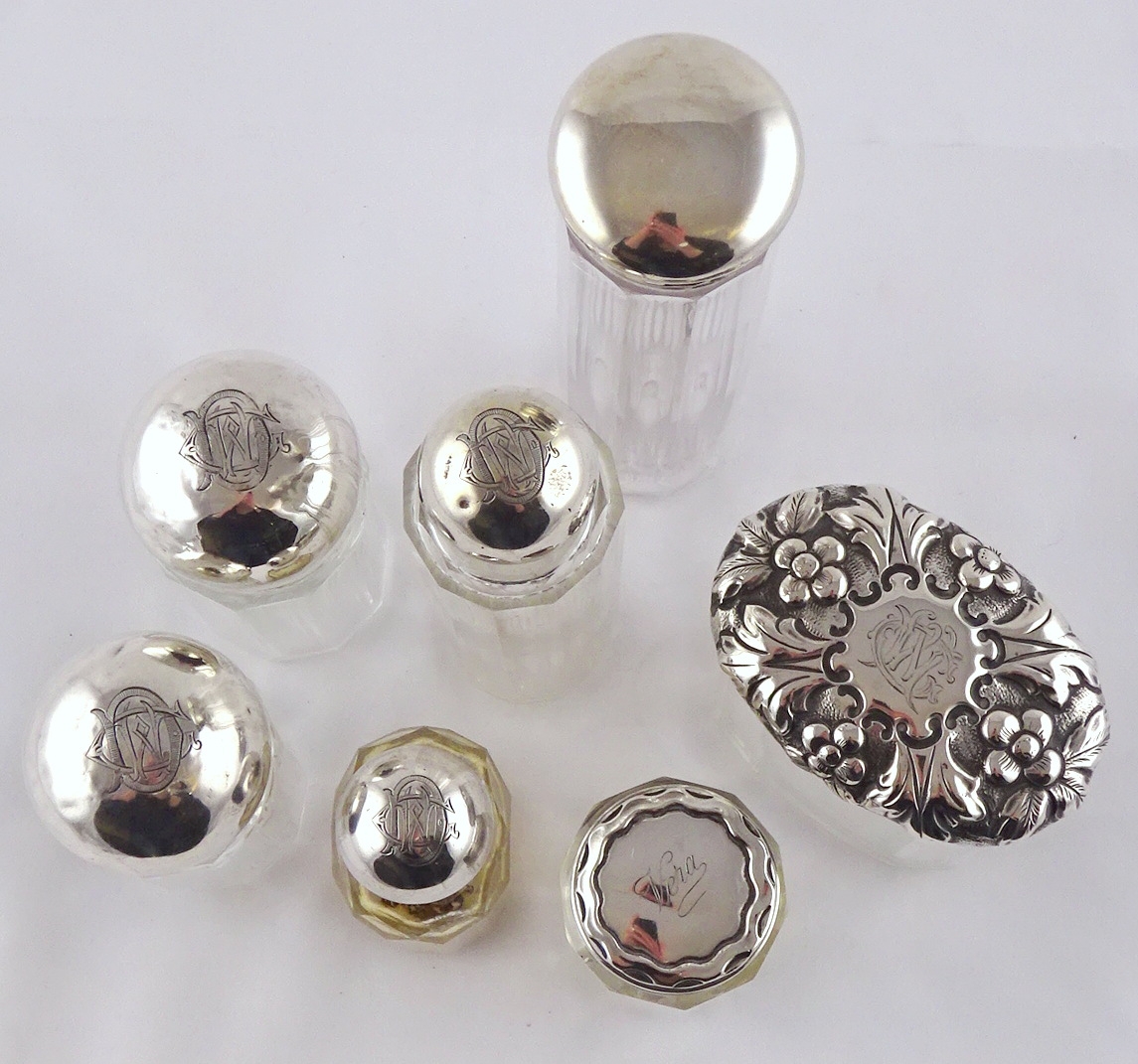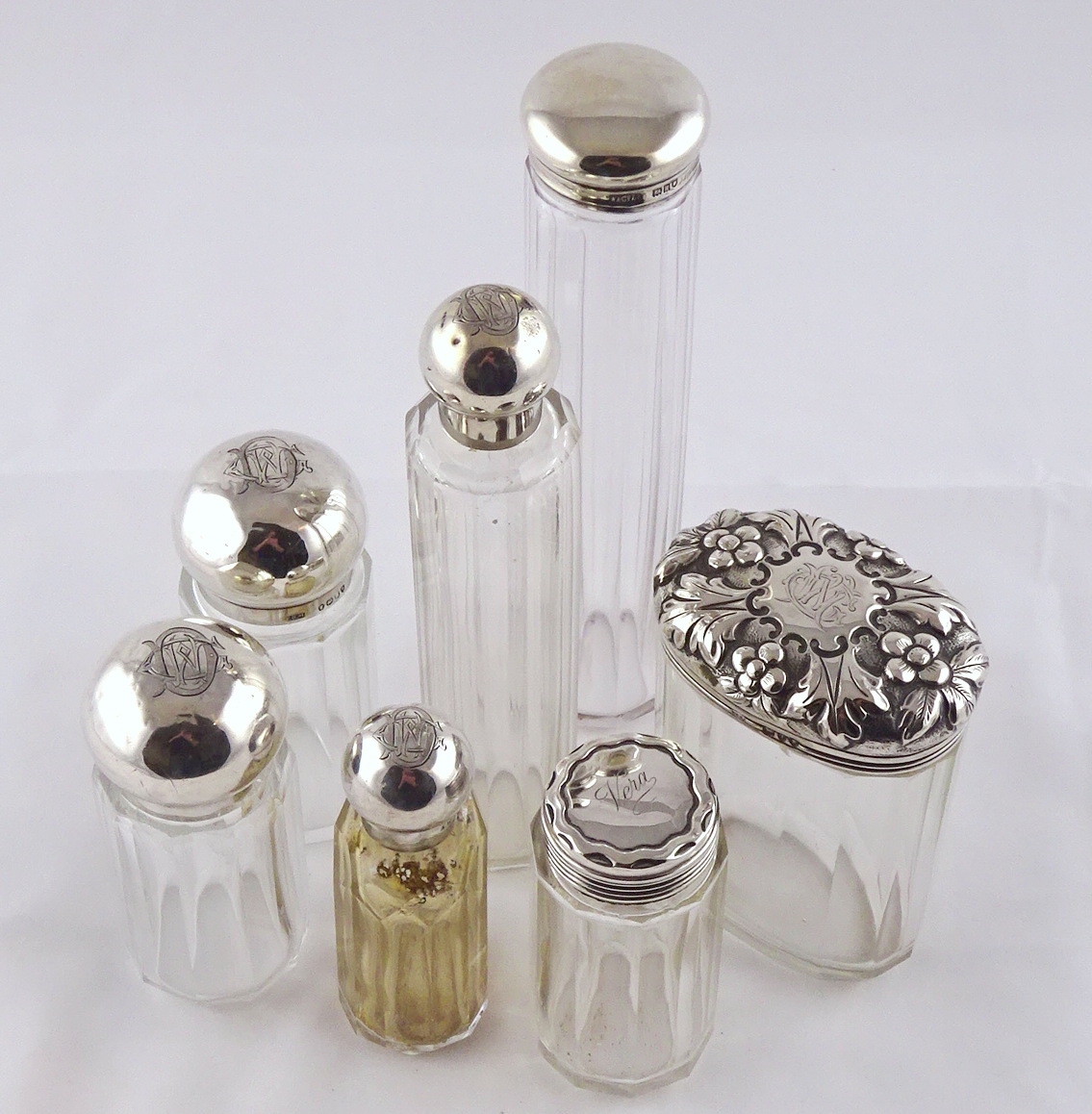 Seven various silver topped glass dressing set flasks. Tallest 185mm (by instruction of the family of Dame Fanny Waterman)