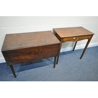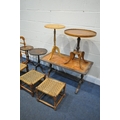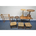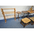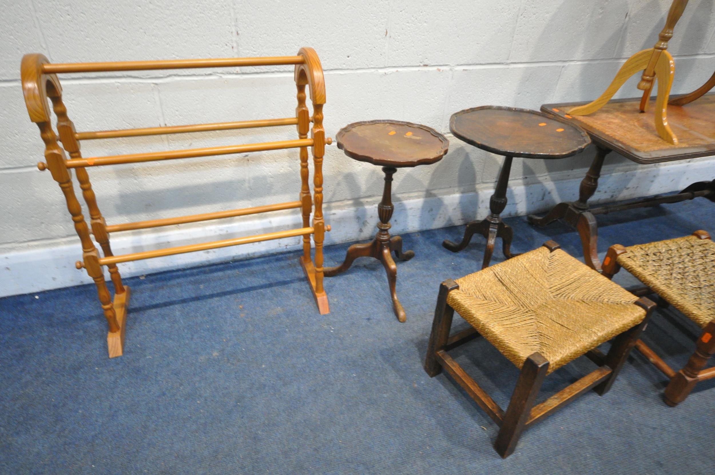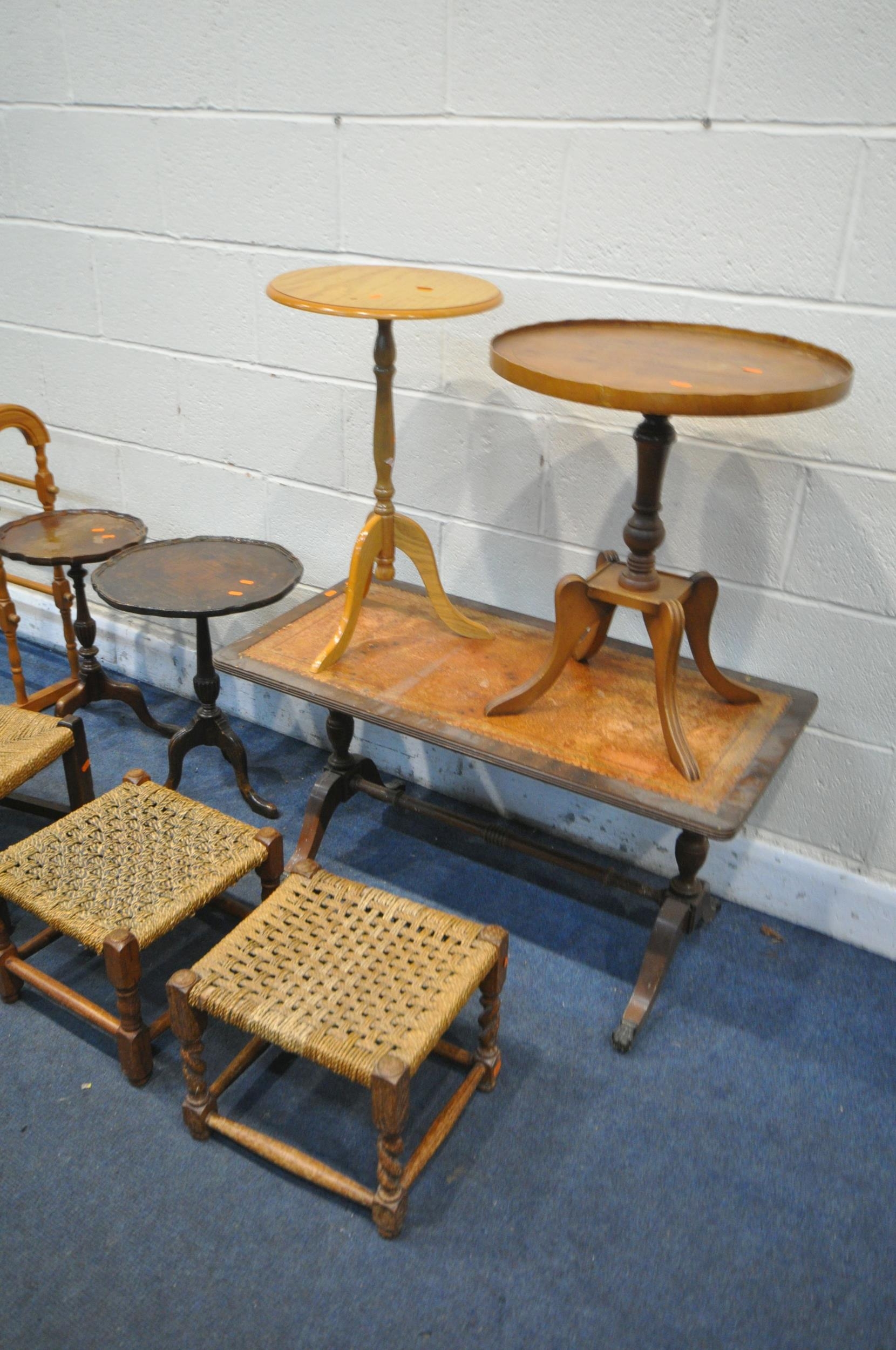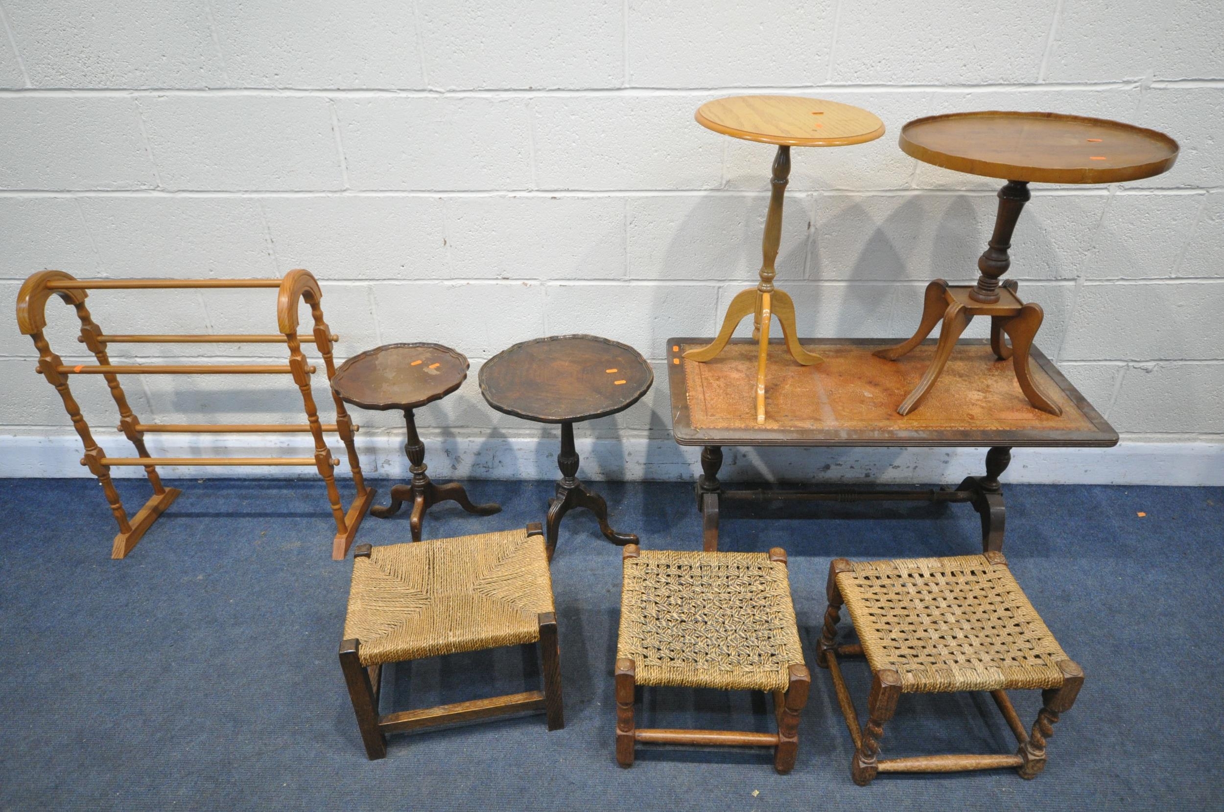 A SELECTION OF OCCASIONAL FURNITURE, to include four wine tables, leather top coffee table, three rush footstools, and a pine towel rail (condition report: -distressed coffee table top) (9)