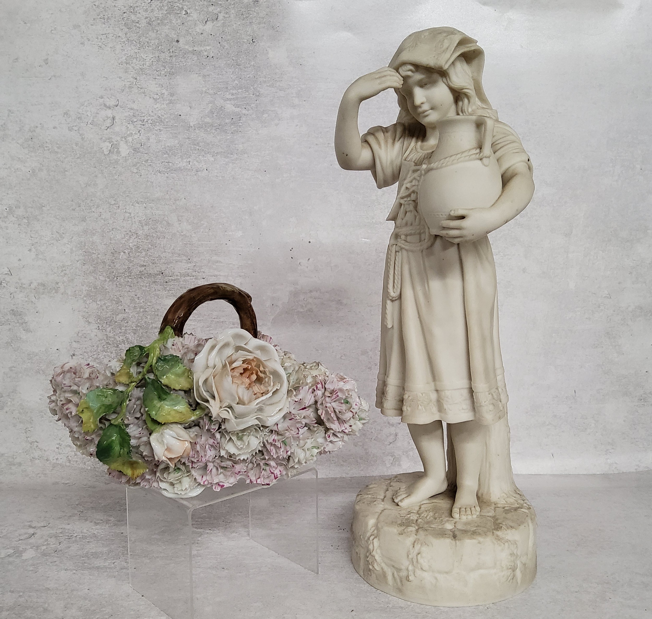 A Robinson & Leadbeater Parian ware figure of a young female water carrier; a continental ceramic flower encrusted basket, the handle in the form of a branch