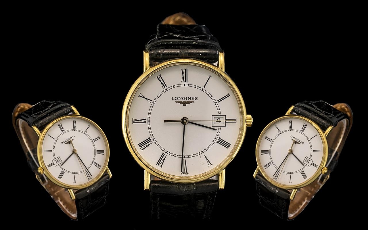 Longines Gentleman's 18ct Gold Automatic Wrist Watch with date display swing seconds feature and white dial. With original attached black leather Longines strap. Serial no 37957810. All aspects of condition excellent. Working at time of Cataloging.