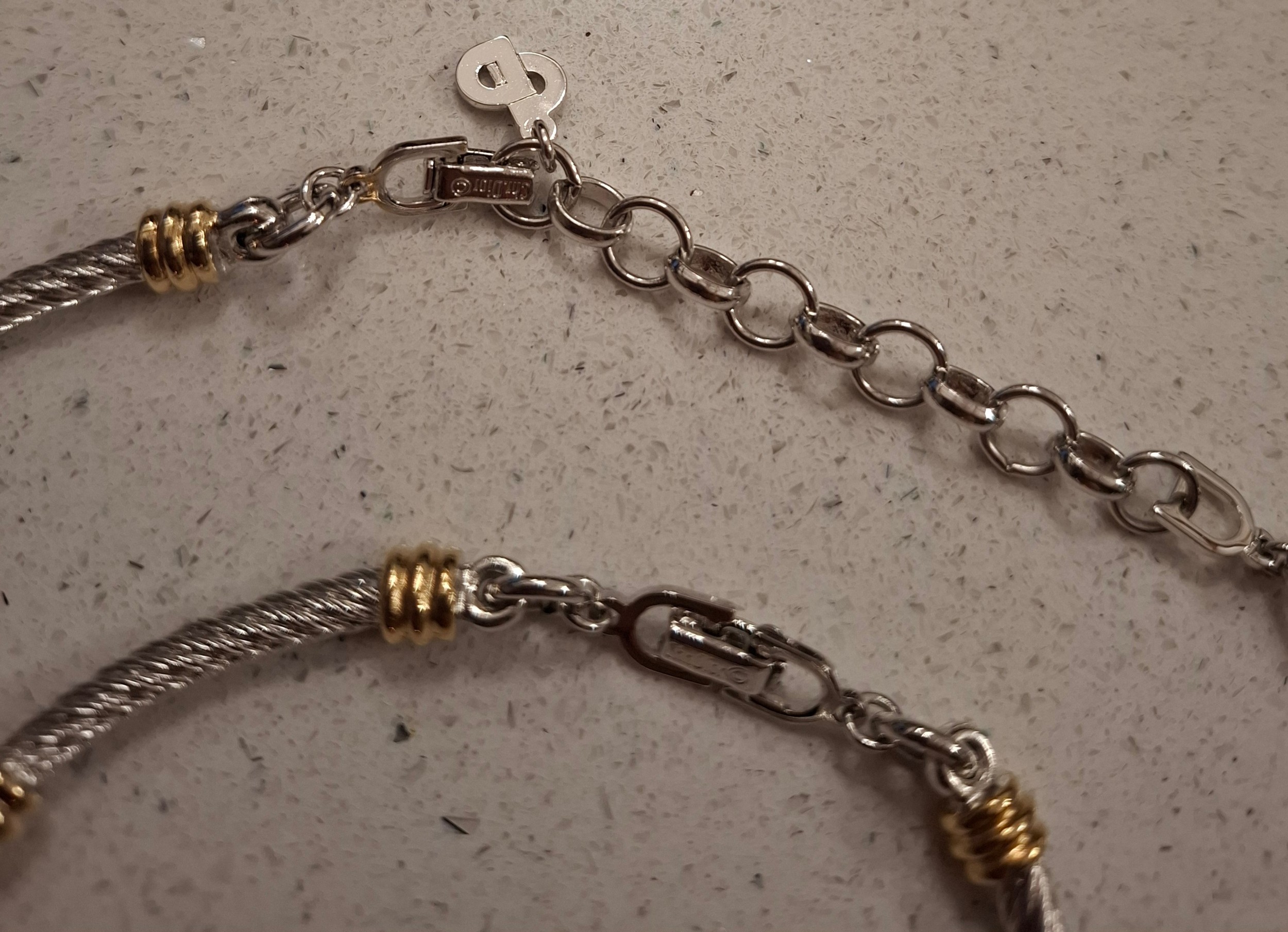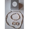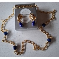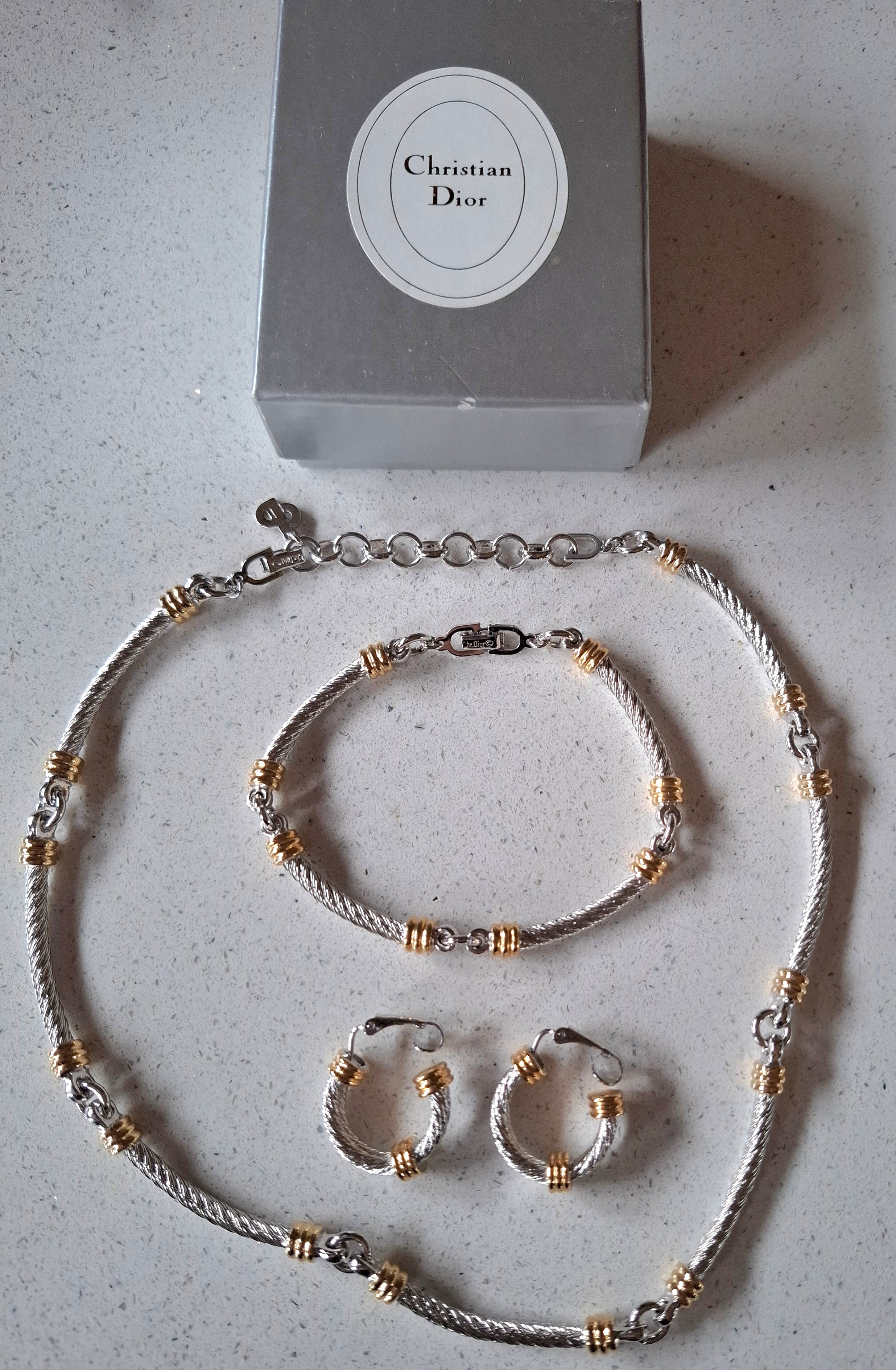 Christian Dior- A two-tone jewellery suite comprising a fancy link necklace, bracelet and hoop clip-on earrings having a CD pendant to the clasp of the necklace (branded box not included). Location: cab 1