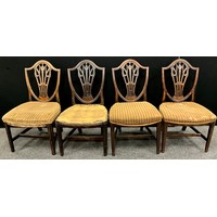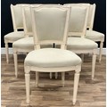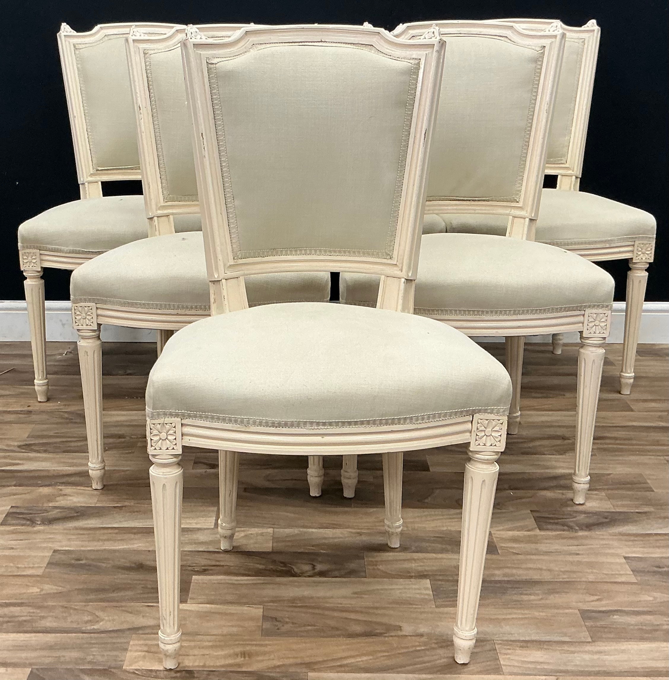 A set of six Louis XVl style, white with off white fabric, tapering legs, 89cm high, 49.5cm wide, 38.5cm seat depth