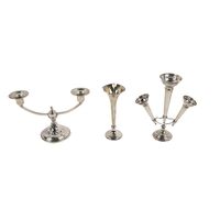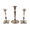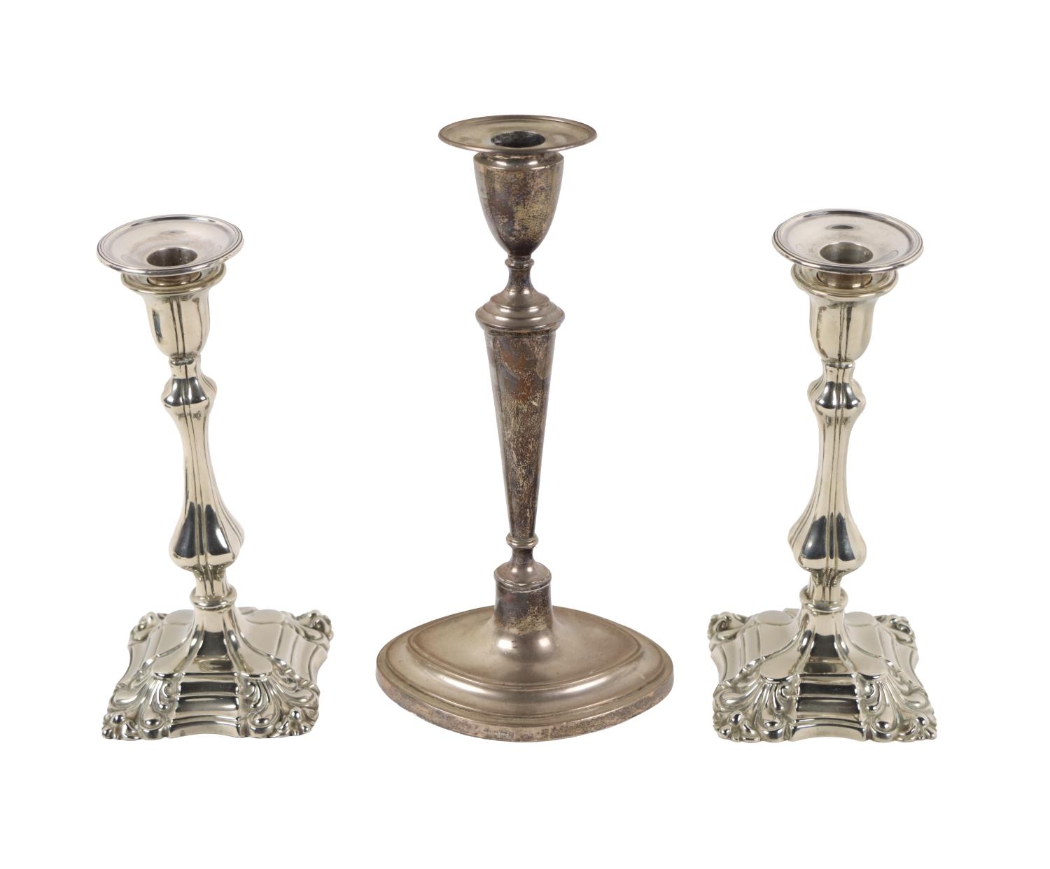 A pair of English Georgian Sheffield silver mounted Candlesticks, (with associated silver sconces, hallmarked), each approx. 26cms high; also a Georgian style silver Candlestick, Sheffield by T.A. Scott, 1910, approx. 30cms high. (3)