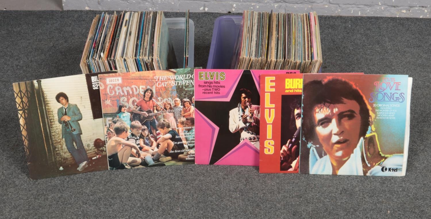 Two boxes of vinyl long play record albums & 45 rpm's. Billy Joel, Cat Steven's, Classic Rock examples