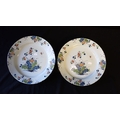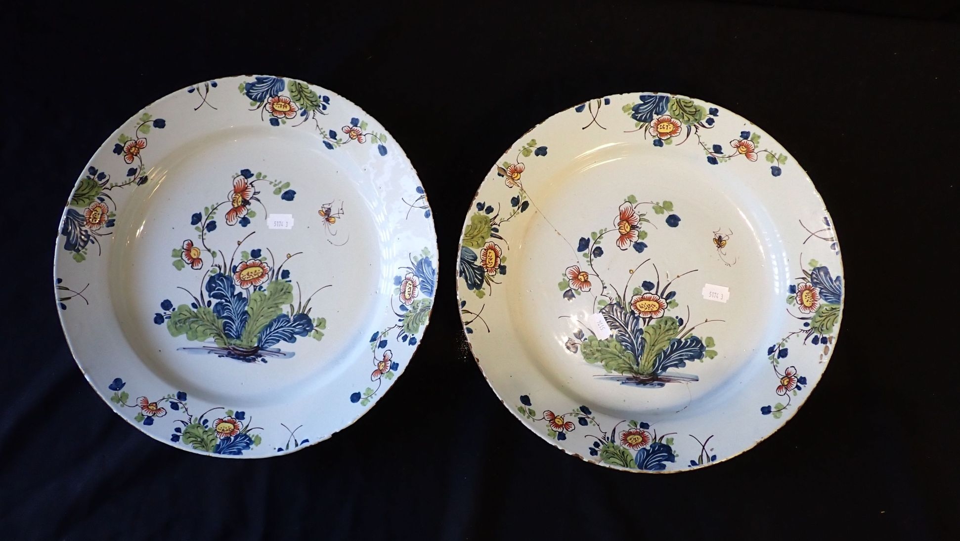 A PAIR OF 18TH CENTURY POLYCHROME DELFTWARE CHARGERS floral decoration, 34 cms diam, one A/F