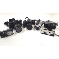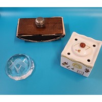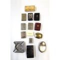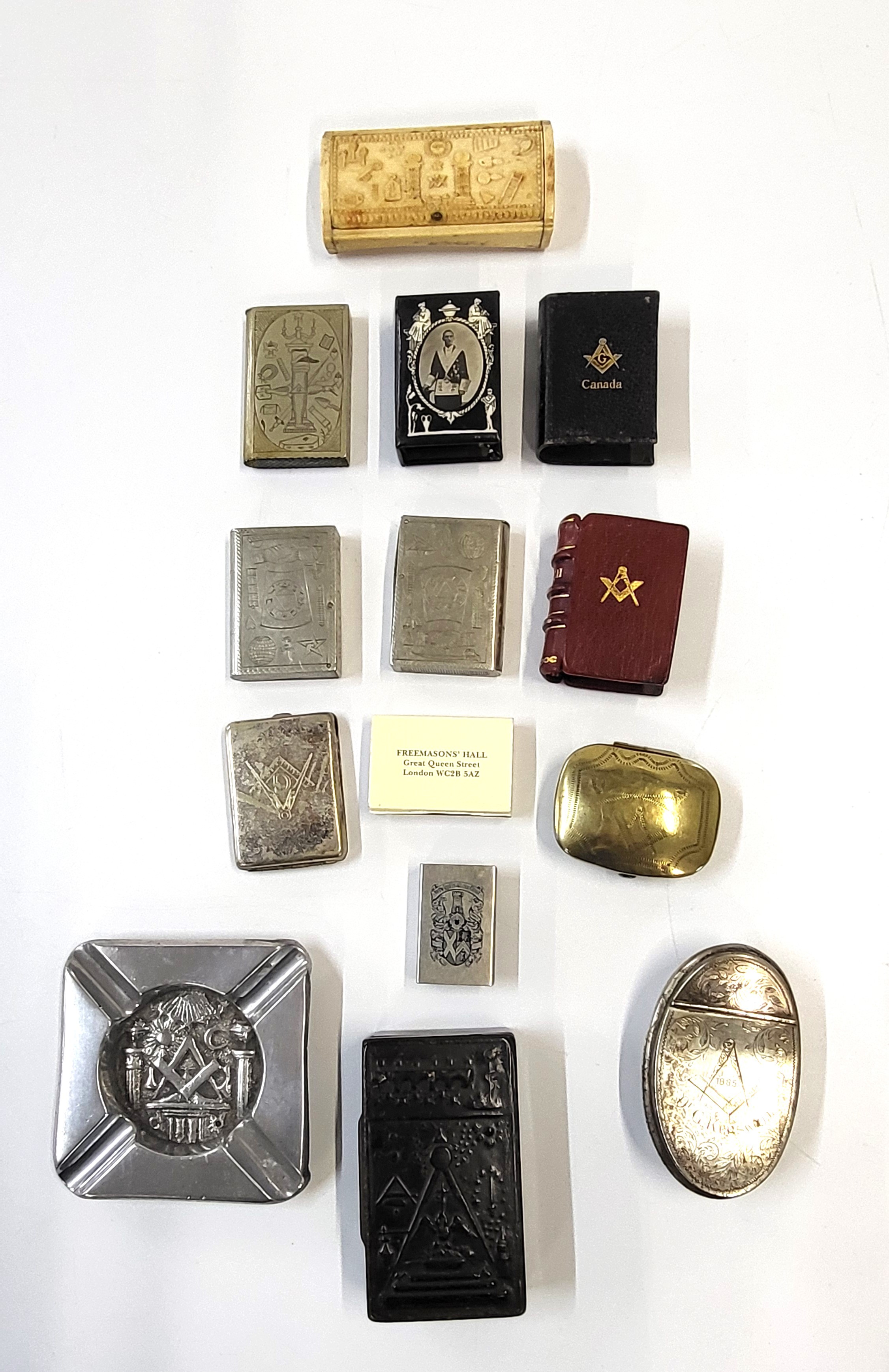Fourteen items of Masonic smoking related items including an ashtray, three vesta cases, two matchboxes, three snuff boxes, and four matchbox covers. All in a carved box.