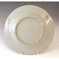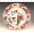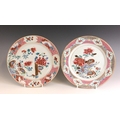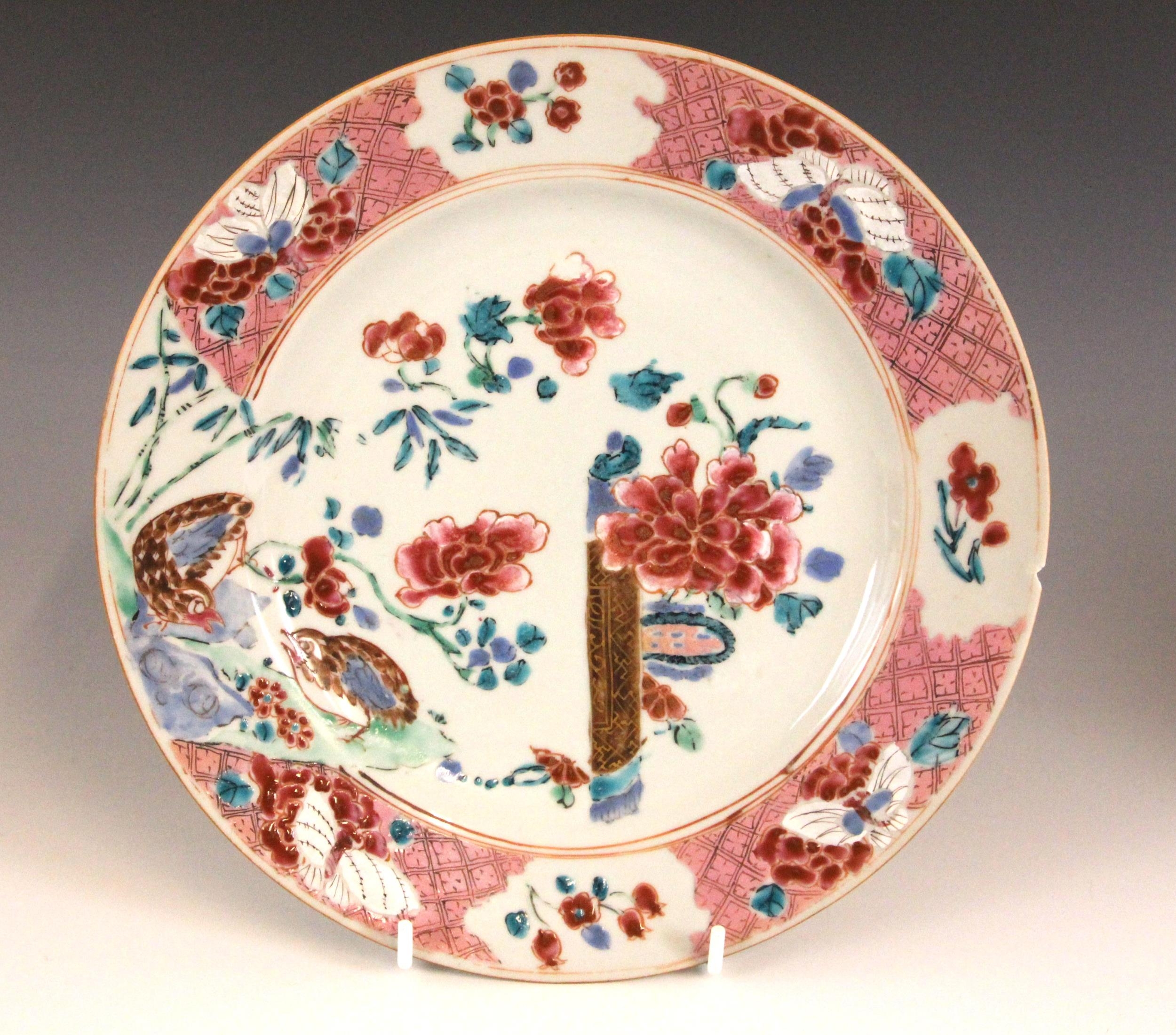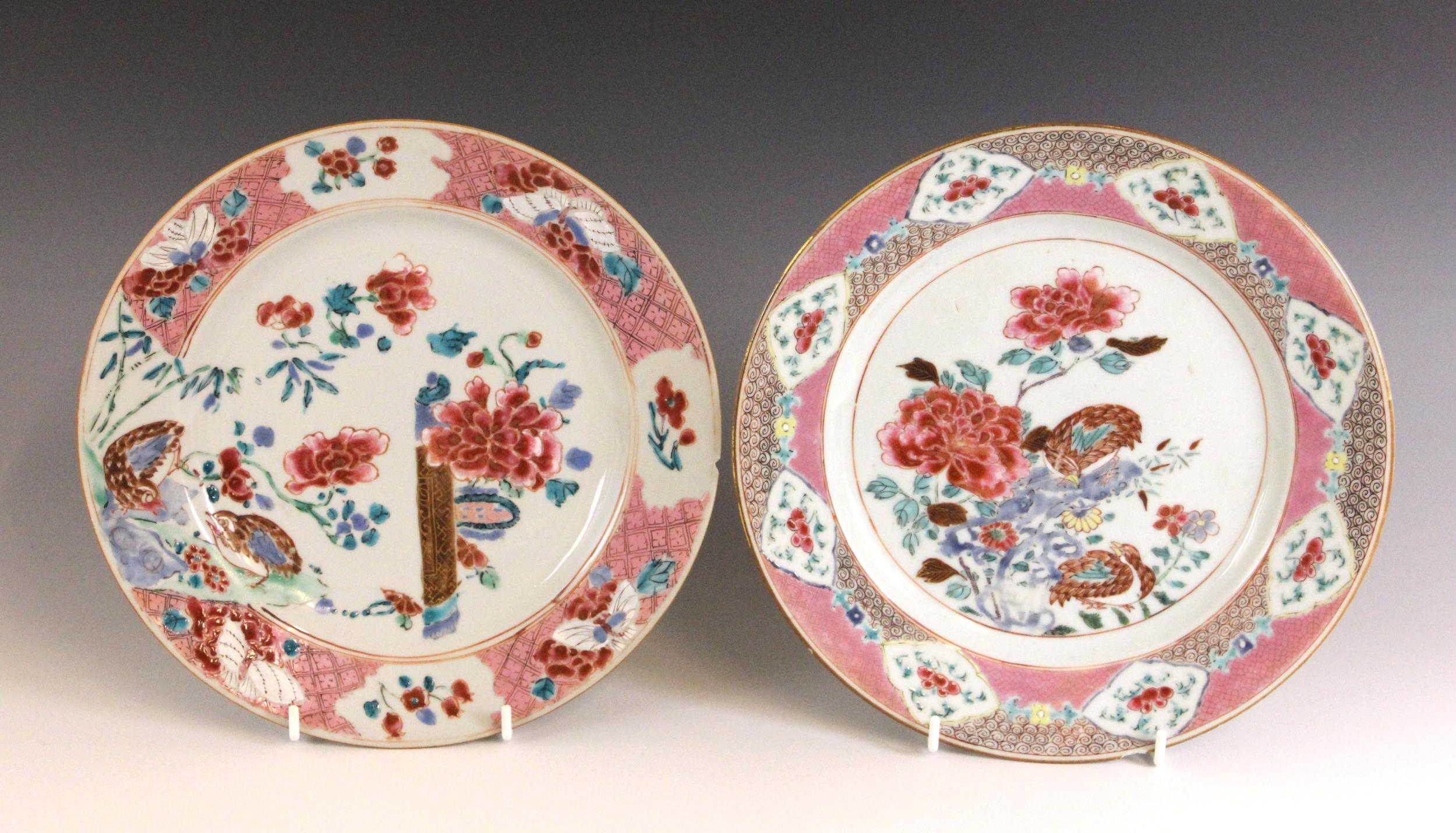 A near pair of Chinese porcelain famille rose 'Quail' plates, 18th century, each shallow circular plated decorated with two quail and peony sprays, with a geometric border, 22.5cm and 22.7cm diameter (2)