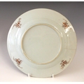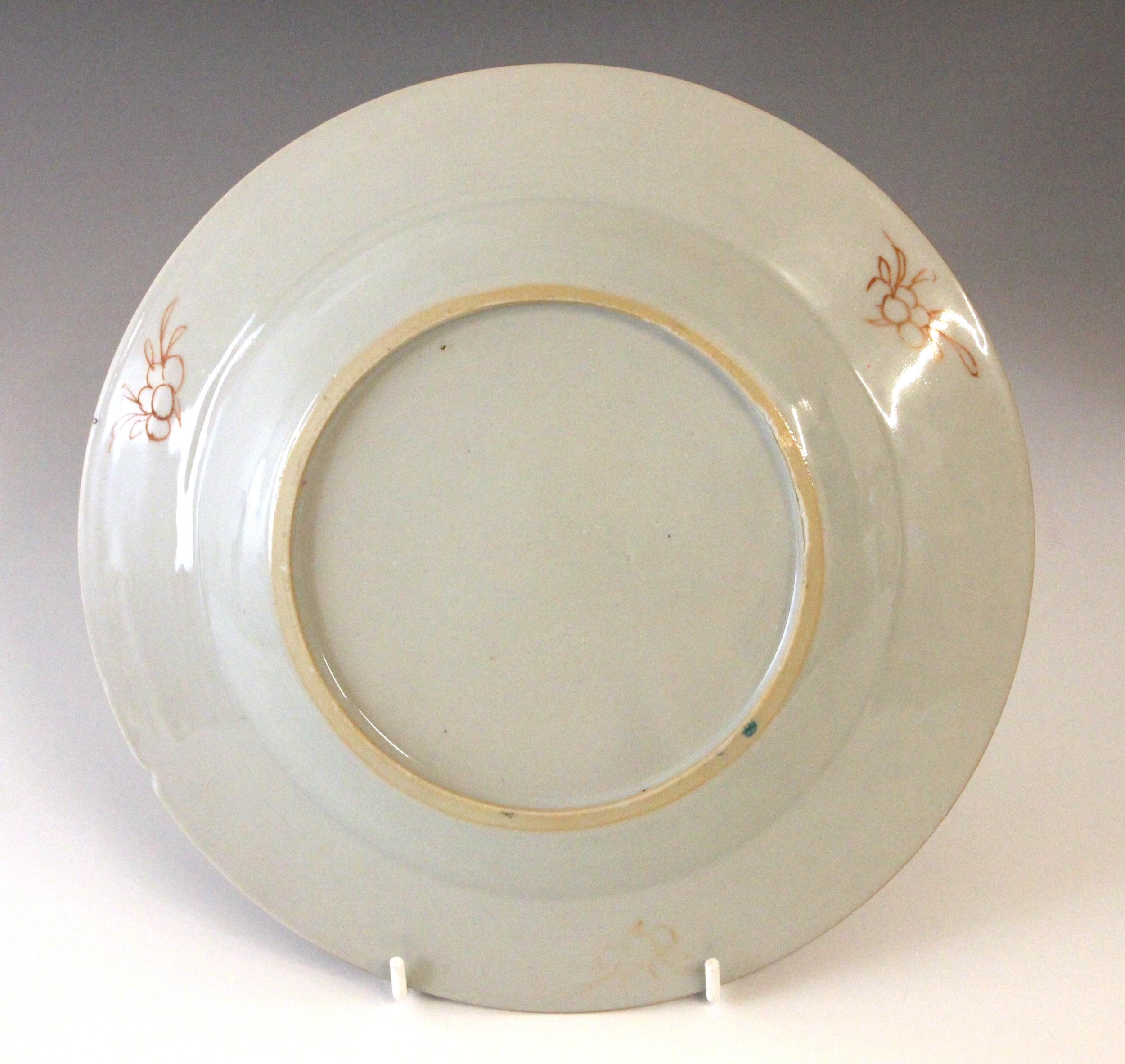 Each plate with small chips to the rim. One plate with stained rim descending hairline crack, the other with a clear hairline crack. Pitting to each plate present. Some signs of surface and decoration wear.