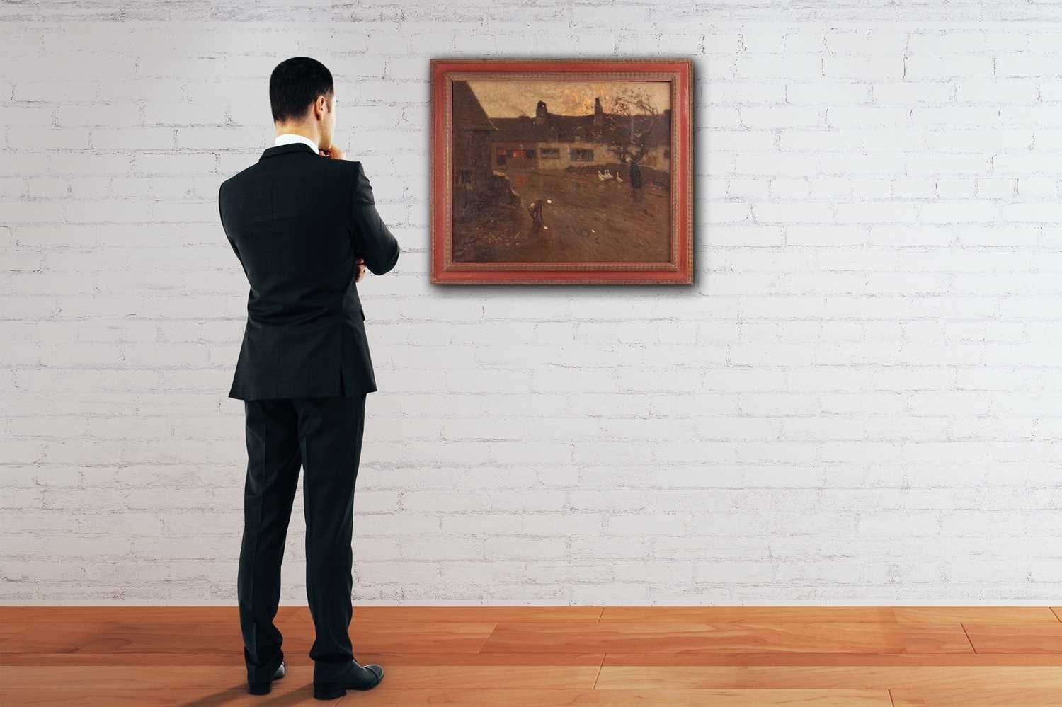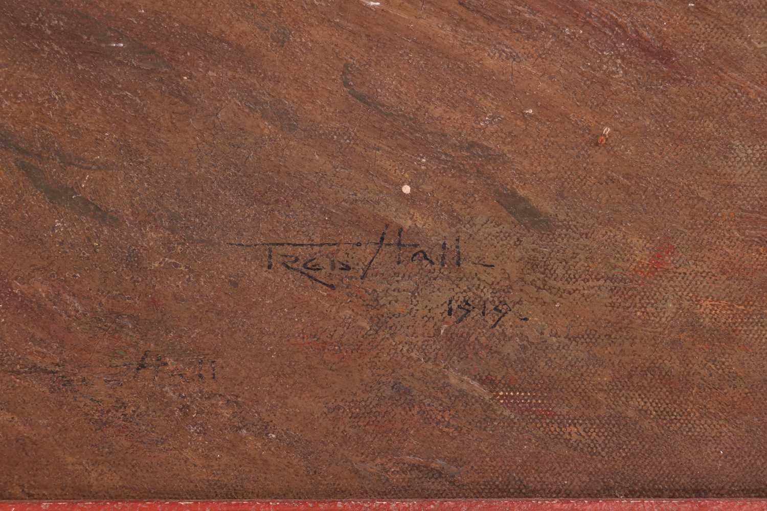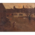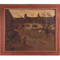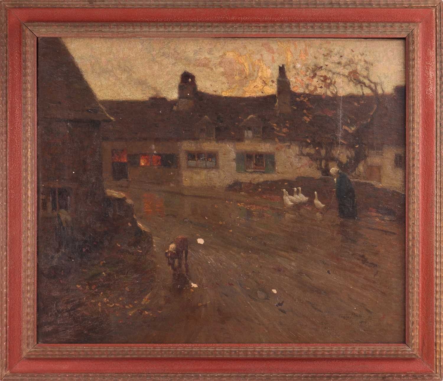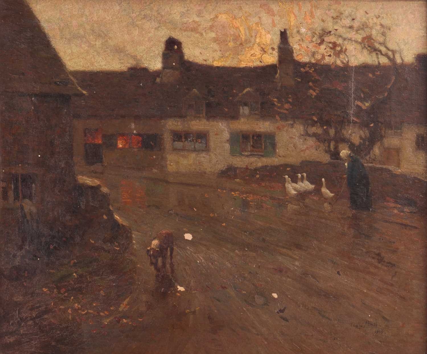 Frederick Hall (British 1860-1948) Driving Geese Down a Village Lane signed and dated 'Fred Hall 1919' (lower right) oil on canvas 51 x 61 cm, framed 62.5 x 72.5 cm The canvas has not been lined. There are several areas of loss as can be seen in the catalogue illustration, including two areas of loss, lower centre, that have been touched up.The painting is dirty and will benefit from a clean. There is a 16cm vertical scratch visible upper right. Areas of thicker paint in the sky and cottage walls appear raised. Scattered craquelure is visible throughout. There is a bloom to the varnish in the darker areas on the left of the composition and also some abrasion to the surface, far left. UV light reveals scattered small areas of retouching throughout.