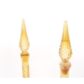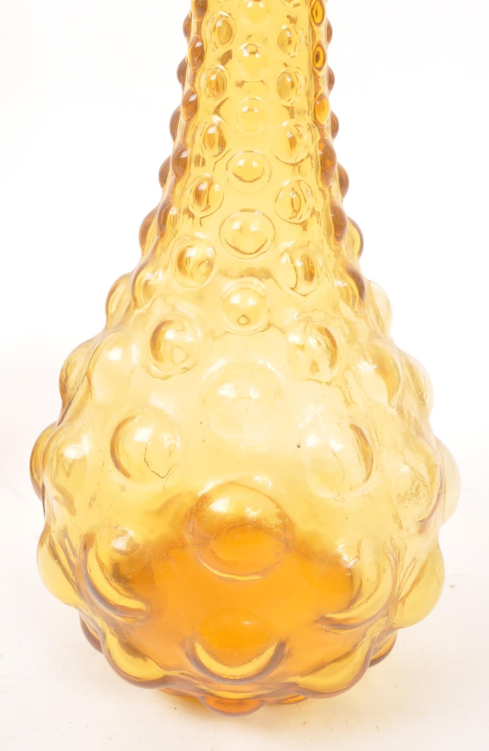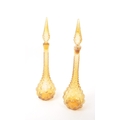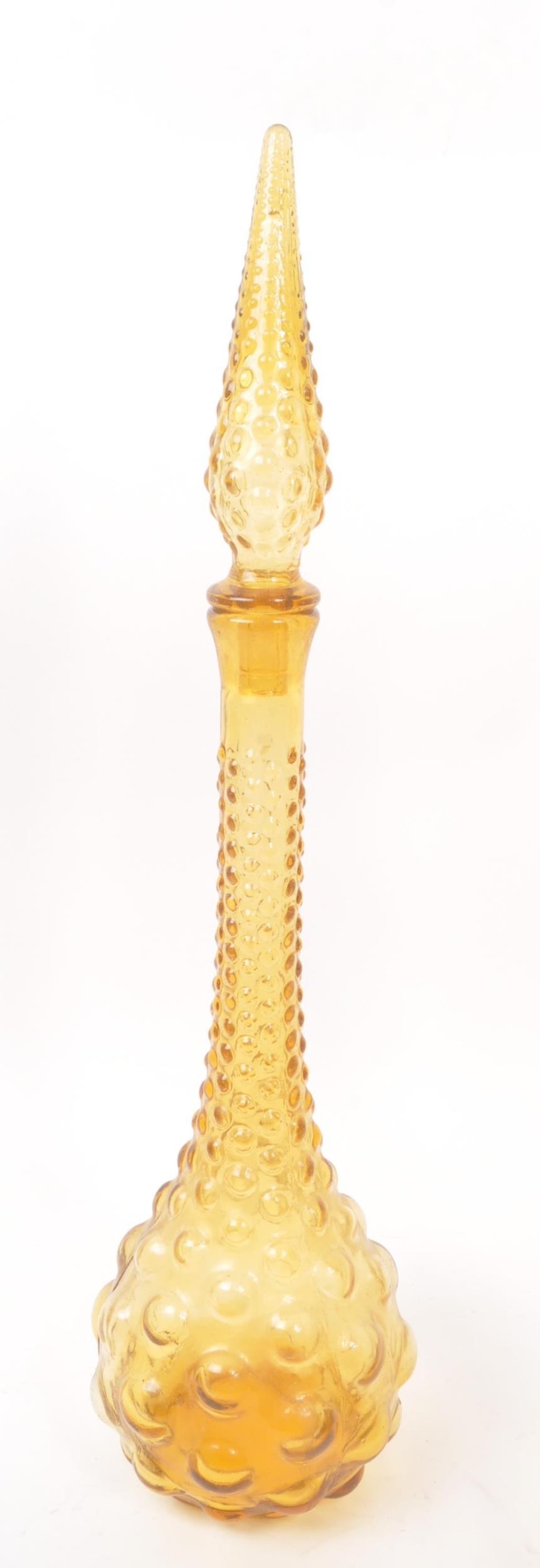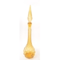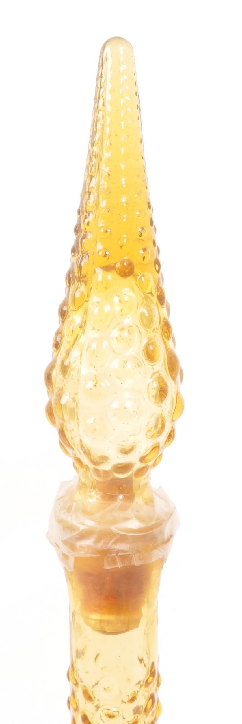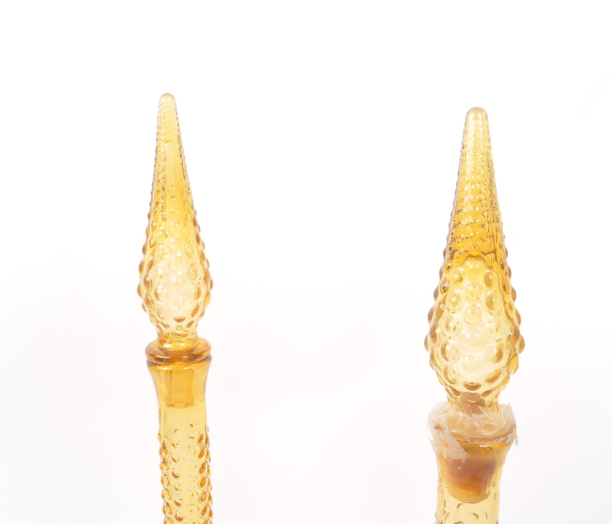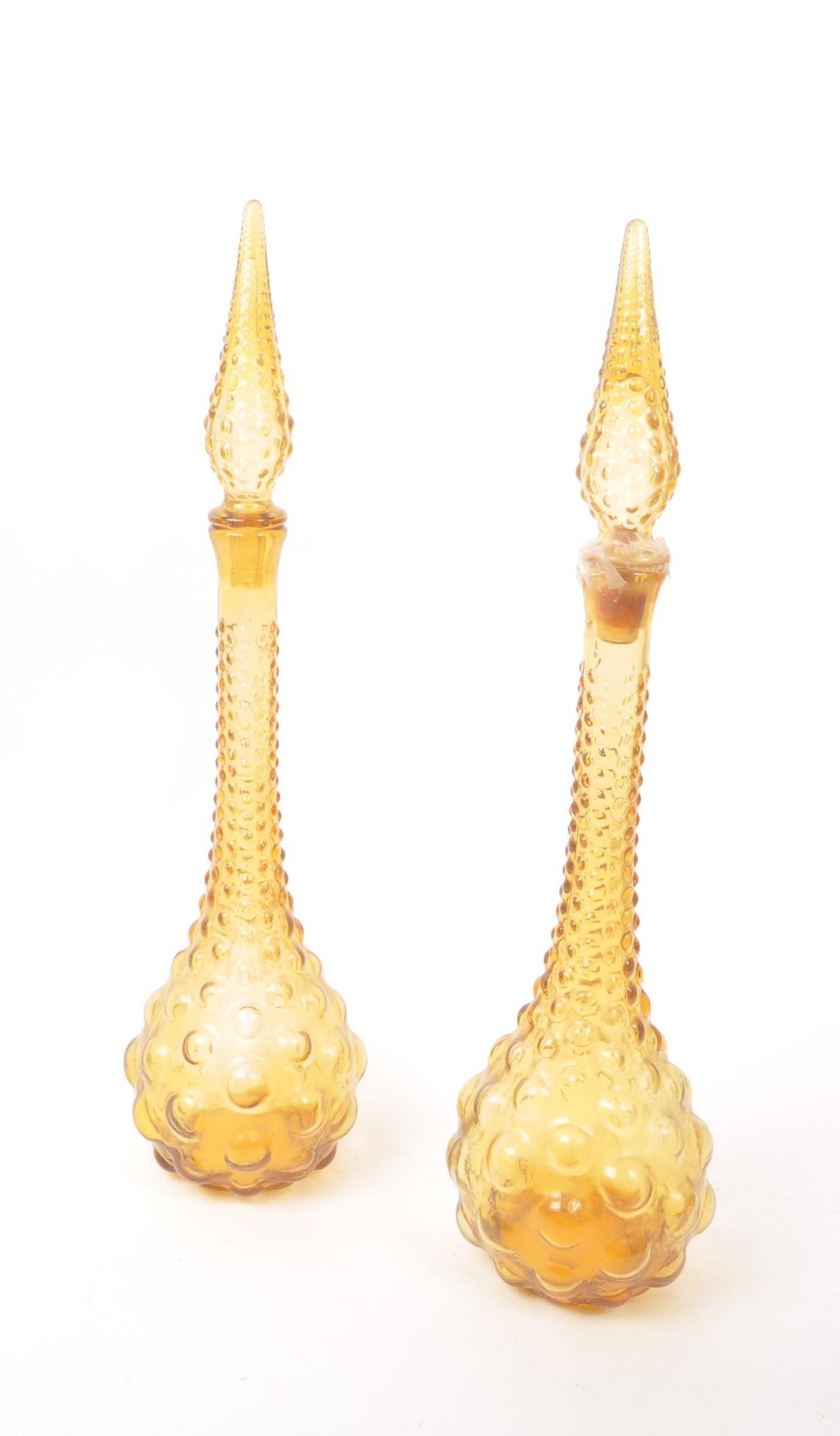 Genie Bottles - A pair of retro Italian Empoli studio art glass bottle / decanter having a textured bubble glass finish with pointed stopper atop. Finished in orange / amber colourway. Measures approx. 51cm