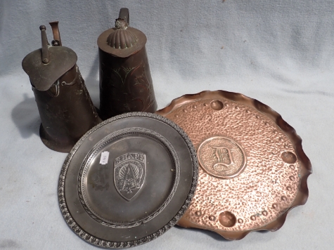 A JOSEPH SANKEY & SONS ART NOUVEAU COPPER HOT WATER JUG an arts and crafts style copper tray, and other metalware, a silver-plated dish stand of lyre form presented as a trophy 'Best Man at Arms 1906, 35cms high, a Hugh Wallis arts and crafts copper tray engraved with a ship, stamped HW,